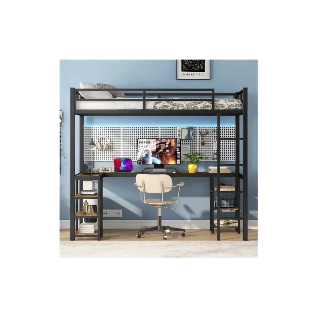 Bellemave Twin Xl Loft Bed Frame With Desk And Storage Shelves, Metal Loft Bed With Ladder And Guardrails, Black
