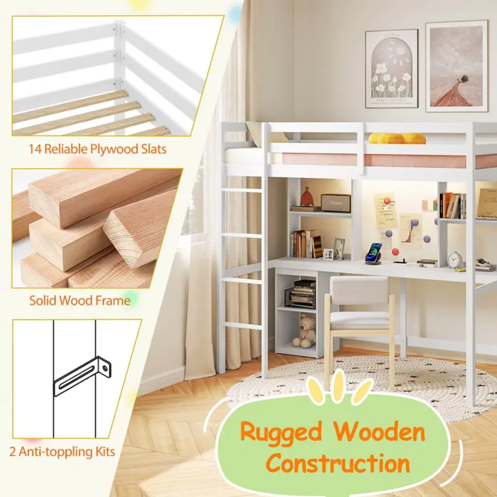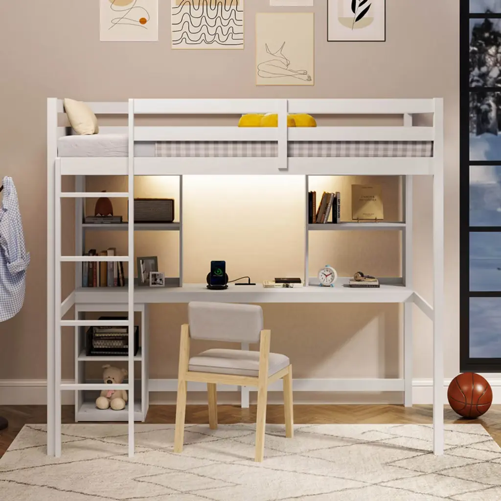 Transform your living space with this twin loft bed with LED light and power outlet! The bright LED light creates a soothing ambiance for relaxation or bedtime reading. Moreover, say goodbye to tangled cords and low batteries with charging station! Featuring a spacious desk storage cabinet and shelves, the loft bed offers a dedicated workspace and ample room for books. Crafted from solid wood with robust plywood slats, this bed is built to last. Equipped with anti-toppling kits and full-length guardrails, it provides extra safety and stability. Besides, accessing the loft area is easy and safe with sturdy ladder. Suitable for homes, dorms, or apartments, this loft bed maximizes the functionality of small areas.FeaturesIntegrated LED light adds a cozy atmosphere to any bedroom Recessed power strip to charge devices directly from your workstation Integrated desk offers a convenient space for studying or working 2 bookcases and removable storage cabinet ensure a clutter-free room 14 reliable plywood slats provide sturdy support for your mattress Solid wood frame ensures stability for a restful night's sleep 2 anti-toppling kits secure the loft bed to the wall firmly Ample under-bed space keeps your room tidy and organized Integrated ladder makes it easy to climb to the upper bed Full-length guardrails provide added protection for your children Note: The ladder is fixed on the side of the bed Assembly neededColor: White Material: Plywood, Pine Wood, Engineered Wood Overall Dimensions: 79.5" x 44" x 72"(L x W x H) Dimensions of Desk: 77 x 14" x 29"(L x W x H) Height of Guardrails: 12" Height of Under-bed Space: 56.5" 2 Outlets: 120V/12A 1 USB Port & 1 Type-C: 5V, 2.1A Power Cord: 10 ft Recommended Mattress Thickness: 6" Net Weight: 153 lbs Weight Capacity of Bed: 250 lbs Weight Capacity of Desk: 90 lbs Weight Capacity of Each Shelf: 50 lbs Weight Capacity of Cabinet: 50 lbs Package Includes: 1 x Loft Bed 1 x Instruction