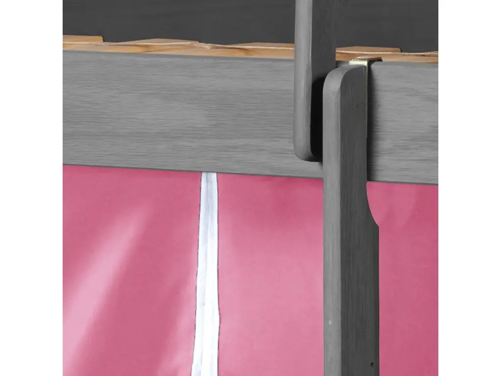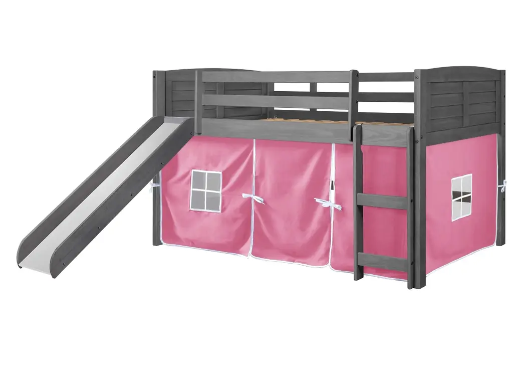 Transform your child's room into an enchanting hideaway with the Donco Kids Louver Low Loft in Antique gray Finish. This delightful bed redefines small spaces, offering ample room underneath for storage or play. The timeless louvered design adds charm, creating a warm and inviting atmosphere for your little one. The added pink tent fabric creates a whimsical play area or conceals treasures, sparking imagination. But the real magic lies in the slide each morning is a thrilling adventure as your child slides into a new day. Give your child a haven where dreams come true and play knows no bounds.