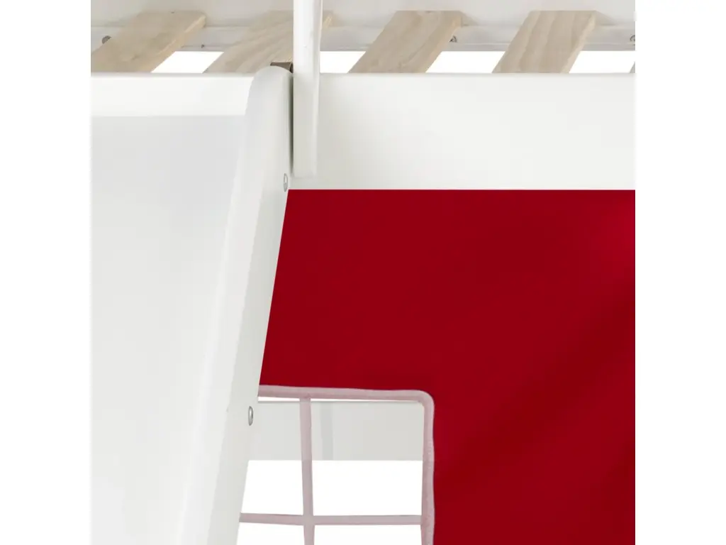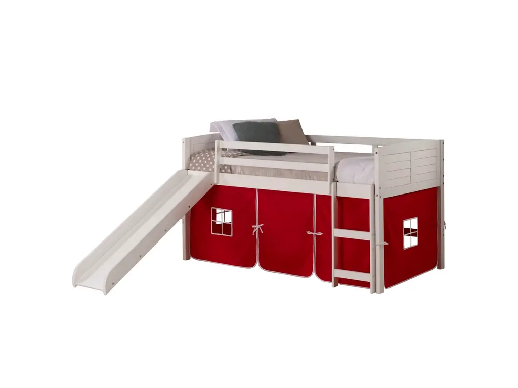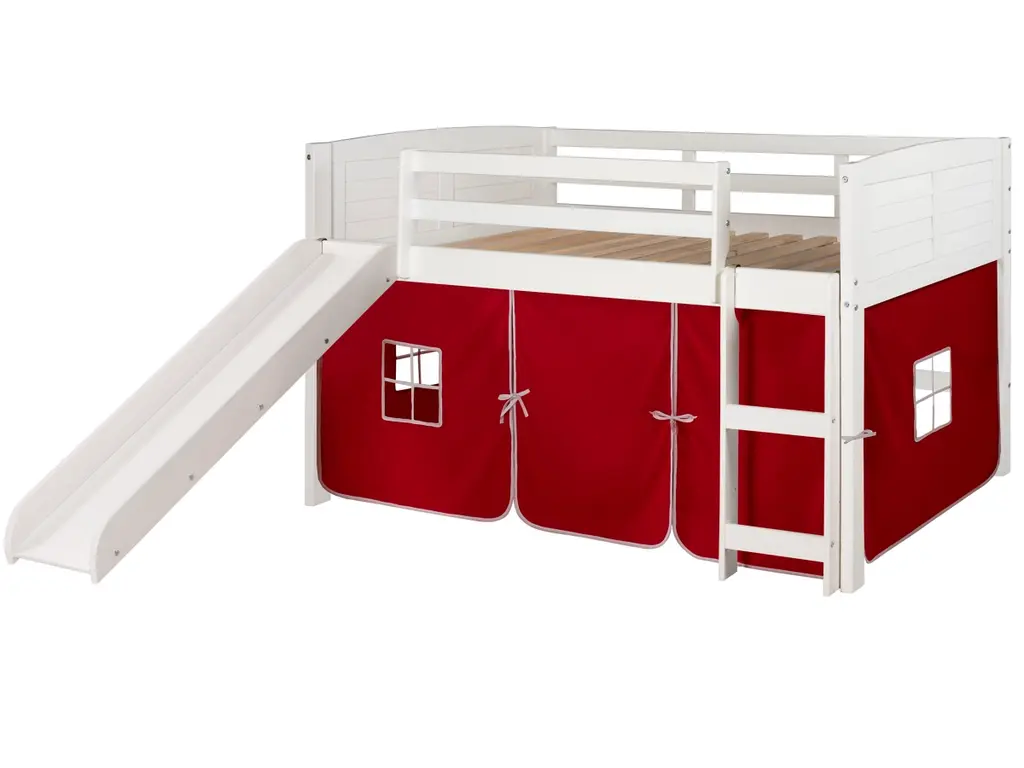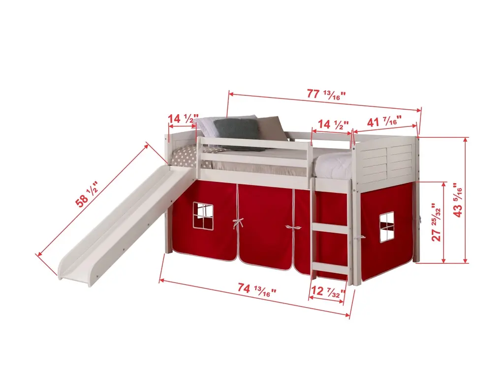 Introducing our Twin Louver Low Loft White with Red Tent & Slide. Crafted with love, this louvered low loft bed is not just furniture; it is an invitation to endless imagination. Watch as your child's room transforms into a haven of creativity, with ample space for storage or imaginative play beneath. The timeless louvered design infuses cool elegance, setting the stage for unforgettable childhood memories. The vibrant red tent fabric sparks joy, whether it is a secret hideaway or a storage hideout. Every morning, your little one will wake up excited, ready to slide into a day filled with adventure and wonder.