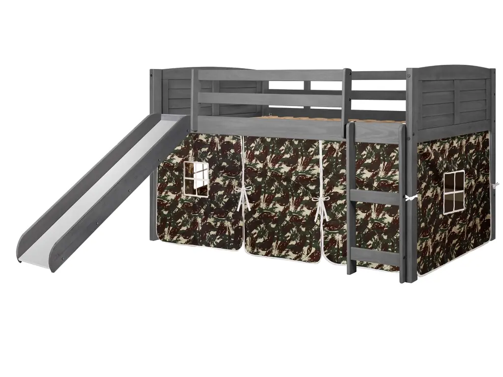 Unveil the magic of space and adventure with our Donco Kids Louver Twin Antique Gray Low Loft Bed, adorned with a thrilling slide and camo tent. Dive into a world where the under-bed area serves as spacious storage or a fun play zone, while the camo tent fabric ignites imagination. Each morning becomes an exhilarating journey with the attached slide, propelling your child into a day of joy and exploration, redefining their space into a haven of endless fun and comfort.