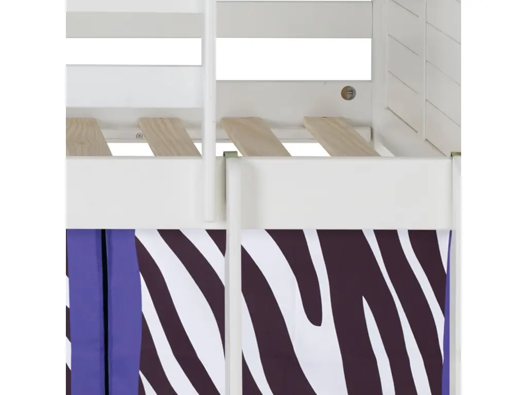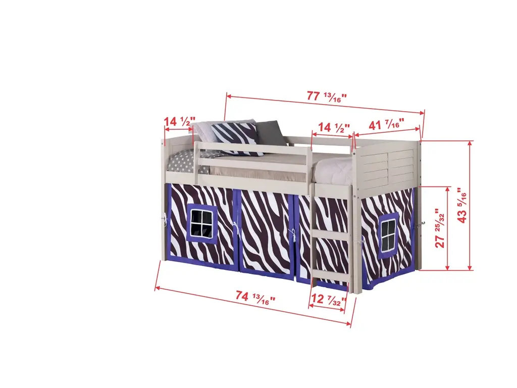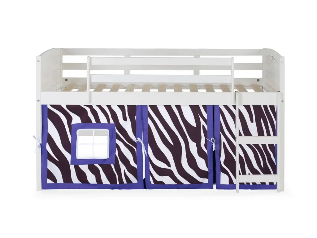 Introducing our Twin Louver Low Loft Bed in pristine white with a touch of whimsy-a heartwarming addition to your child's sanctuary. This enchanting piece transforms even the coziest spaces into an adventure zone, thanks to its spacious under-bed area. The timeless louvered design sets the stage for creativity and warmth, making decorating a breeze. And the playful zebra tent fabric? It's more than storage; it's a haven for dreams and secrets.