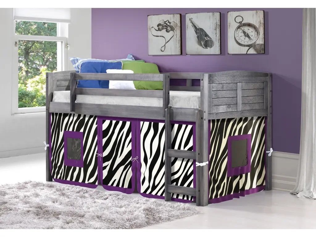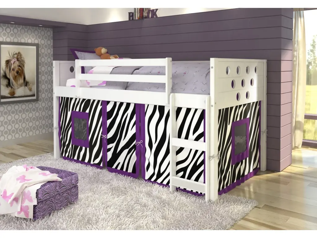 Create the bedroom of their dreams with this circles low loft tent bed with slide. Quality crafted with pine wood for sturdy construction made for years of enjoyment, this loft tent bed offers space-saving convenience, with an open space under the bed that's great for "camping in," play time, toy storage and more.
