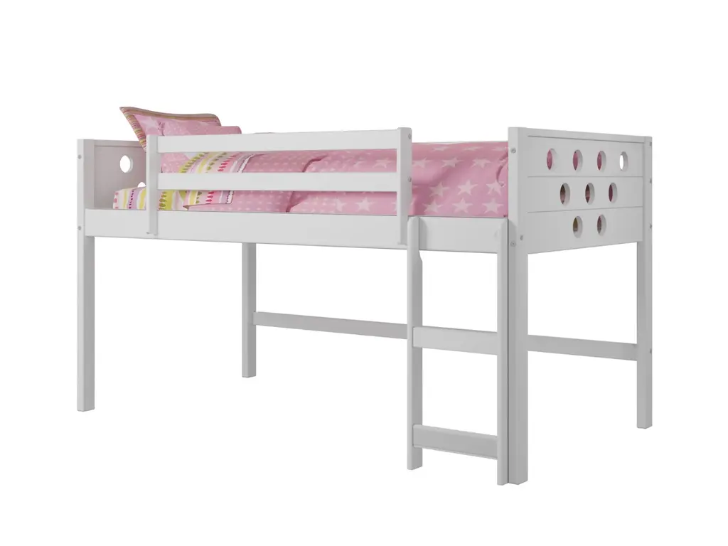 Create the bedroom of their dreams with this twin circles low loft tent bed with slide. Quality crafted with pine wood for sturdy construction made for years of enjoyment, this loft tent bed offers space-saving convenience, with an open space under the bed that's great for "camping in," play time, toy storage and more.