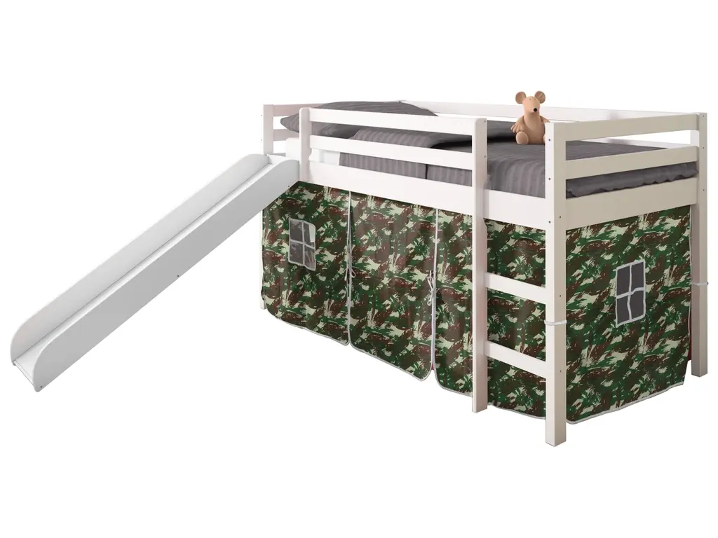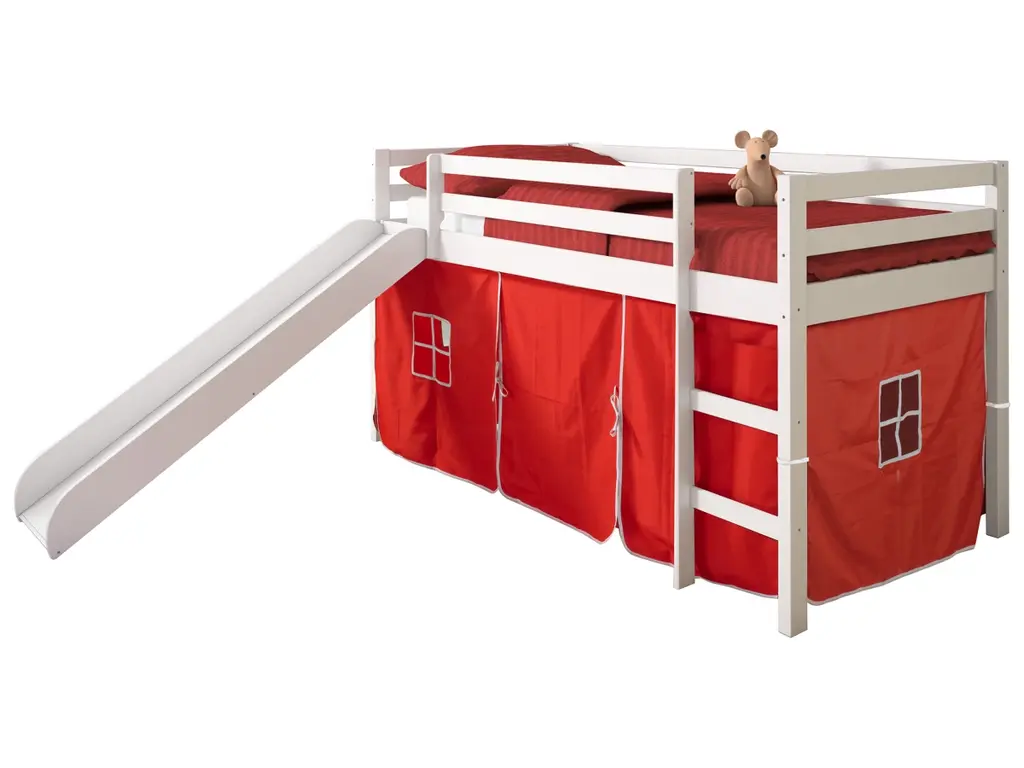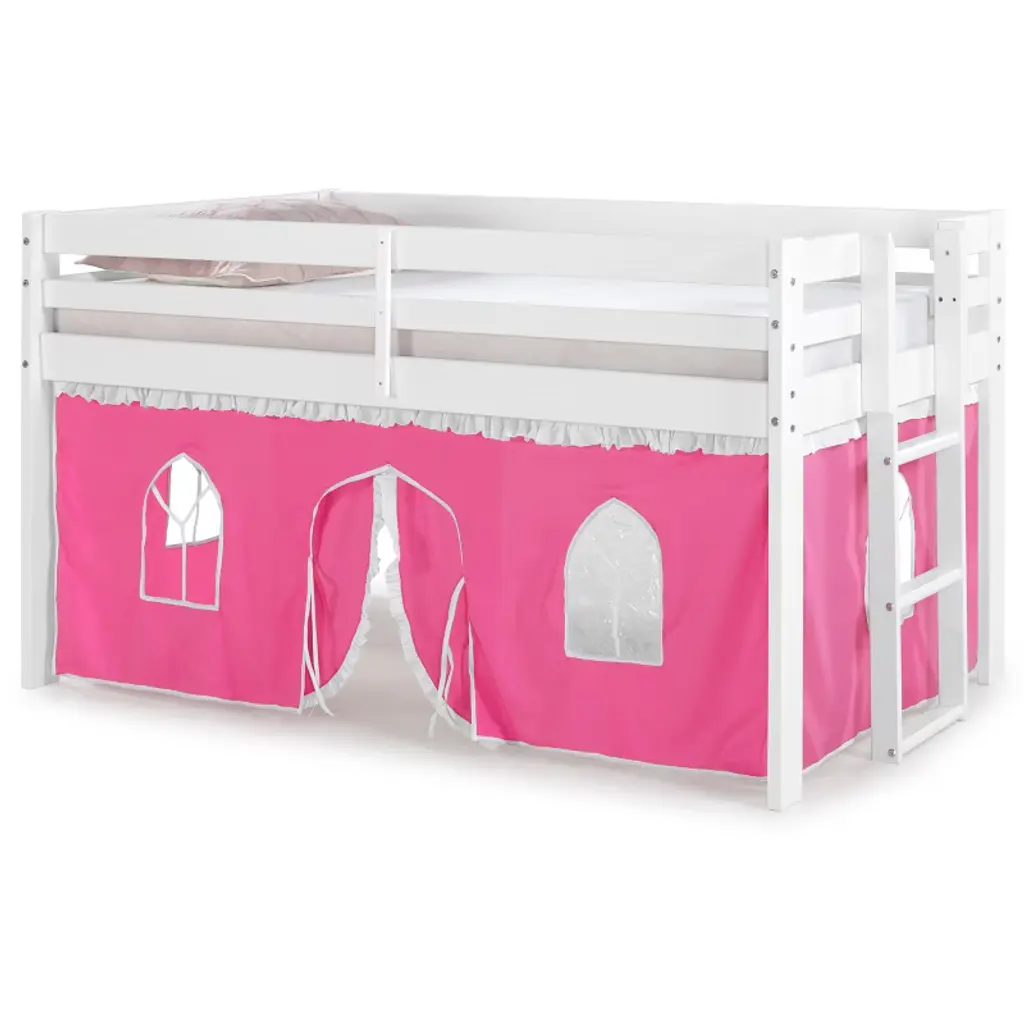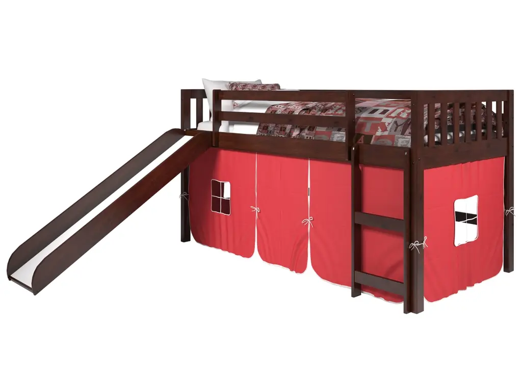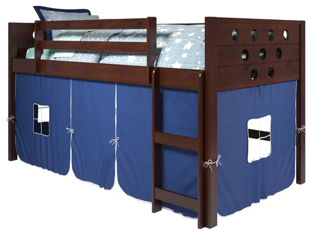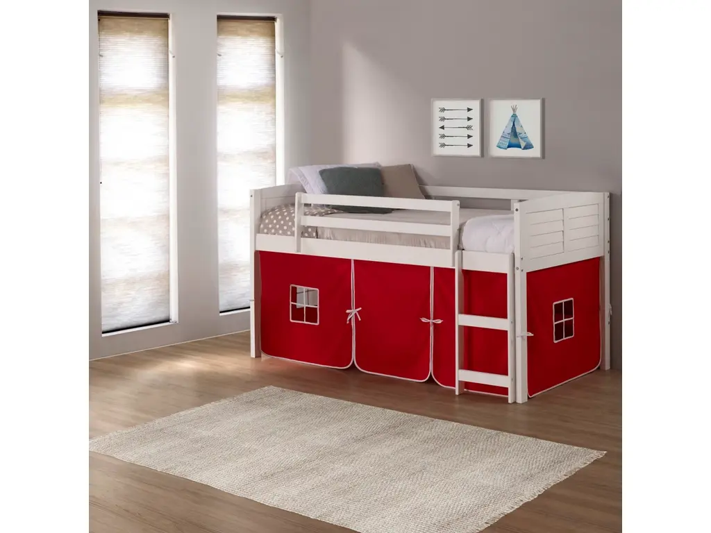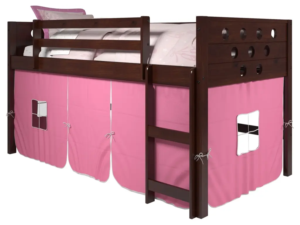 Create the bedroom of their dreams with this twin circles low loft tent bed with slide. Quality crafted with pine wood for sturdy construction made for years of enjoyment, this loft tent bed offers space-saving convenience, with an open space under the bed that's great for "camping in," play time, toy storage and more.