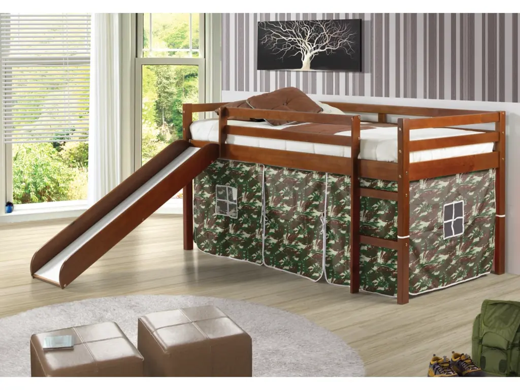 Create the bedroom of their dreams with this twin low loft tent bed with slide. Quality crafted of pine wood for sturdy construction made for years of enjoyment, this loft tent bed offers space-saving convenience, with an open space under the bed that's great for "camping in," play time, toy storage and more.