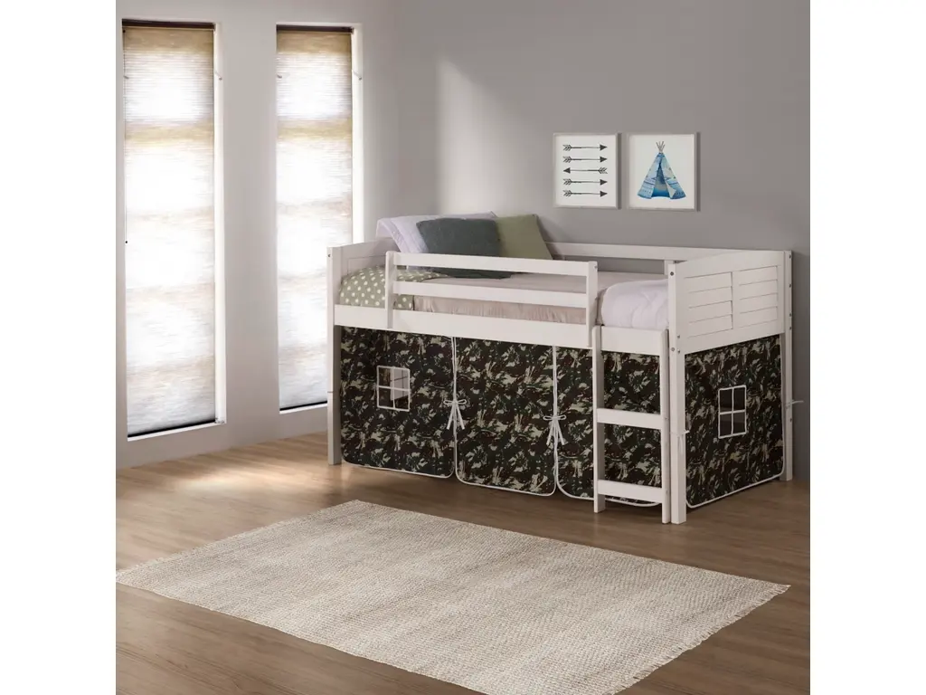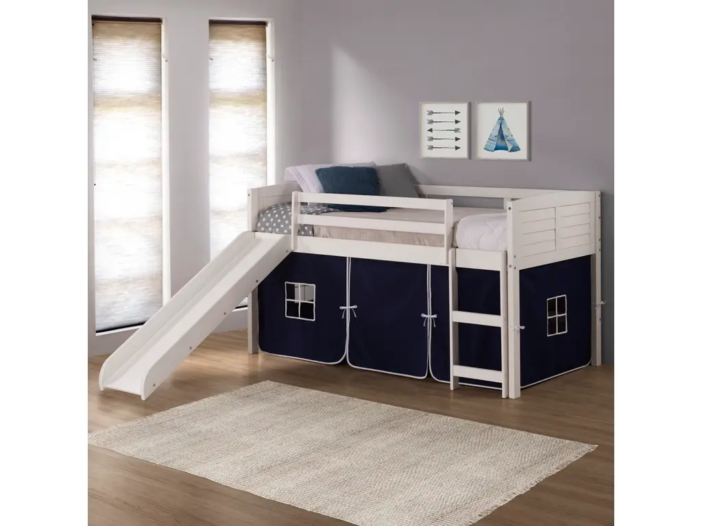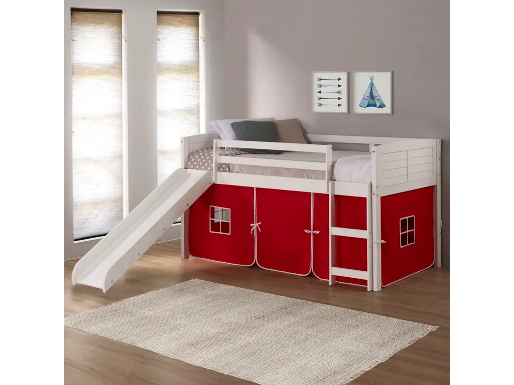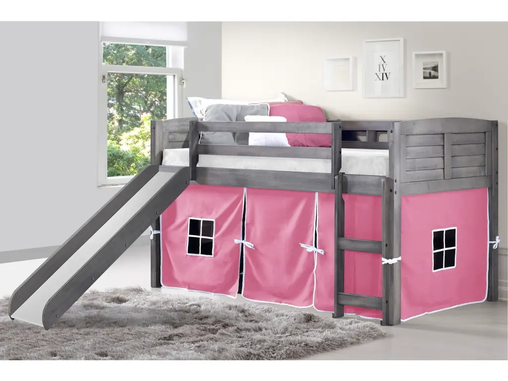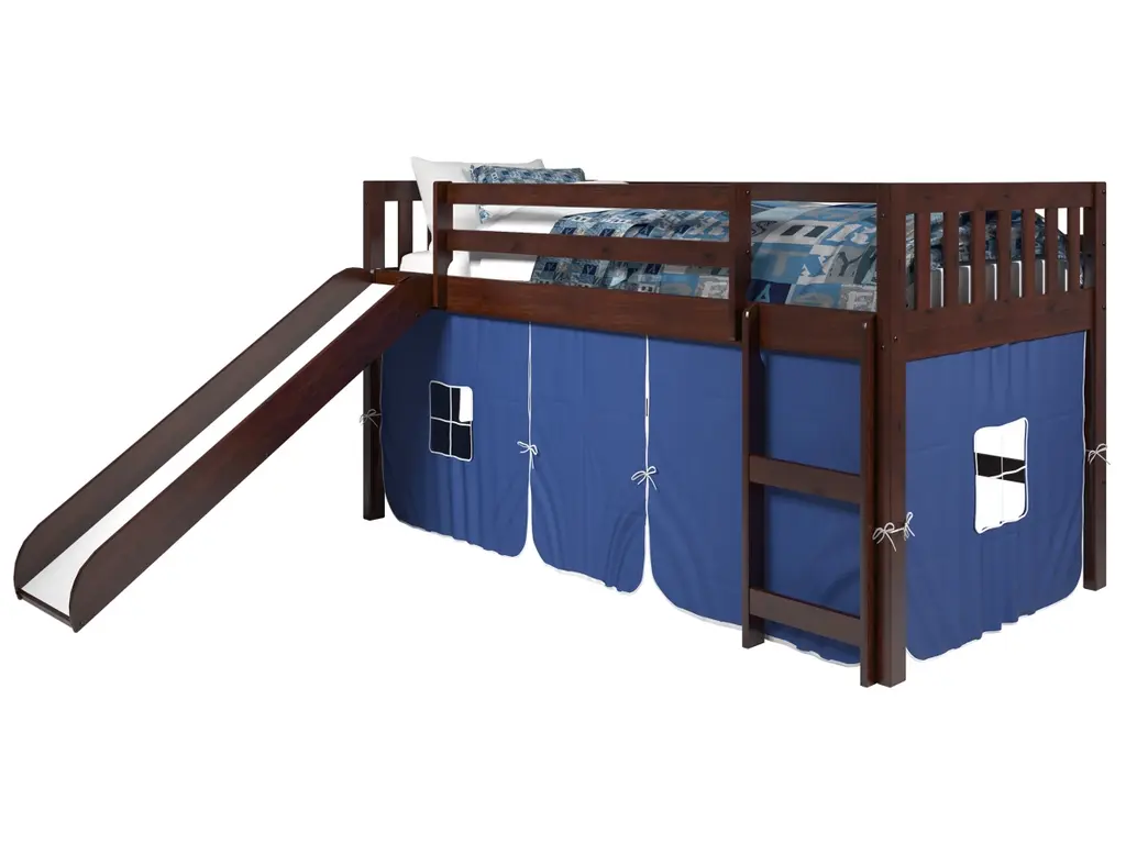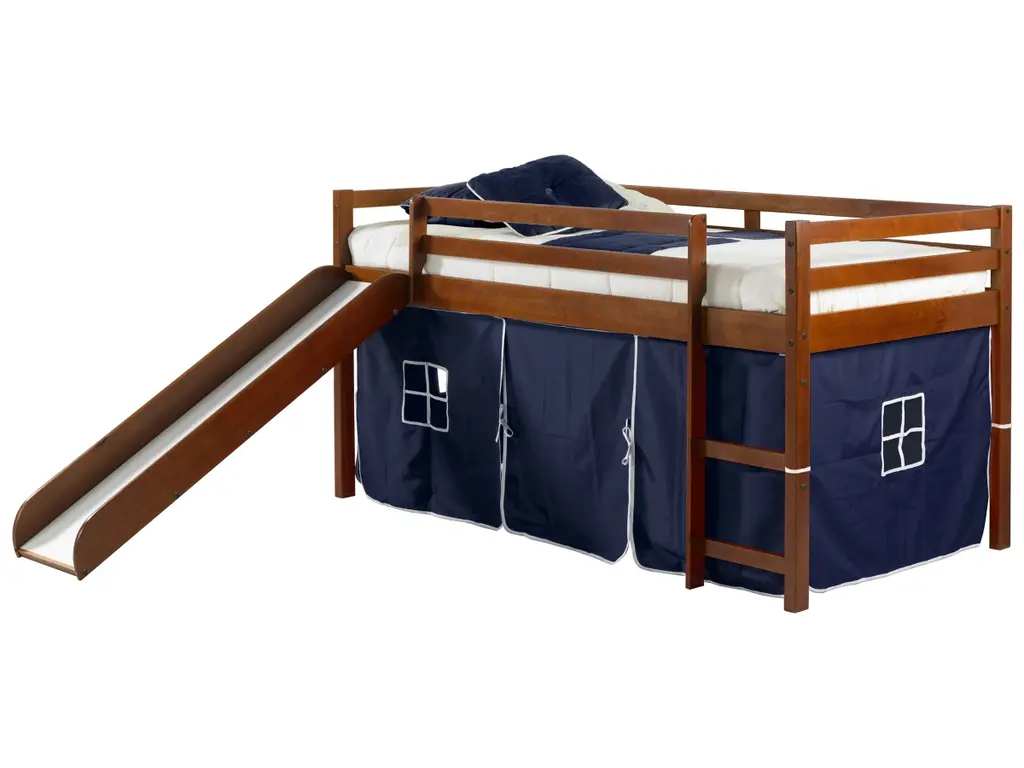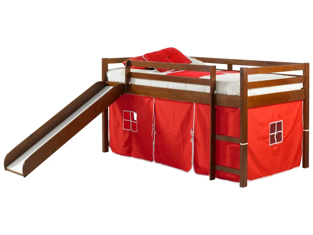 Create the bedroom of their dreams with this twin low loft tent bed with slide. Quality crafted of pine wood for sturdy construction made for years of enjoyment, this loft tent bed offers space-saving convenience, with an open space under the bed that's great for "camping in," play time, toy storage and more.