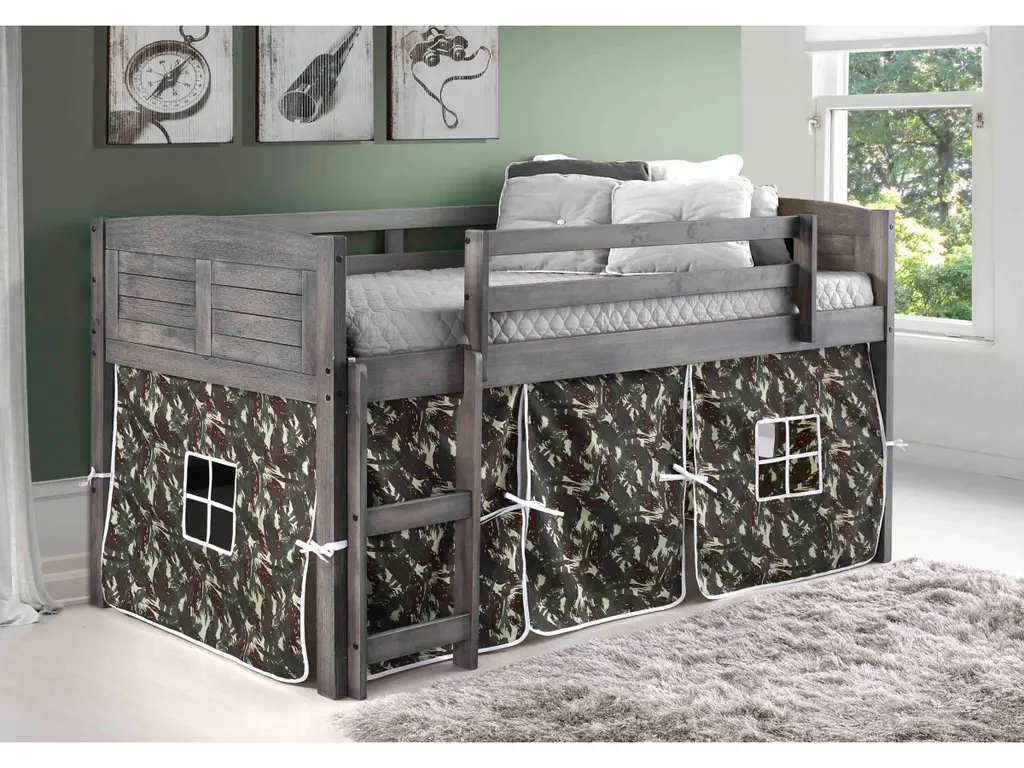 Create the bedroom of their dreams with this twin low loft tent bed with slide. Quality crafted of pine wood for sturdy construction made for years of enjoyment, this loft tent bed offers space-saving convenience, with an open space under the bed that's great for "camping in," play time, toy storage and more.