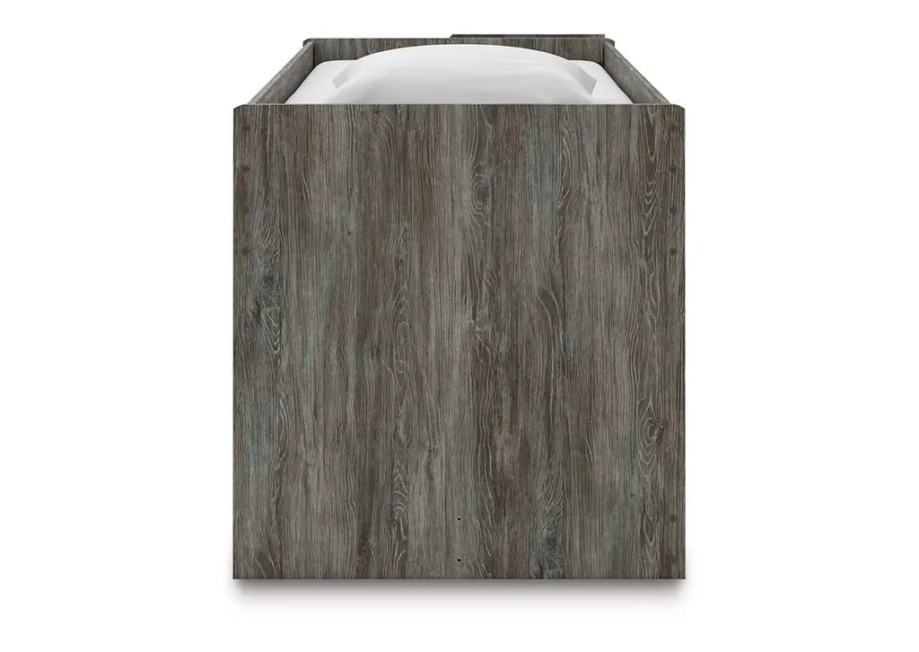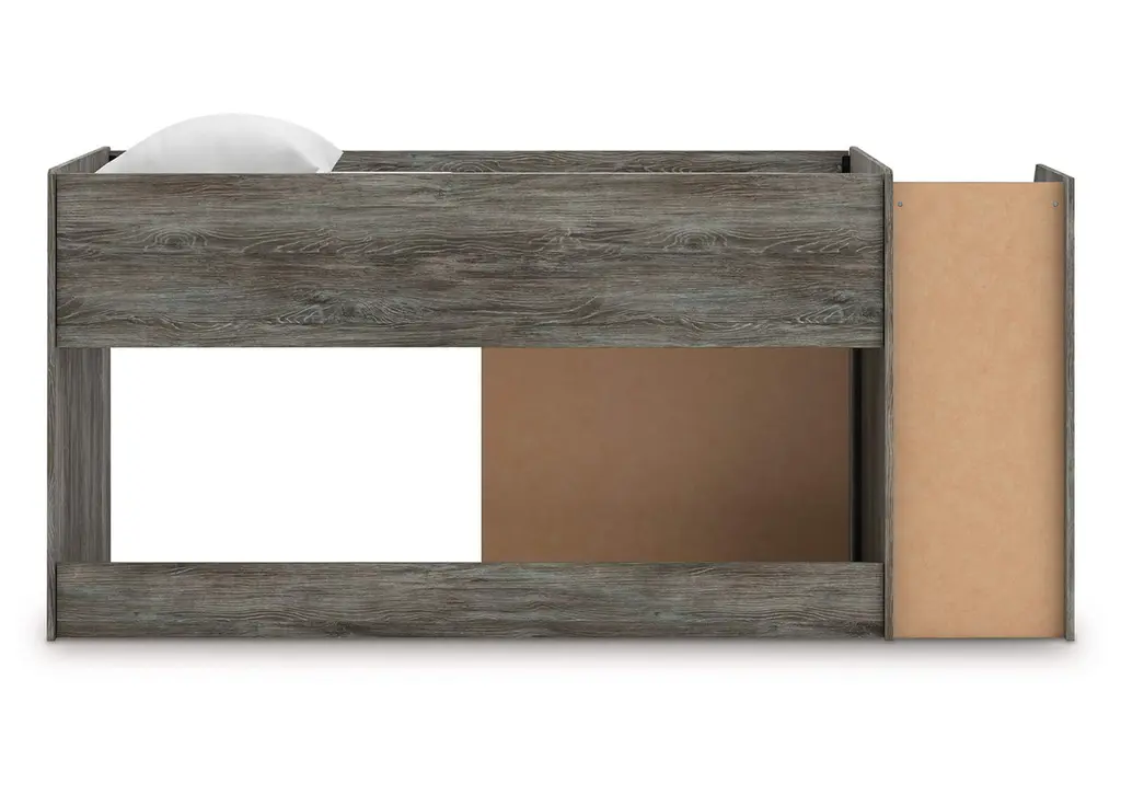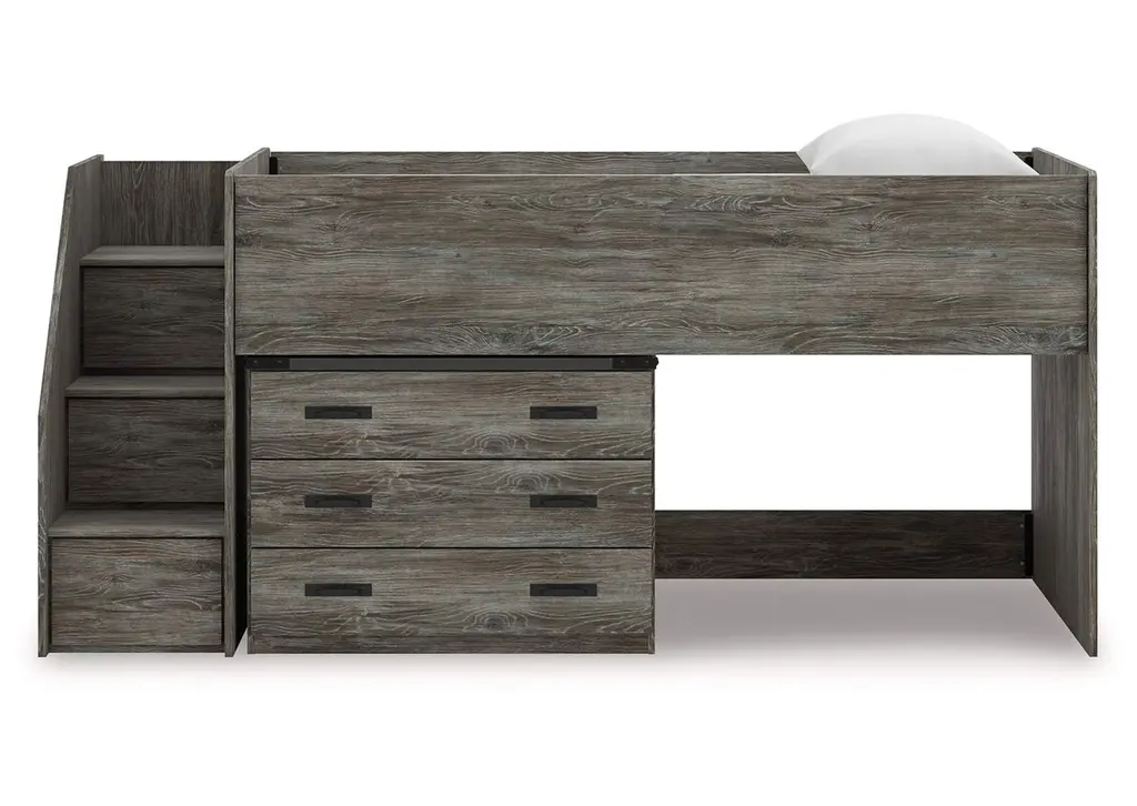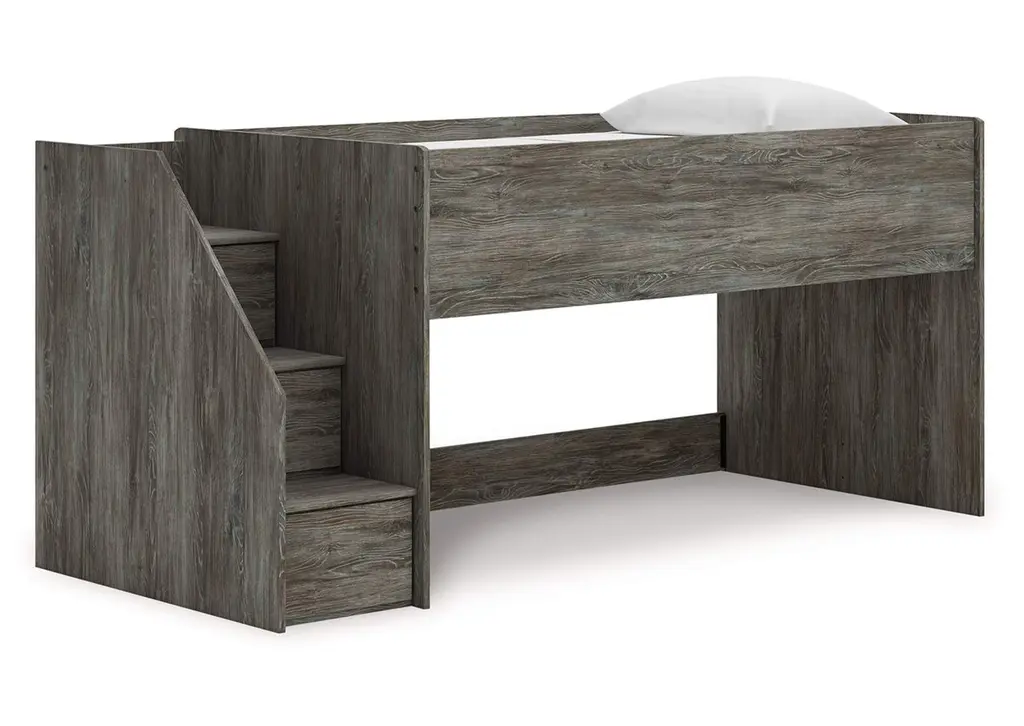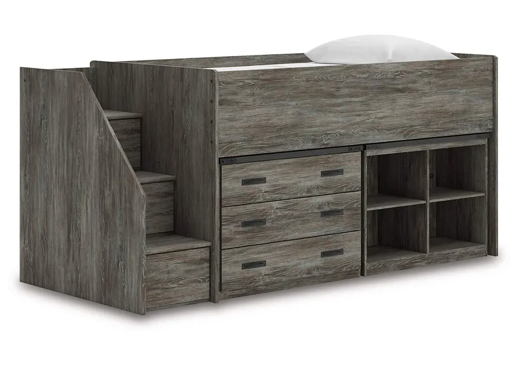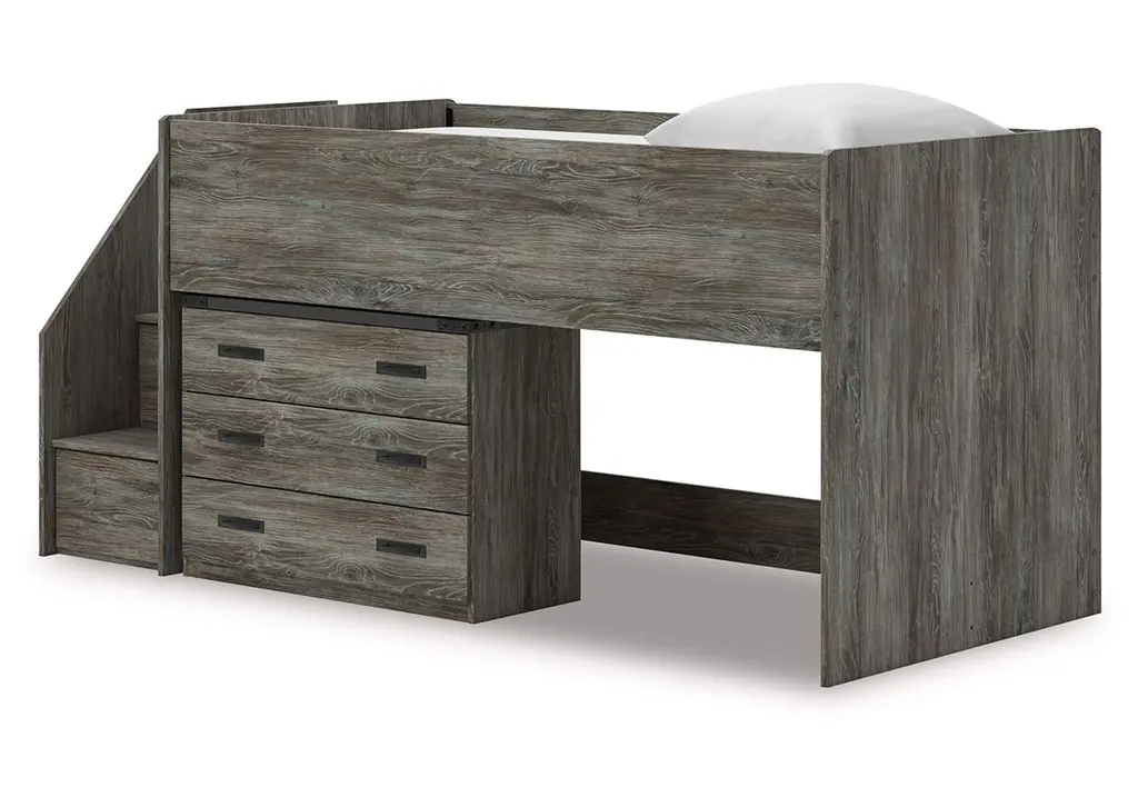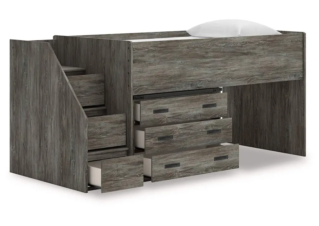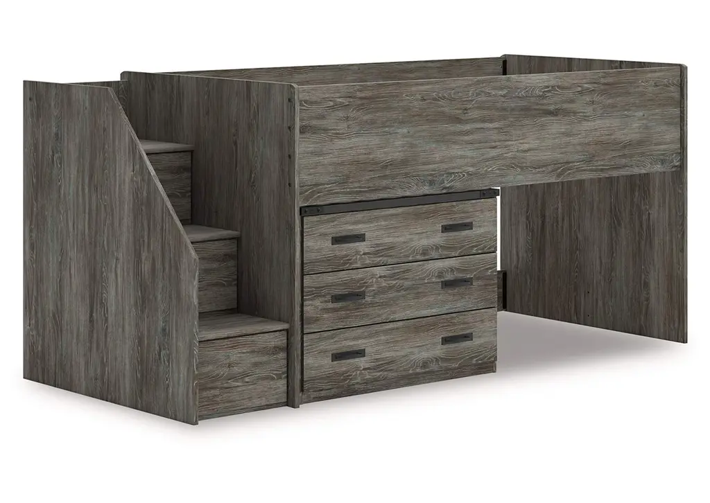 Cool, casual style is for all ages. With the Frandern twin loft bed with drawer storage, they get the function they need plus the refined design you love. Approachably neutral in a rustic warm gray, it’s adaptable enough to pair with an assortment of existing colors and room decor. Faux metal detailing with nailhead accents lends an industrial edge. And with its space-saving lofted design and included drawers, this bed doubles as a storage solution for clothes, toys and everything in between. Weight 360.000 lbs. (162kgs.)