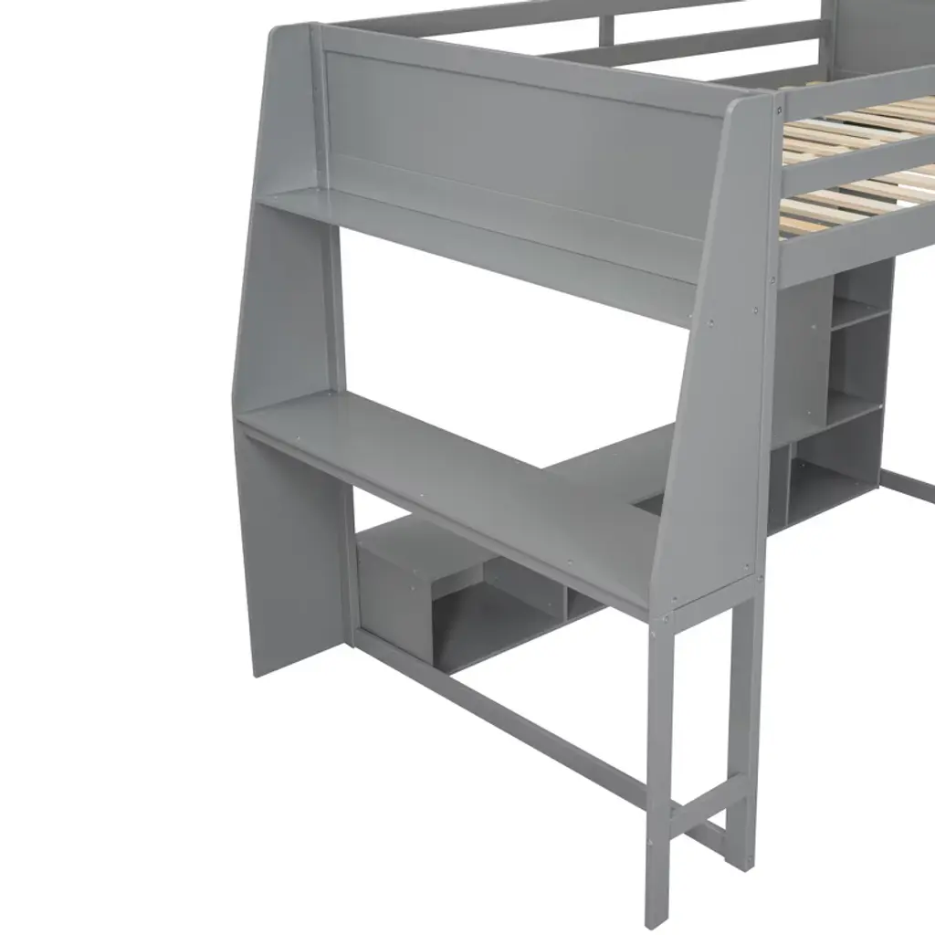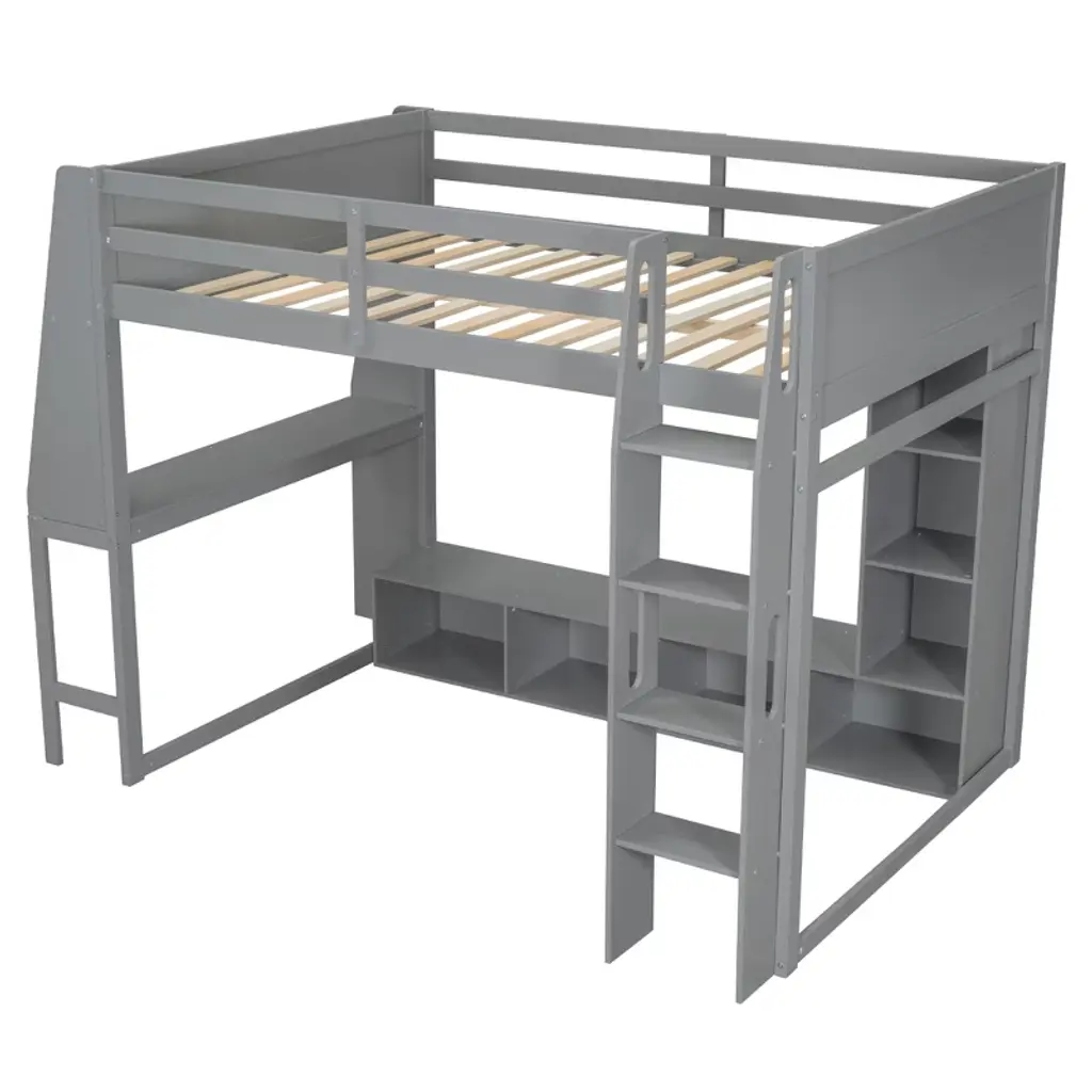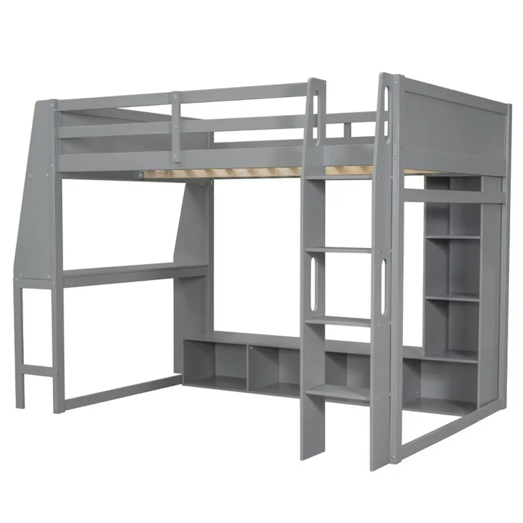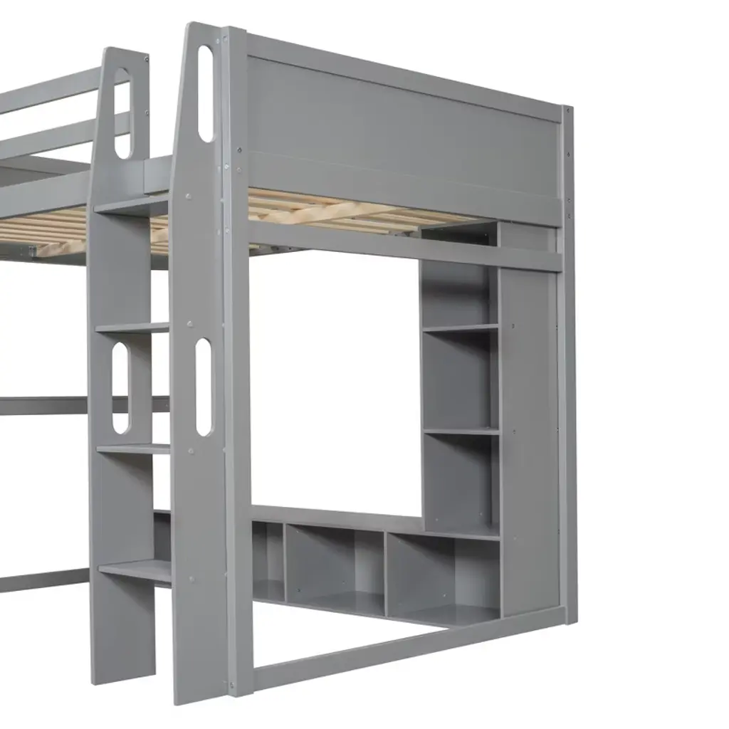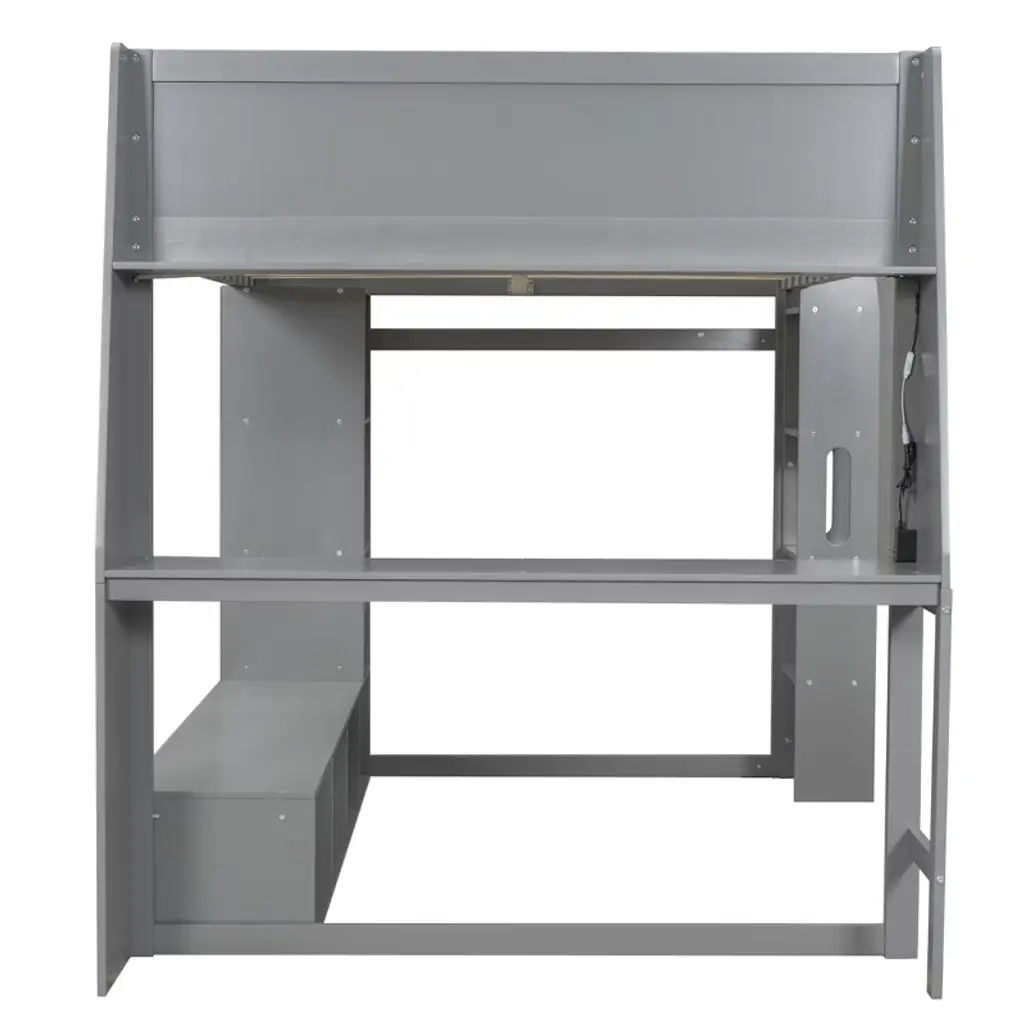 Full Size Gaming Loft Bed With Desk And Led, Wood Loft Bed Frame With Storage Shelves And A Hanging Clothes Rack, Gray