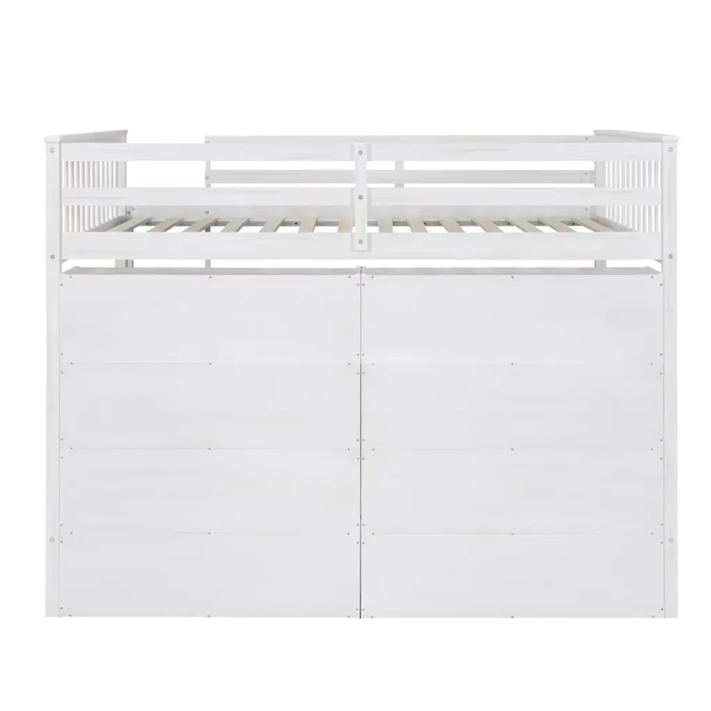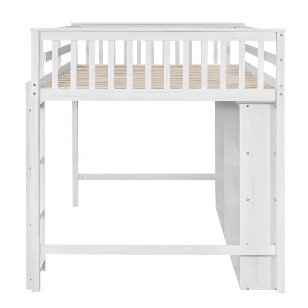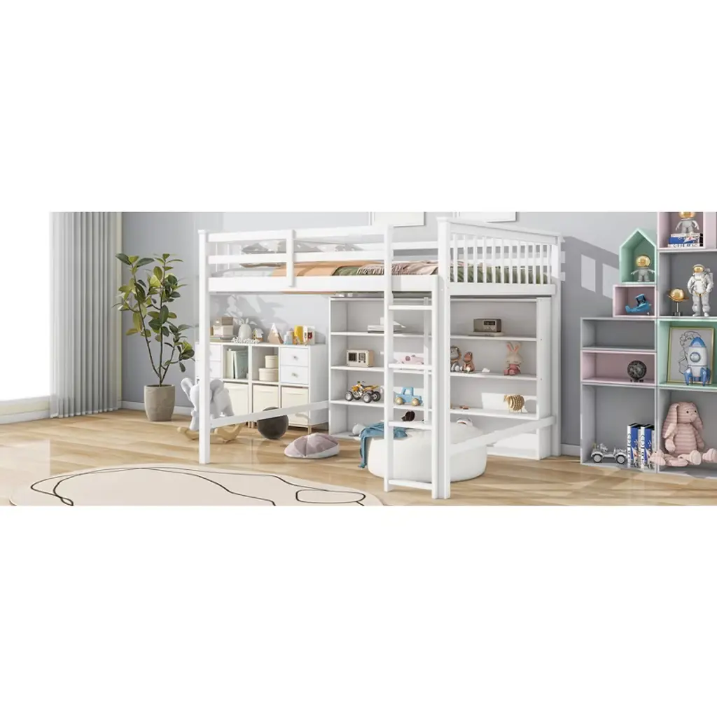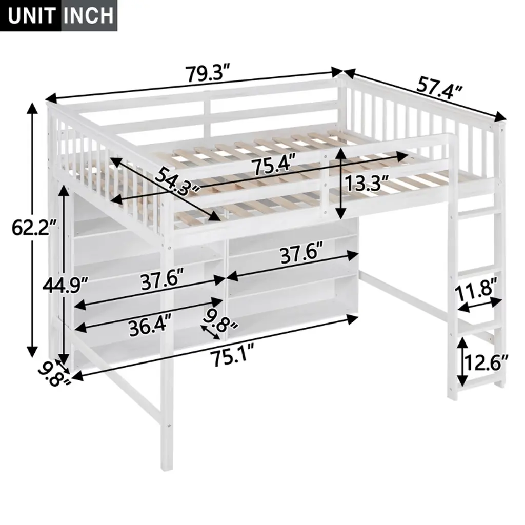 Product Features Storage Loft Bed The space underneath the loft bed is a good place for your little ones to read, do homework or play and create their own world to be explored.Space Saving Design With unique design, this twin loft bed creates a fun and adorable space that not only serves as a comfortable sleeping area, but also doubles as a space for you to study or work.Large Storage Shelves This modern style loft bed with 8 large open shelves which provide extra space to store your necessities like shoes or books.Solid Construction This multi-functional loft bed is crafted from a solid pine wood frame, with commercial grade MDF board for quality control and durability. Guardrails are solidly attached for added safety.Easy to Assemble All parts included in your package are indicated clearly. With step-by-step installation manual and pre-drilled holes, you can easily assemble this side table individually. Manual installation is recommended. Description If your family needs a bed that can sleep and study, this loft bed will be a good choice for you, it will have you saving space and maximizing functionality with a wide array of features. It is a perfect study area while also allowing space to store your belongings. The bed with comprehensive guardrails ensures your sleep safety. You don't need to worry about its quality. The design of the bed is elegant and can fit into your bedroom well. Details Material: Pine Wood + MDFSize: FullNumbers of Package: 2Spring Box: No needAssembly Required: Yes Dimensions Overall Product Dimension: 79.3''L x 57.4''W x 62.2''HUpper Bed Dimension: 75.4'' x 54.3''Total Height: 62.2''Recommended Mattress Thickness: 6''Overall Product Weight: 193lbsBed Weight Capacity: 350lbs