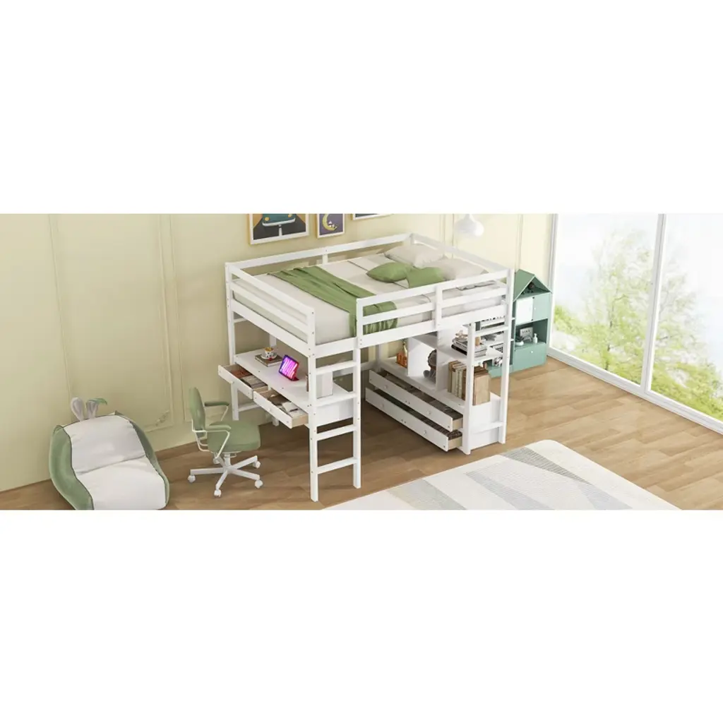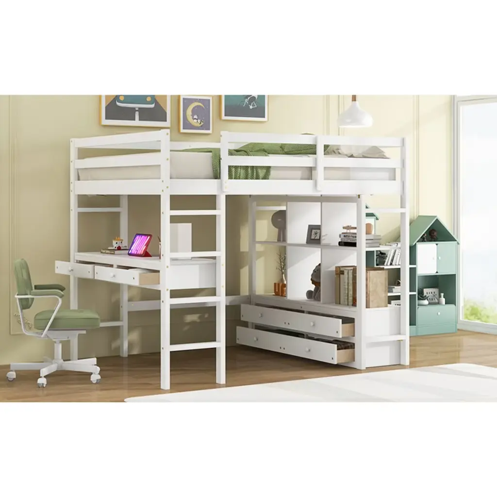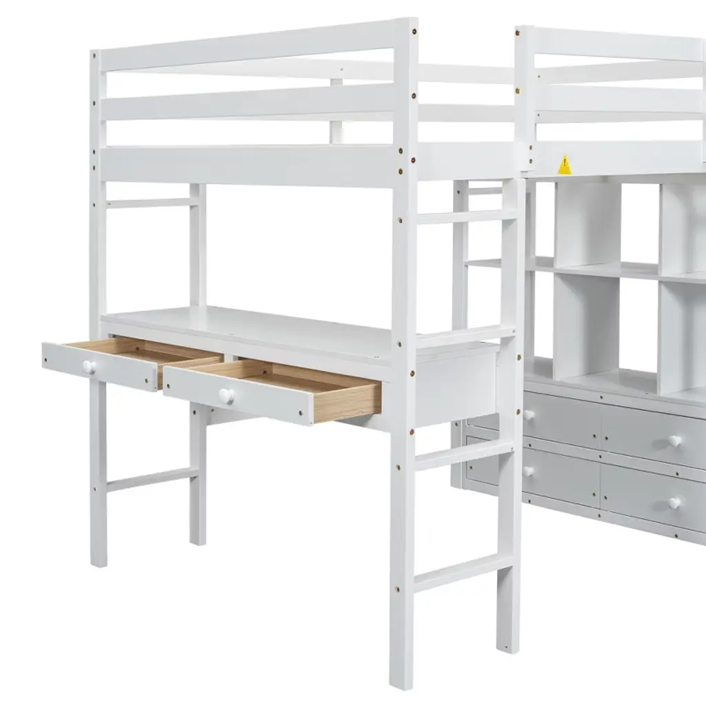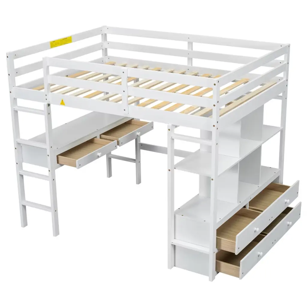 Product Features Multifunctional Design – Unlock the possibilities with this loft bed featuring drawers, cabinets, shelves, and a full-size desk, helping you save space while maximizing functionality with a wide array of features.Space-Saving Design – Perfect for homes with limited space, this loft bed makes smart use of vertical space, offering a cozy sleeping area, a work station, and extra play or storage space—ideal for growing families.Sturdy Frame Construction – Built with a durable pinewood frame, this loft bed ensures long-lasting stability and strength for everyday use.Built-in Desk with Storage – Includes a built-in desk with two drawers underneath, perfect for use as a study or work area while keeping essentials organized and within reach.Easy Assembly – Every order includes clear, detailed instructions and all necessary tools, so you can assemble your bed quickly and with confidence. Description Unlock the possibilities with the loft bed with drawers, cabinets, shelves, and desk in full sizes, which will have you saving space and maximizing functionality with a wide array of features. Designed with a wooden deck, four drawers, and six shelves, it is a perfect study area while also allowing space to store your belongings. Available in a neutral white finish for the perfect fit with your existing decor. The built-in desk with two drawers on the other side can be used as your study area or work station. Specification Material: Pine Wood + MDFSize: FullNumber of Packages: 2Spring Box: No NeedAssembly Required: Yes Dimensions Overall Product Dimension: 78.2''L x 57.5''W x 65''HBed Dimension: 76'' x 55.5''Total Height: 65''Number of Bed Slats: 14 pcsOverall Product Weight: 225 lbsBed Weight Capacity: 350 lbsRecommended Mattress Thickness: 6''