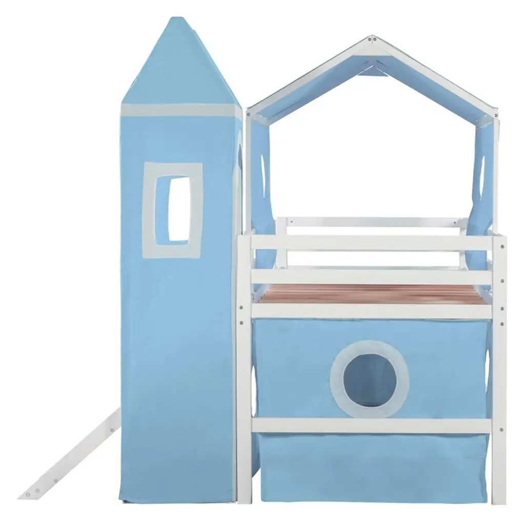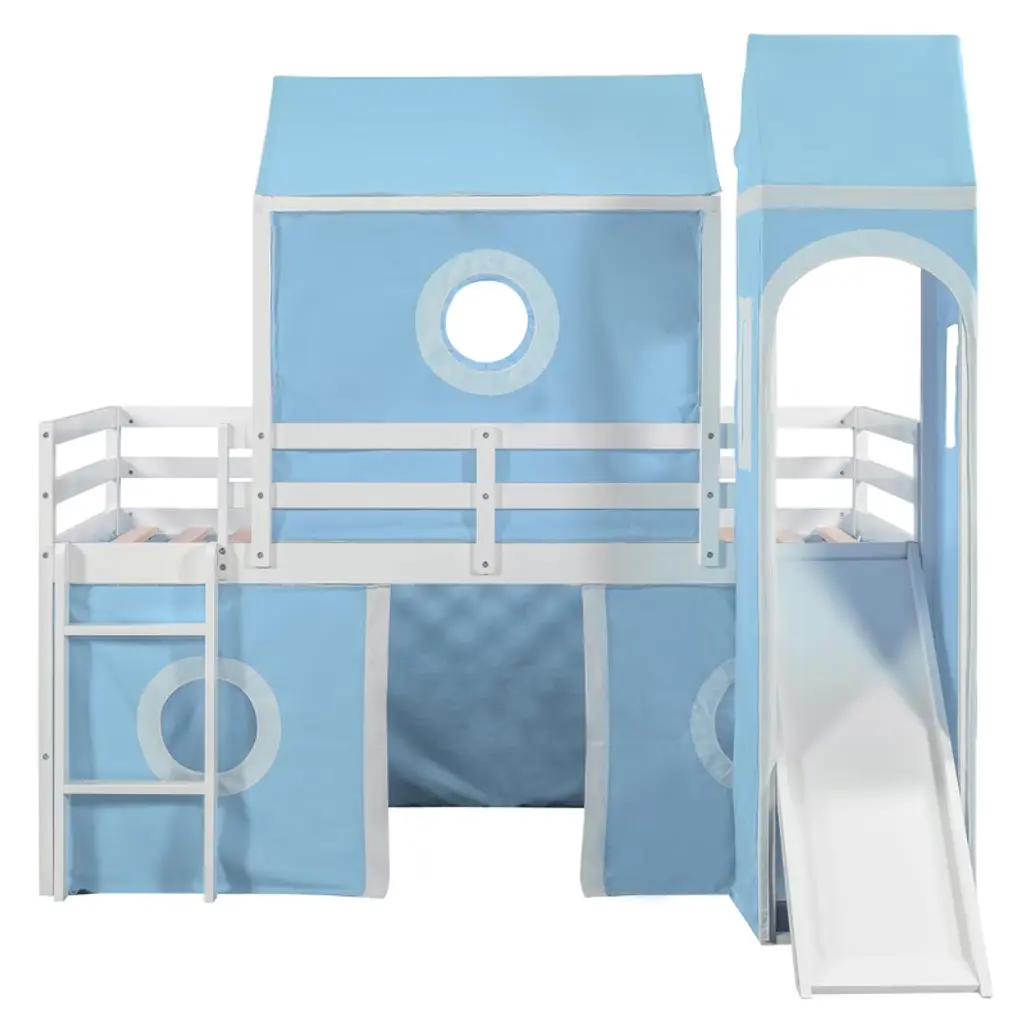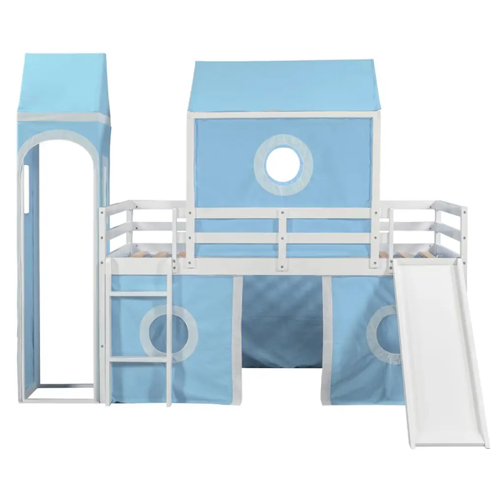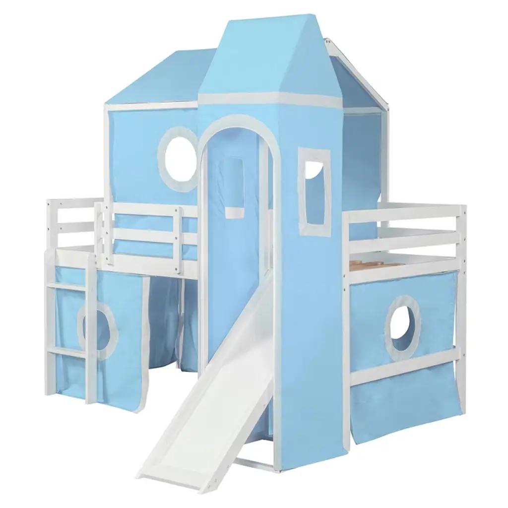Product Features Sturdy Construction & Unique Design – Made of solid pine wood and high-quality MDF, this bed provides great stability. The slats are designed to work with each mattress for better weight capacity. We’ve added kids' favorite castle elements to make the room more lively and fun. Our unique design encourages your child to love bedtime.Playhouse Inspired – We provide three installation methods: the tower can be placed on the left side, right side, or combined with the slide. Choose the layout that best fits your bedroom design. The castle-like design with a window creates a fun and adorable space that serves as both a comfortable sleeping area and a playful play zone.Impressive & Beautiful – Featuring a fence-shaped appearance, this unique loft bed becomes the focal point of the bedroom when friends come over. It brings a charming rural lifestyle into the bedroom, offering not only bedtime fun but also a stylish accent piece.Spacious Under Bed Space – This bed features a semi-enclosed space underneath, providing extra room not only for sleeping but also for storage or creating a mini playground. The design ensures good air circulation, giving kids fresh air throughout the night.Detail & After-sales Service – 78"L x 79.7"W x 74.8"H. Mattress not included. Some assembly is required, although we have provided clear instructions and tools to make setup easy and stress-free. Description The opportunities are endless to create a fun play environment for your kids — they’ll look forward to bedtime and reading time. This unique design bed not only saves space but also creates an exciting atmosphere for your child. Enjoy this bed for years to come thanks to its durable build, manufactured with quality lumber and pinewood to withstand horseplay, scratching, and other daily wear. It comes complete with thick slats to help extend the life of your mattress. Weight & Dimensions Overall Product Dimension: 77.5"L x 75.3"W x 75.3"HDetail Product Dimension: Please refer to the Size imageNumber of Package: 1Package Dimension: Please refer to the SpecificationOverall Product Weight: 98.33 LBSWeight Capacity: 220LBSRecommended Mattress Thickness: 4-6"Recommended age: Over 6 years Specifications Product Type: Loft BedSize: TwinProduct Material: Plywood + MDF + PinewoodBox Spring Required: NoMattress Included: NoNotes: Manual measurement has been used, there may be some reasonable error. All the pictures are taken by actual samples, slight chromatic aberration may occur due to lighting or display.
