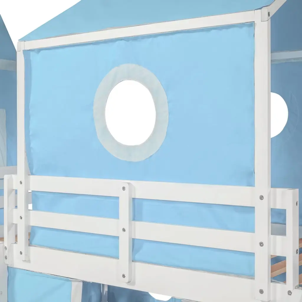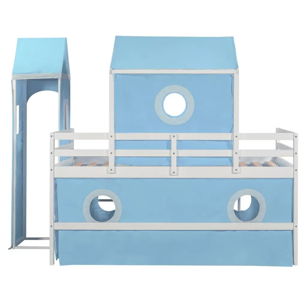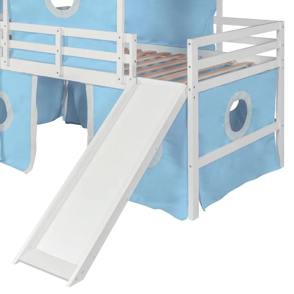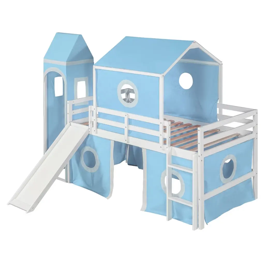 Product Features Sturdy Construction & Unique Design – Made of solid pine wood and high-quality MDF, this bed provides great stability. The slats are designed to work with each mattress for better weight capacity. We’ve added kids' favorite castle elements to make the room more lively and fun. Our unique design encourages your child to love bedtime.Playhouse Inspired – We provide three installation methods: the tower can be placed on the left side, right side, or combined with the slide. Choose the layout that best fits your bedroom design. The castle-like design with a window creates a fun and adorable space that serves as both a comfortable sleeping area and a playful play zone.Impressive & Beautiful – Featuring a fence-shaped appearance, this unique loft bed becomes the focal point of the bedroom when friends come over. It brings a charming rural lifestyle into the bedroom, offering not only bedtime fun but also a stylish accent piece.Spacious Under Bed Space – This bed features a semi-enclosed space underneath, providing extra room not only for sleeping but also for storage or creating a mini playground. The design ensures good air circulation, giving kids fresh air throughout the night.Detail & After-sales Service – 78"L x 79.7"W x 74.8"H. Mattress not included. Some assembly is required, although we have provided clear instructions and tools to make setup easy and stress-free. Description The opportunities are endless to create a fun play environment for your kids — they’ll look forward to bedtime and reading time. This unique design bed not only saves space but also creates an exciting atmosphere for your child. Enjoy this bed for years to come thanks to its durable build, manufactured with quality lumber and pinewood to withstand horseplay, scratching, and other daily wear. It comes complete with thick slats to help extend the life of your mattress. Weight & Dimensions Overall Product Dimension: 77.5"L x 75.3"W x 75.3"HDetail Product Dimension: Please refer to the Size imageNumber of Package: 1Package Dimension: Please refer to the SpecificationOverall Product Weight: 98.33 LBSWeight Capacity: 220LBSRecommended Mattress Thickness: 4-6"Recommended age: Over 6 years Specifications Product Type: Loft BedSize: TwinProduct Material: Plywood + MDF + PinewoodBox Spring Required: NoMattress Included: NoNotes: Manual measurement has been used, there may be some reasonable error. All the pictures are taken by actual samples, slight chromatic aberration may occur due to lighting or display.