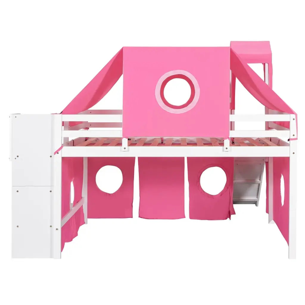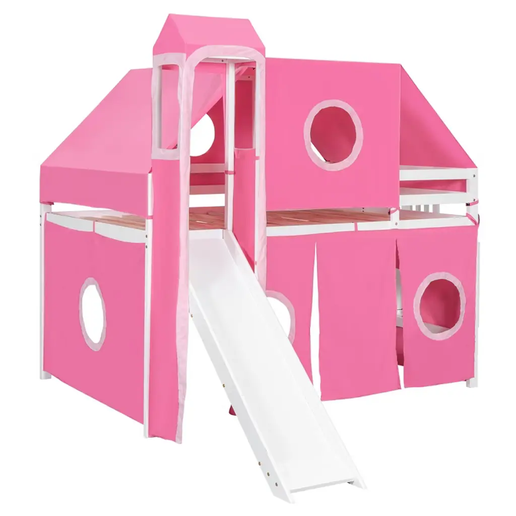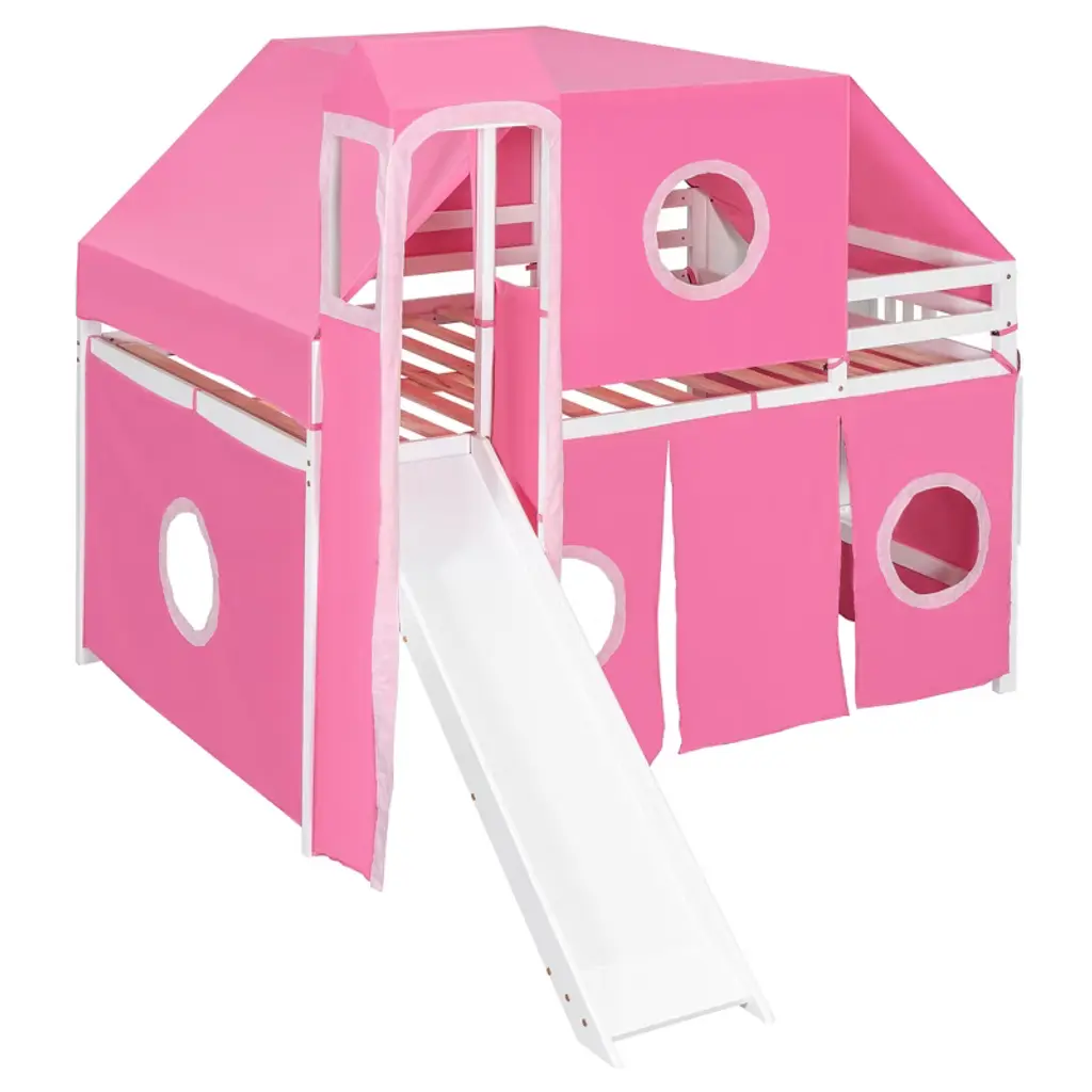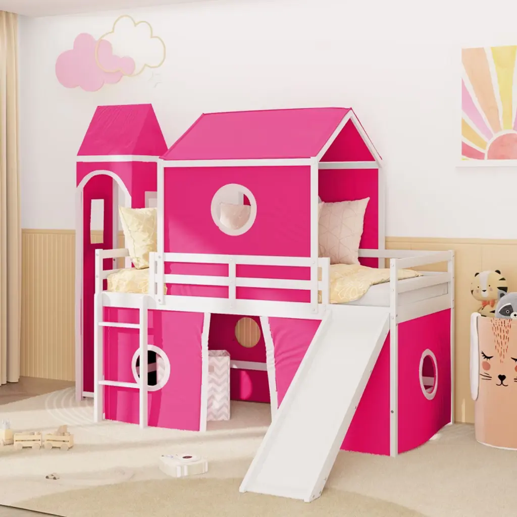 Product Features Sturdy Construction & Unique Design – Made of solid pine wood and high-quality MDF, this bed provides great stability. The slats are compatible with each bed, offering better weight capacity. We've added kids' favorite castle elements to make the room more vibrant. Our unique design makes your child love bedtime.Playhouse Inspired – Castle-like design with a window creates a fun and adorable space that not only serves as a comfortable sleeping area but also doubles as a playful hideaway for kids to enjoy.Impression & Beautiful – This loft bed features a fence-shaped appearance. This unique bed will be the highlight of the bedroom when friends come by. It brings a rich rural lifestyle into the bedroom, offering great fun at bedtime while adding style to the room.Spacious Under Bed Space – This bed has a semi-enclosed space, meaning you'll have extra room not only for sleeping but also for storage or creating a mini playground. This additional semi-enclosed space ensures proper air circulation, giving kids a fresh-air night's sleep.Detail & After-sales service – Dimensions: 94.6"L x 99.5"W x 78.9"H. Mattress not included. Some assembly is required, although we have provided clear instructions and tools. Description The opportunities are endless to create a fun play environment for your kids — they will look forward to bedtime and reading time. This unique design bed not only saves space but also creates an exciting atmosphere for you. Enjoy this bed for years to come thanks to its durable build, manufactured with quality lumber and pinewood to withstand horseplay, scratching, and other untimely wear. Comes complete with thick slats to preserve the life of your mattress. Weight & Dimensions Overall Product Dimension: 94.6"L x 99.5"W x 78.9"HDetail Product Dimension: Please refer to the Size imageNumber of Package: 2Package Dimension: Please refer to the SpecificationOverall Product Weight: 171.64 LBSWeight Capacity: Upper bed: 400LBSRecommended Mattress Thickness: Upper bed: 6"Recommended Age: Over 6 years Specifications Product Type: Loft BedSize: FullProduct material: Plywood + MDF + PinewoodBox Spring Required: NoMattress Included: NoNotes: Manual measurement has been used, there may be some reasonable error. All the pictures are taken by actual samples, slight chromatic aberration may occur due to lighting or display.