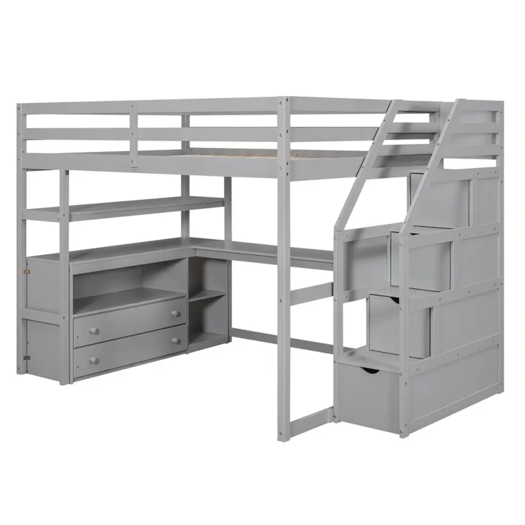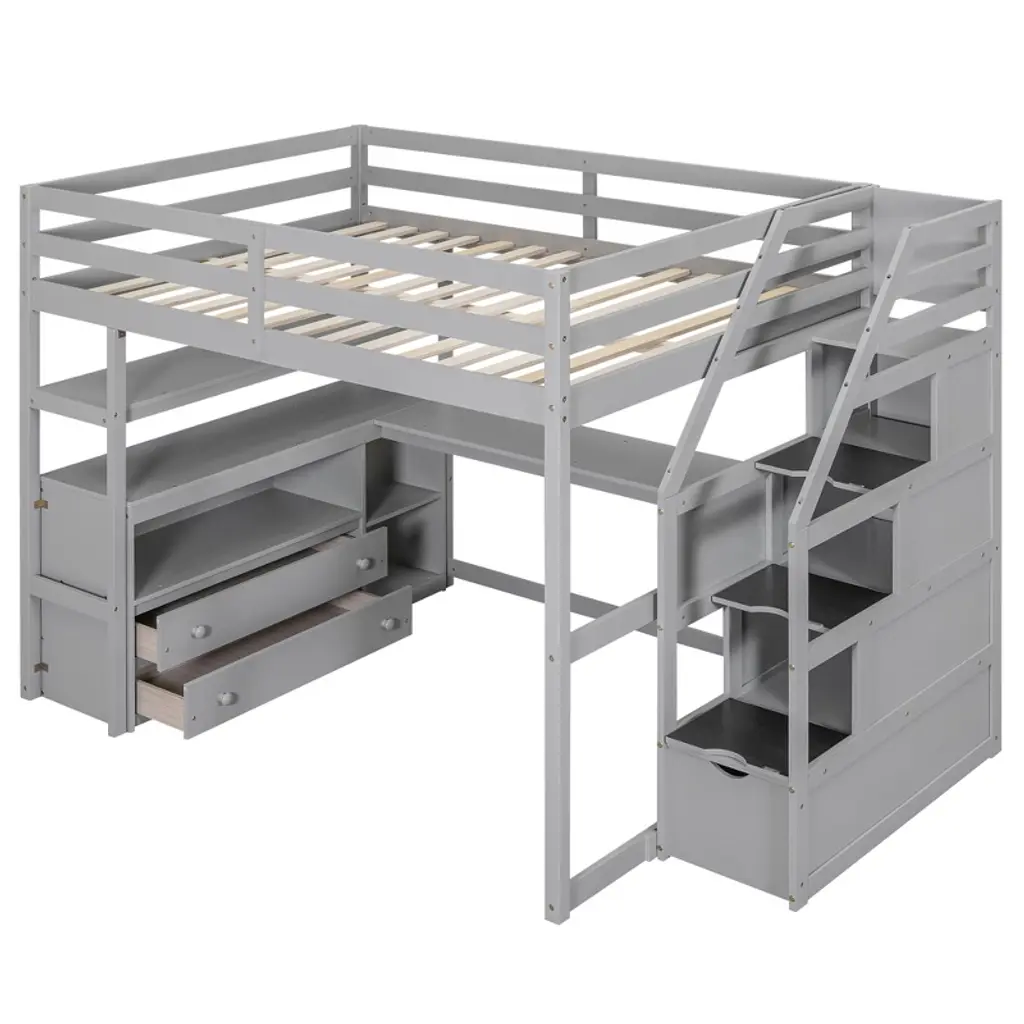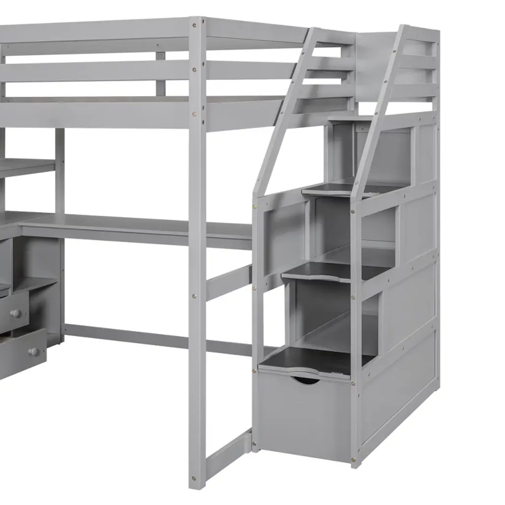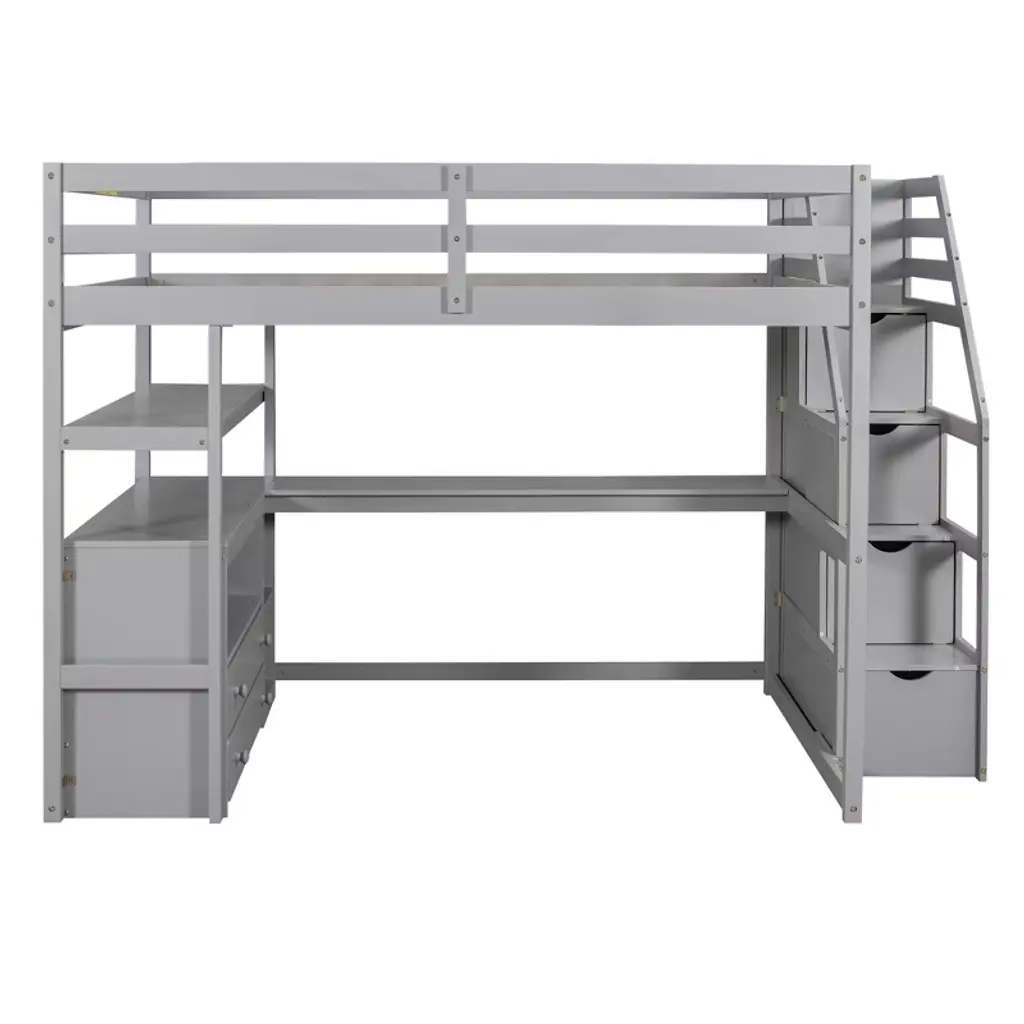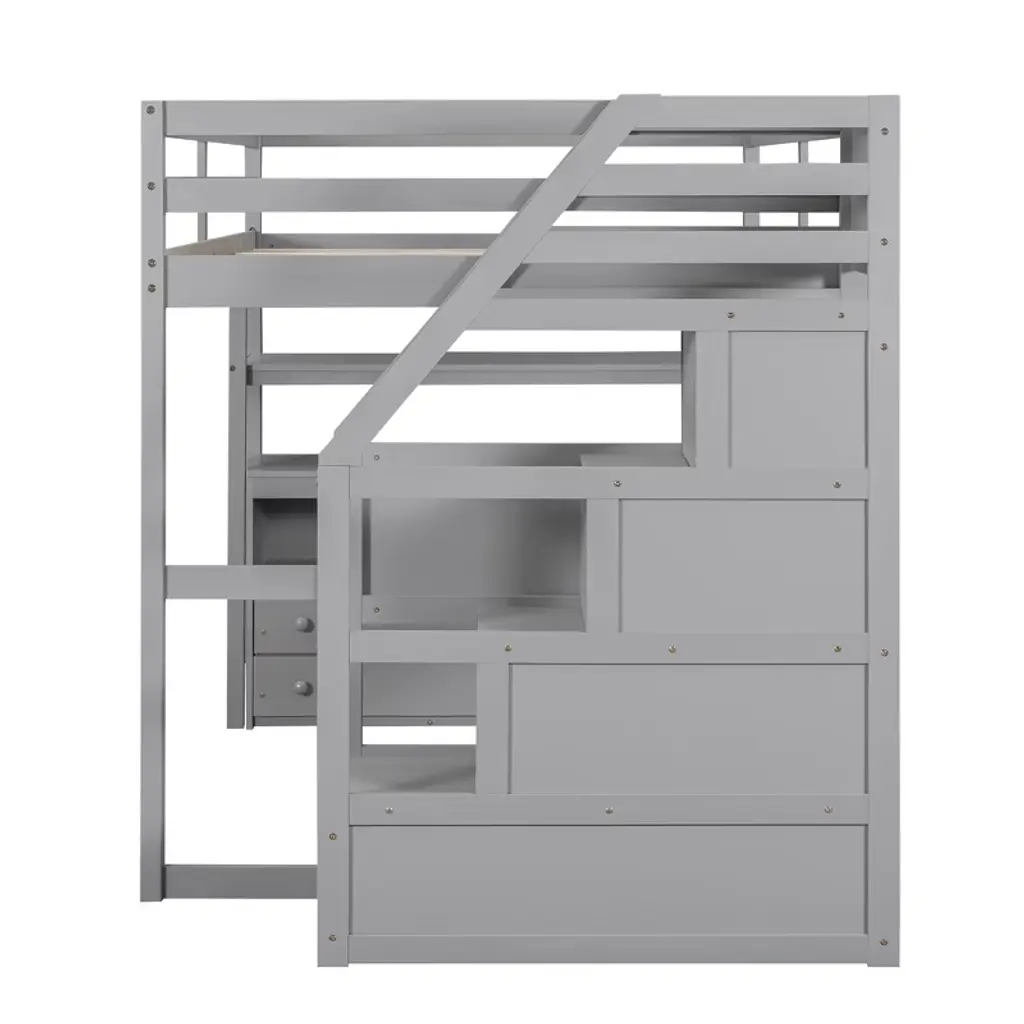 Product Features [Multifunctional Design] This loft bed includes a desk, shelves, storage staircase, and two large storage drawers in one. Not only provides you with a place to work or study, but also provides a large storage space.[Maximized Space] The full loft bed can save plenty of room for you to place other furniture in your bedroom. This bed provides ample storage for your everyday items.[Sturdy Frame] The bed structure is crafted from high-quality solid pine wood, solid pine legs and a strong, durable frame so that the bed is sturdy and durable.[Safety Guaranteed] Solid wood slats blend naturally into the already sturdy frame to give added ground-up support that provides stability. The loft bed features guard rails for added safety, and is accessible via the sturdy, slanted staircase. Enjoy many long years of relaxation and family fun, secure in this meticulously designed wood loft bed.[No Box Spring Needed] The wood slats support the mattresses not to slide and increase the service life. Description Full Size Loft Bed with Desk and Shelves, Two Built-in Drawers, Storage Staircase, White This full size loft bed with desk, shelves and drawers is a simple and stylish bed frame that coordinates well with a variety of decor styles, allowing you to elevate and enhance your space with ease. Staircase can ensure that you can reach the upper bunk safely, and can also provide storage space for your items. Made of solid pine wood with strong support slats, this bed is durable and sure to accompany you for many years to come. What's more, it combines a desk, shelf and two large storage drawers all in one. Description Material: Pine Wood + MDFSize: FullNumbers of Package: 3Spring Box: No needAssembly Required: Yes Dimensions Overall Product Dimension: 95.1''L x 57''W x 65''HPackage Dimension: Please refer to the SpecificationBed Dimension: 76'' x 55.5''Total Height: 65''Overall Product Weight: 295.5lbLoft Bed Weight Capability: 350lbRecommend Mattress Thickness: 6''