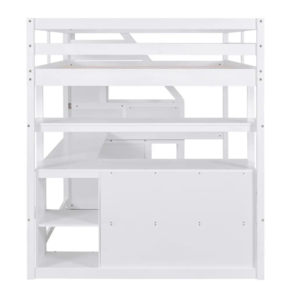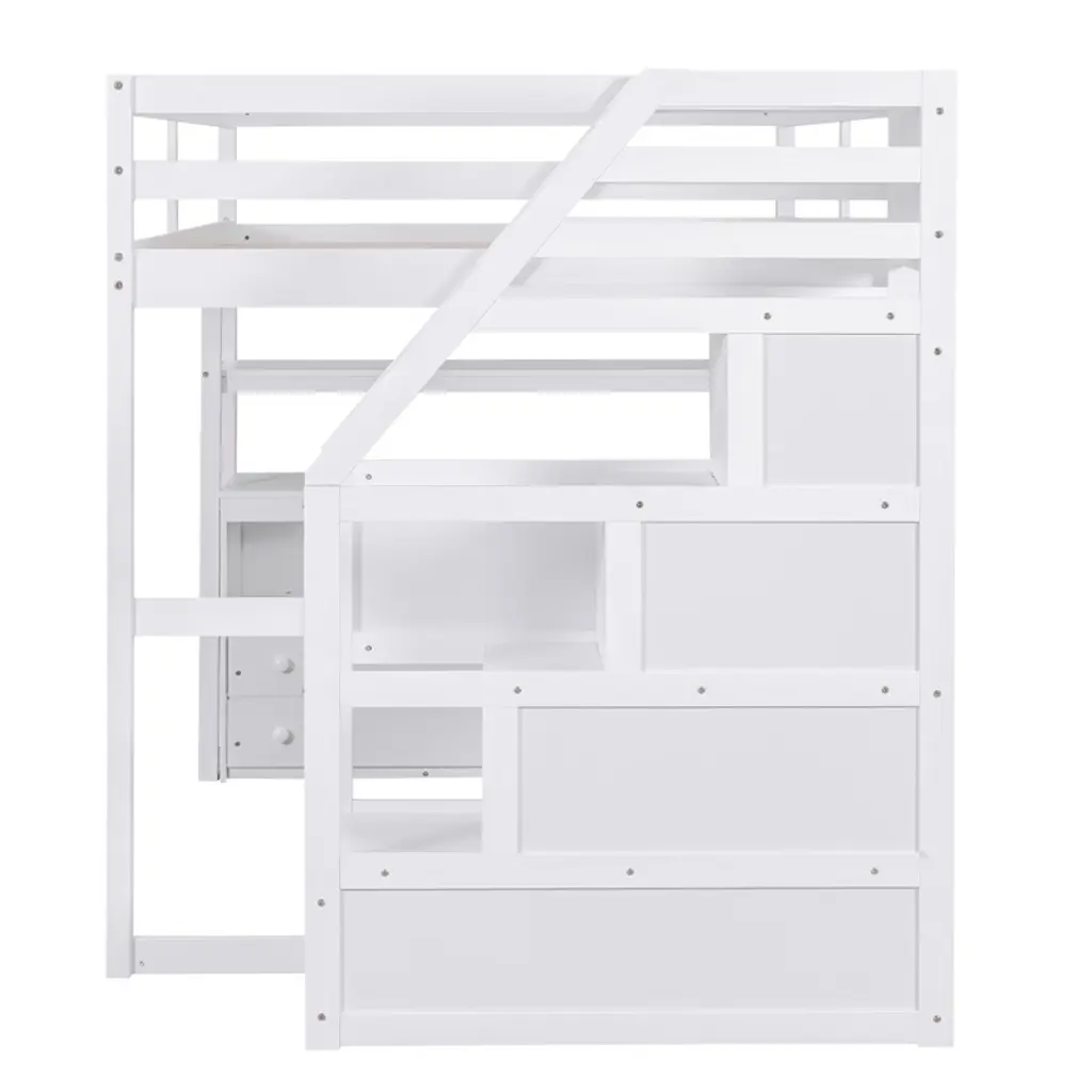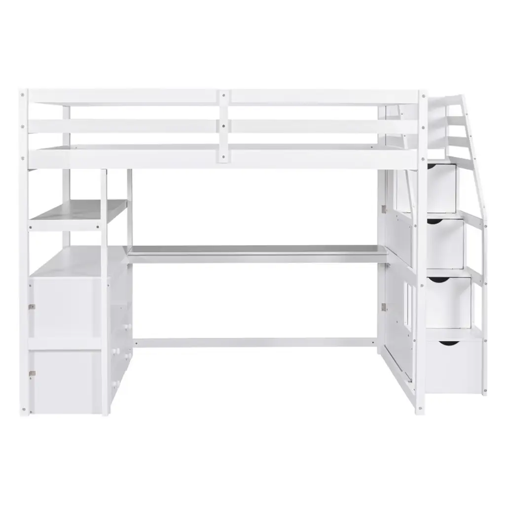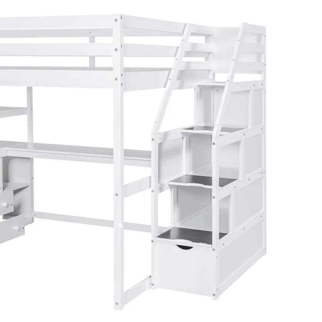Product Features [Multifunctional Design] This loft bed includes a desk, shelves, storage staircase, and two large storage drawers in one. Not only provides you with a place to work or study, but also provides a large storage space.[Maximized Space] The full loft bed can save plenty of room for you to place other furniture in your bedroom. This bed provides ample storage for your everyday items.[Sturdy Frame] The bed structure is crafted from high-quality solid pine wood, solid pine legs and a strong, durable frame so that the bed is sturdy and durable.[Safety Guaranteed] Solid wood slats blend naturally into the already sturdy frame to give added ground-up support that provides stability. The loft bed features guard rails for added safety, and is accessible via the sturdy, slanted staircase. Enjoy many long years of relaxation and family fun, secure in this meticulously designed wood loft bed.[No Box Spring Needed] The wood slats support the mattresses not to slide and increase the service life. Description Full Size Loft Bed with Desk and Shelves, Two Built-in Drawers, Storage Staircase, White This full size loft bed with desk, shelves and drawers is a simple and stylish bed frame that coordinates well with a variety of decor styles, allowing you to elevate and enhance your space with ease. Staircase can ensure that you can reach the upper bunk safely, and can also provide storage space for your items. Made of solid pine wood with strong support slats, this bed is durable and sure to accompany you for many years to come. What's more, it combines a desk, shelf and two large storage drawers all in one. Description Material: Pine Wood + MDFSize: FullNumbers of Package: 3Spring Box: No needAssembly Required: Yes Dimensions Overall Product Dimension: 95.1''L x 57''W x 65''HPackage Dimension: Please refer to the SpecificationBed Dimension: 76'' x 55.5''Total Height: 65''Overall Product Weight: 295.5lbLoft Bed Weight Capability: 350lbRecommend Mattress Thickness: 6''