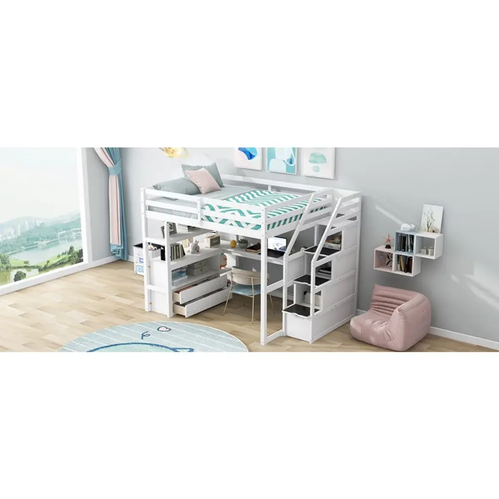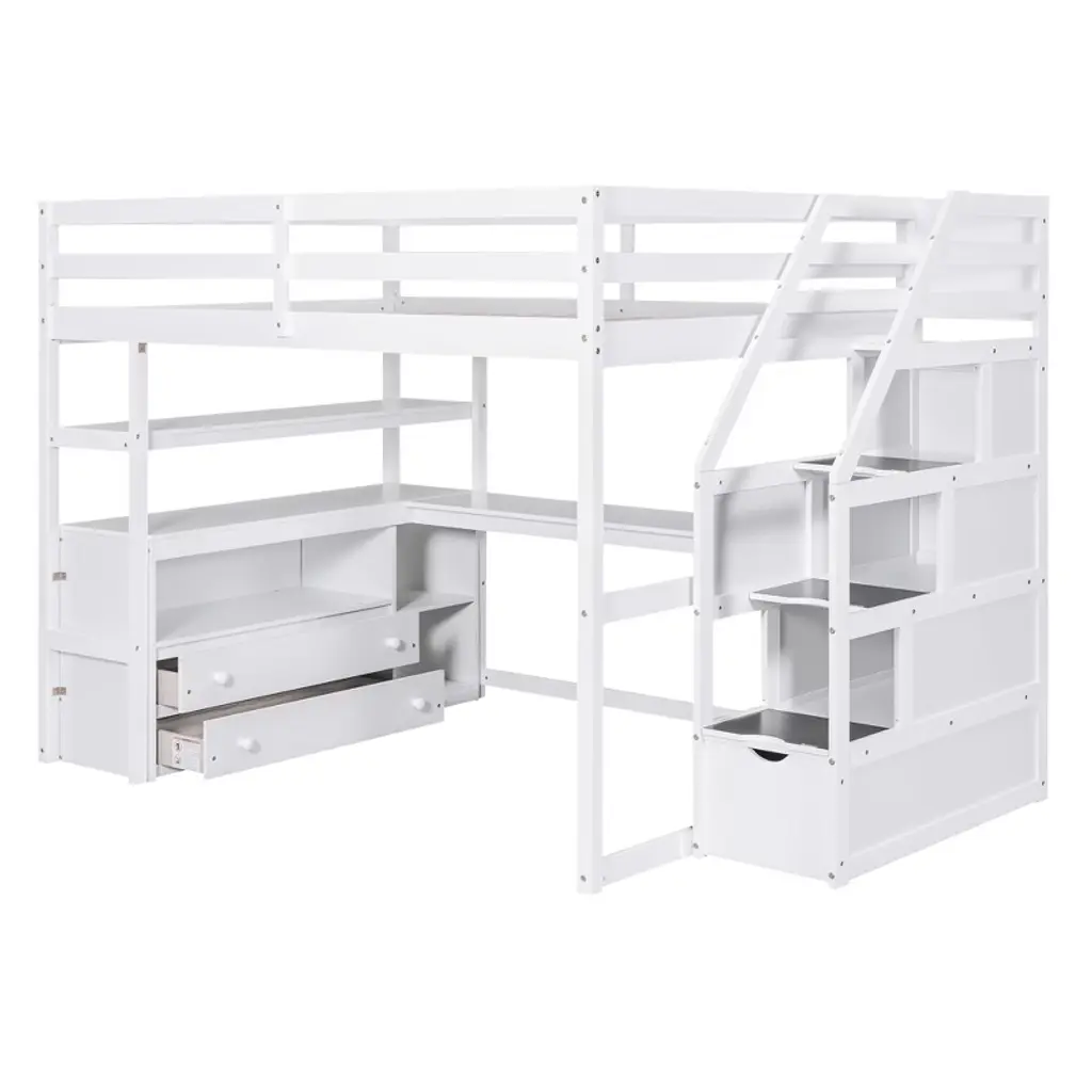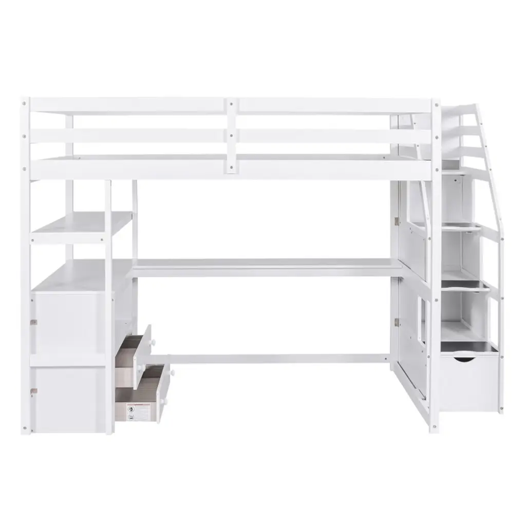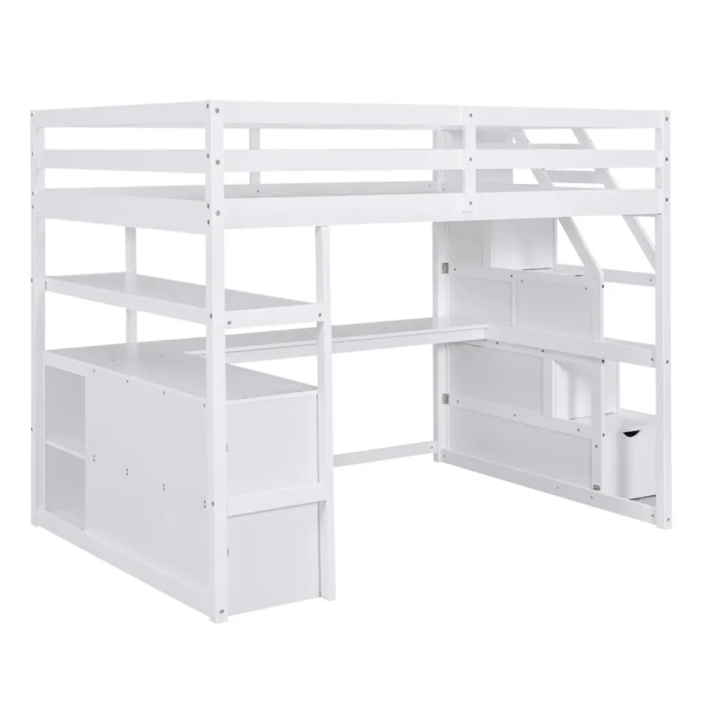 Product Features [Multifunctional Design] This loft bed includes a desk, shelves, storage staircase, and two large storage drawers in one. Not only provides you with a place to work or study, but also provides a large storage space.[Maximized Space] The full loft bed can save plenty of room for you to place other furniture in your bedroom. This bed provides ample storage for your everyday items.[Sturdy Frame] The bed structure is crafted from high-quality solid pine wood, solid pine legs and a strong, durable frame so that the bed is sturdy and durable.[Safety Guaranteed] Solid wood slats blend naturally into the already sturdy frame to give added ground-up support that provides stability. The loft bed features guard rails for added safety, and is accessible via the sturdy, slanted staircase. Enjoy many long years of relaxation and family fun, secure in this meticulously designed wood loft bed.[No Box Spring Needed] The wood slats support the mattresses not to slide and increase the service life. Description Full Size Loft Bed with Desk and Shelves, Two Built-in Drawers, Storage Staircase, White This full size loft bed with desk, shelves and drawers is a simple and stylish bed frame that coordinates well with a variety of decor styles, allowing you to elevate and enhance your space with ease. Staircase can ensure that you can reach the upper bunk safely, and can also provide storage space for your items. Made of solid pine wood with strong support slats, this bed is durable and sure to accompany you for many years to come. What's more, it combines a desk, shelf and two large storage drawers all in one. Description Material: Pine Wood + MDFSize: FullNumbers of Package: 3Spring Box: No needAssembly Required: Yes Dimensions Overall Product Dimension: 95.1''L x 57''W x 65''HPackage Dimension: Please refer to the SpecificationBed Dimension: 76'' x 55.5''Total Height: 65''Overall Product Weight: 295.5lbLoft Bed Weight Capability: 350lbRecommend Mattress Thickness: 6''