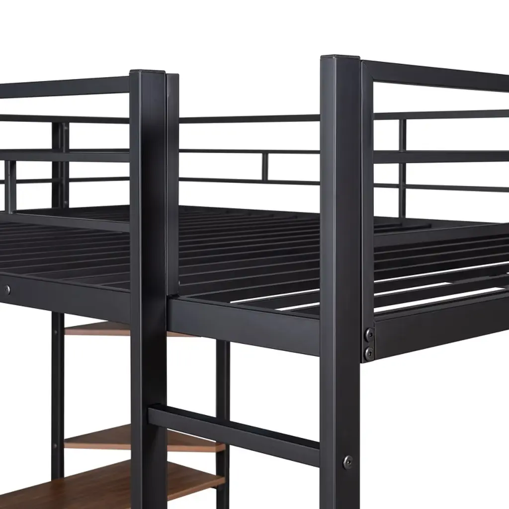 Full Size Metal Loft Bed With 2 Shelves And Desk, High Metal Frame With -Length Guardrails, Black