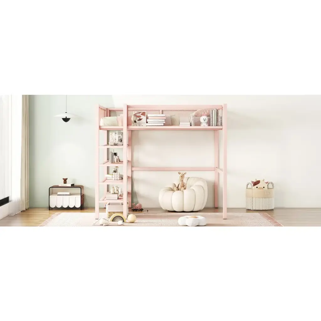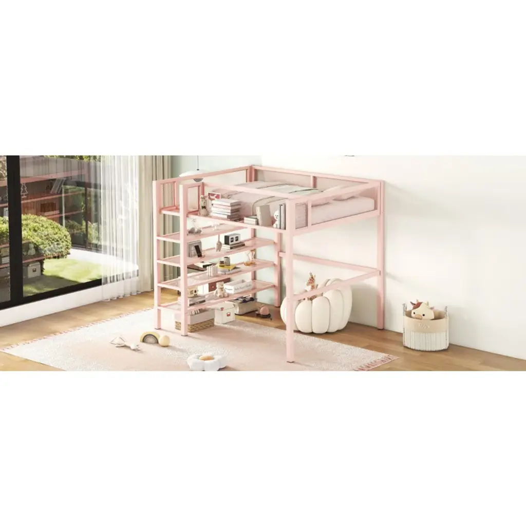 Full Size Metal Loft Bed With 4-tier Shelves And Storage