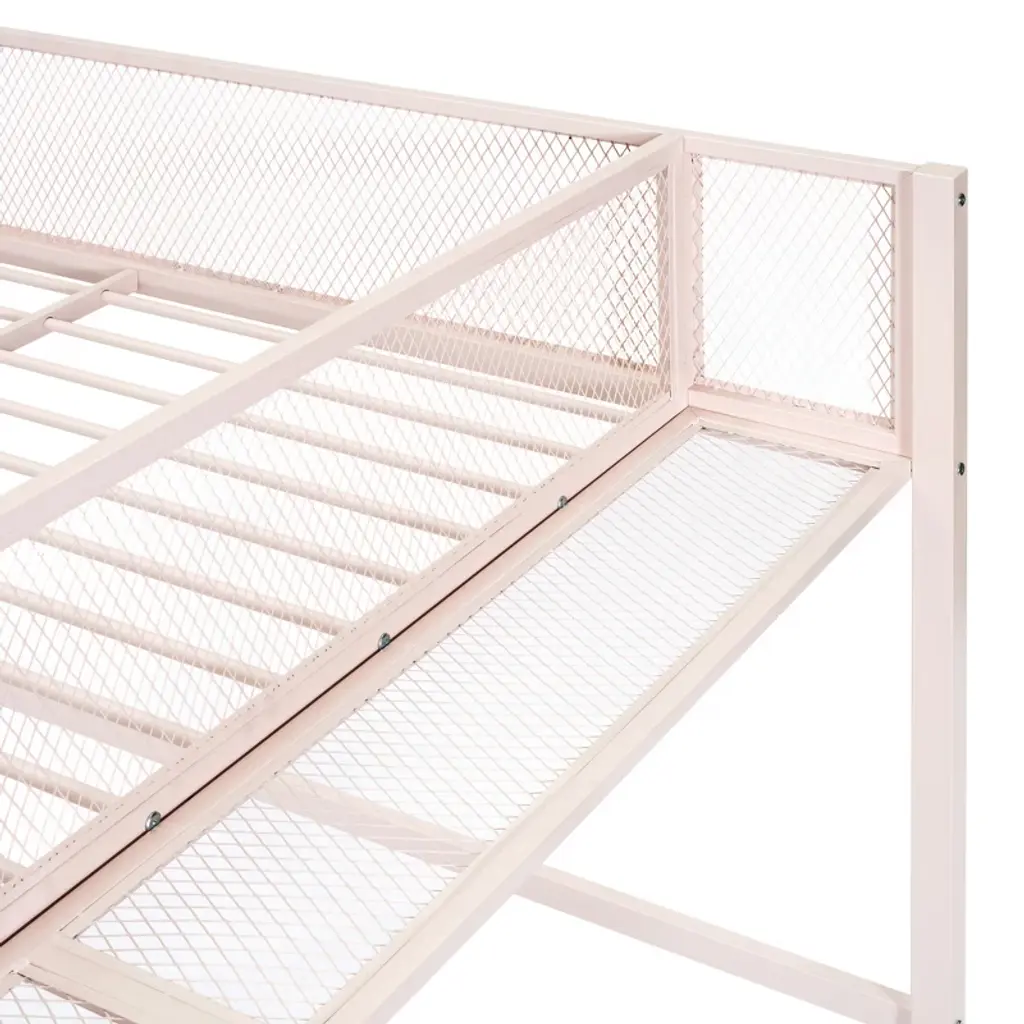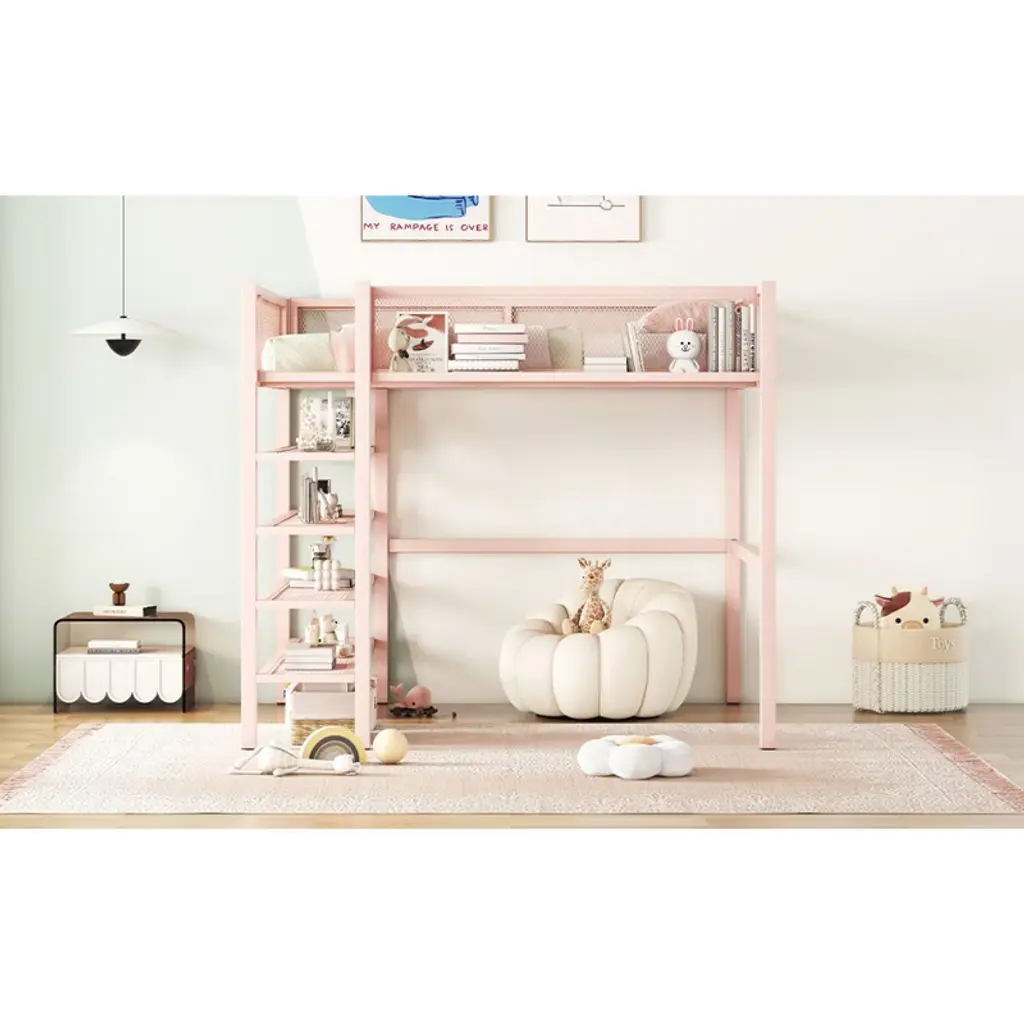Product Features [Modern Style] Crafted of metal in a clean painted finish, this bed strikes a clean-lined silhouette with a horizontal slatted headboard and footboard, matching guard rail, which can be matched with any room decor. The raised base creates a cozy loft space for storage or play.[Creative Structure] This loft bed is built with a comfortable sleeping space with a spacious and useful workstation and bookshelf underneath. With this collection, you can turn space into a workstation, a reading nook or a craft area.[Good Stability] It features an easy to climb 4-step ladder, a full-length guardrail, 20 secured heavy-duty metal slats, and a support bar for added security. (no foundation or box spring needed).[Storage Space] It has 4-tier open shelves to lay out what you want. The shelves can also be used as a ladder, which is a creative design. What's more, a storage shelf is provided on the side of the guardrail for your convenience, so you grab things without getting out of the bed.[Overall Dimensions] Overall Product Dimension:77.4"L x 66.9"W x 66.5"H. Mattress not included. Some assembly is required, although we have provided clear instructions and tools. Descriptions This twin size metal loft bed with storage space is made with sturdy metal and has a clean-cut silhouette that can be matched with any room decoration. It has 4-tier open shelves and a storage shelf beside the bed guardrail. It is easy for you to pick up things without getting out of the bed. With this collection, you can turn any space into a workstation, a reading nook or a lounge area. Weight & Dimensions Overall Product Dimension: 77.4"L x 66.9"W x 66.5"HDetail Product Dimension: Please refer to the Size imageNumber of Package: 2Package Dimension: Please refer to the SpecificationOverall Product Weight: 127.87 LBSPackage Weight: Please refer to the SpecificationWeight Capacity: bed: 350 LBS; Multi layer storage rack:44LBS; Bedside storage rack:66LBSRecommended age: 6+Recommended Mattress Thickness: 6" Specifications Product Type: Loft BedSize: FullMaterial: MetalNumber of Slats: 20Notes: Manual measurement has been used, there may be some reasonable error. All the pictures are taken by actual samples, slight chromatic aberration may occur due to lighting or display.