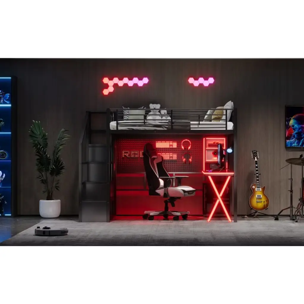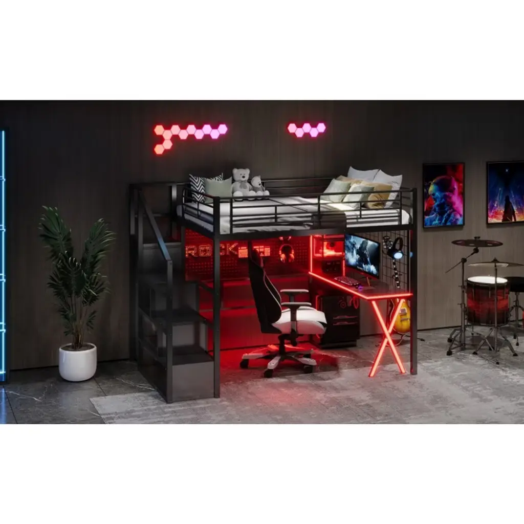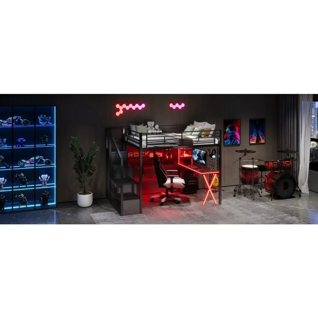 Product Features [Space-saving Design] There is a desk, wardrobe and storage shelves under the bed for you to study or place daily supplies. Making full use of space, this bed will save much space, perfect for small room.[Storage Wardrobe and Staircase] The wardrobe comes with its own clothes rack, and the built-in staircase can be used as both a staircase and a storage space for you to store daily necessities.[LED Workstation] This loft bed includes a built-in desk, 2 storage shelves and 1 computer host shelf and 2 grid boards. With the LED light strips on the X-shaped table legs and the edges of desks and shelves, you can turn the underspace into a clever workstation, a reading nook or a craft area.[Safety Guaranteed] Full-length guardrails on the upper bed prevent accidental falls. The staircase tightly attaches to the bed for easy access and wobble-free footing.[Easy to Assemble] All parts included in your package are indicated clearly. With step-by-step installation manual and per-drilled holes, you can easily assemble this bed individually. Descriptions A gaming bed, desk and wardrobe built into one. This metal loft gaming bed collection provides the perfect space saving solution for any kids bedroom. The built-in LED desk with 2 storage shelves and 1 computer host shelf and 2 grid boards, will be your clever workstation. Strong metal+MDF frame that includes an integrated ladder, full-length guardrails and secured slats to ensure security and stability. No additional box spring or foundation required. Description Material: Metal+MDFSize: FullNumbers of Package: 2Spring Box: No needAssembly Required: Yes Dimensions Overall Product Dimension: 94''L x 55.98''W x 67.9''HFull Bed: 75.2'' x 54''Total Height: 67.9''Number of Bed Slats: 20pcsRecommend Mattress Thickness of Bed: 6-8''Overall Product Weight: 210lbsBed Weight Capacity: 250lbs