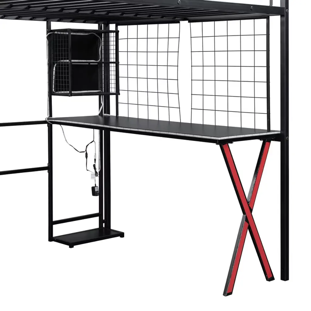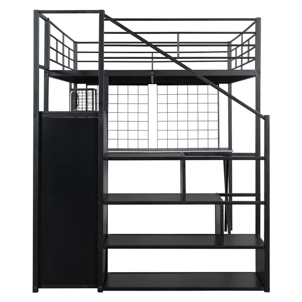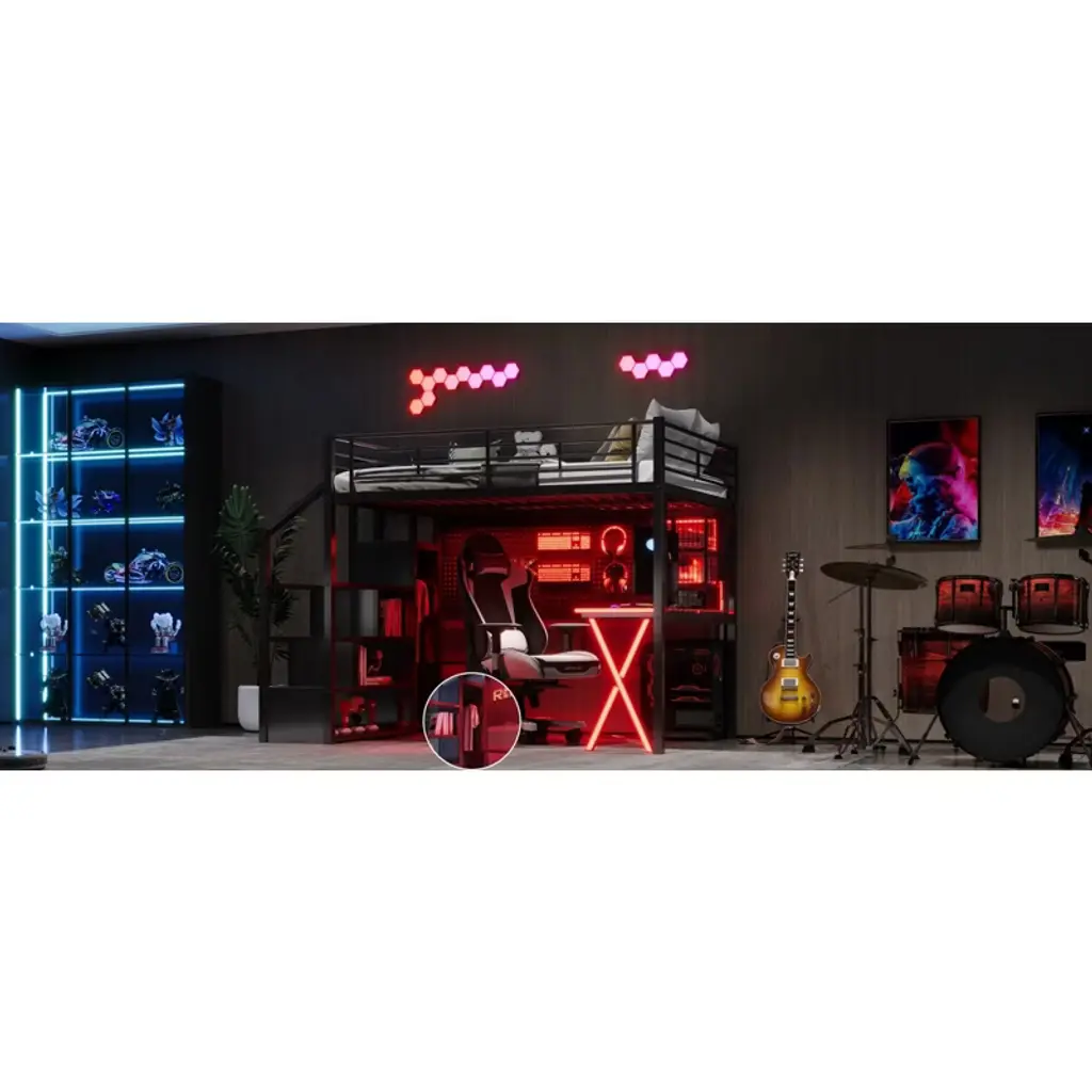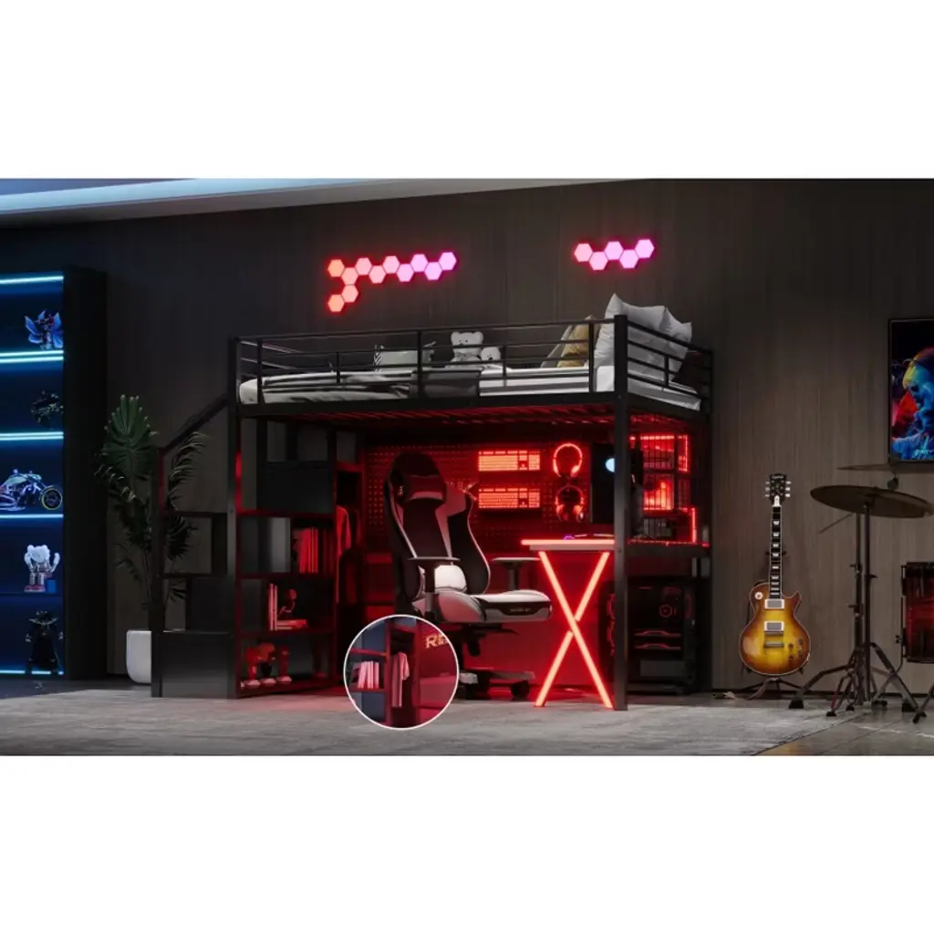 Product Features [Space-saving Design] There is a desk, wardrobe and storage shelves under the bed for you to study or place daily supplies. Making full use of space, this bed will save much space, perfect for small room.[Storage Wardrobe and Staircase] The wardrobe comes with its own clothes rack, and the built-in staircase can be used as both a staircase and a storage space for you to store daily necessities.[LED Workstation] This loft bed includes a built-in desk, 2 storage shelves and 1 computer host shelf and 2 grid boards. With the LED light strips on the X-shaped table legs and the edges of desks and shelves, you can turn the underspace into a clever workstation, a reading nook or a craft area.[Safety Guaranteed] Full-length guardrails on the upper bed prevent accidental falls. The staircase tightly attaches to the bed for easy access and wobble-free footing.[Easy to Assemble] All parts included in your package are indicated clearly. With step-by-step installation manual and per-drilled holes, you can easily assemble this bed individually. Descriptions A gaming bed, desk and wardrobe built into one. This metal loft gaming bed collection provides the perfect space saving solution for any kids bedroom. The built-in LED desk with 2 storage shelves and 1 computer host shelf and 2 grid boards, will be your clever workstation. Strong metal+MDF frame that includes an integrated ladder, full-length guardrails and secured slats to ensure security and stability. No additional box spring or foundation required. Description Material: Metal+MDFSize: FullNumbers of Package: 2Spring Box: No needAssembly Required: Yes Dimensions Overall Product Dimension: 94''L x 55.98''W x 67.9''HFull Bed: 75.2'' x 54''Total Height: 67.9''Number of Bed Slats: 20pcsRecommend Mattress Thickness of Bed: 6-8''Overall Product Weight: 210lbsBed Weight Capacity: 250lbs