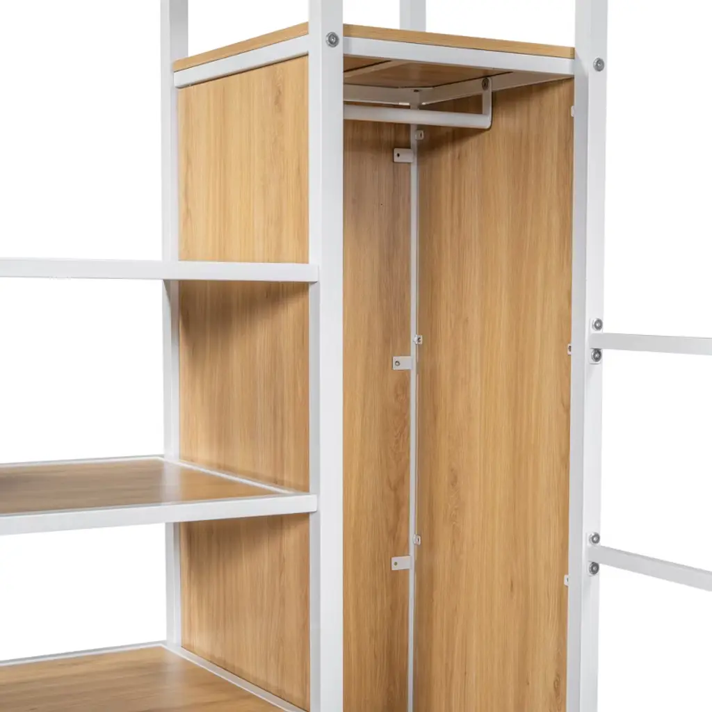 Product Features [Space-saving Design] There is a desk, wardrobe and storage shelves under the bed for you to study or place daily supplies. Making full use of space, this bed will save much space, perfect for small room.[Storage Wardrobe and Staircase] The wardrobe comes with its own clothes rack, and the built-in staircase can be used as both a staircase and a storage space for you to store daily necessities.[LED Workstation] This loft bed includes a built-in desk, 2 storage shelves and 1 computer host shelf and 2 grid boards. With the LED light strips on the X-shaped table legs and the edges of desks and shelves, you can turn the underspace into a clever workstation, a reading nook or a craft area.[Safety Guaranteed] Full-length guardrails on the upper bed prevent accidental falls. The staircase tightly attaches to the bed for easy access and wobble-free footing.[Easy to Assemble] All parts included in your package are indicated clearly. With step-by-step installation manual and per-drilled holes, you can easily assemble this bed individually. Descriptions A gaming bed, desk and wardrobe built into one. This metal loft gaming bed collection provides the perfect space saving solution for any kids bedroom. The built-in LED desk with 2 storage shelves and 1 computer host shelf and 2 grid boards, will be your clever workstation. Strong metal+MDF frame that includes an integrated ladder, full-length guardrails and secured slats to ensure security and stability. No additional box spring or foundation required. Description Material: Metal+MDFSize: FullNumbers of Package: 2Spring Box: No needAssembly Required: Yes Dimensions Overall Product Dimension: 94''L x 55.98''W x 67.9''HFull Bed: 75.2'' x 54''Total Height: 67.9''Number of Bed Slats: 20pcsRecommend Mattress Thickness of Bed: 6-8''Overall Product Weight: 210lbsBed Weight Capacity: 250lbs