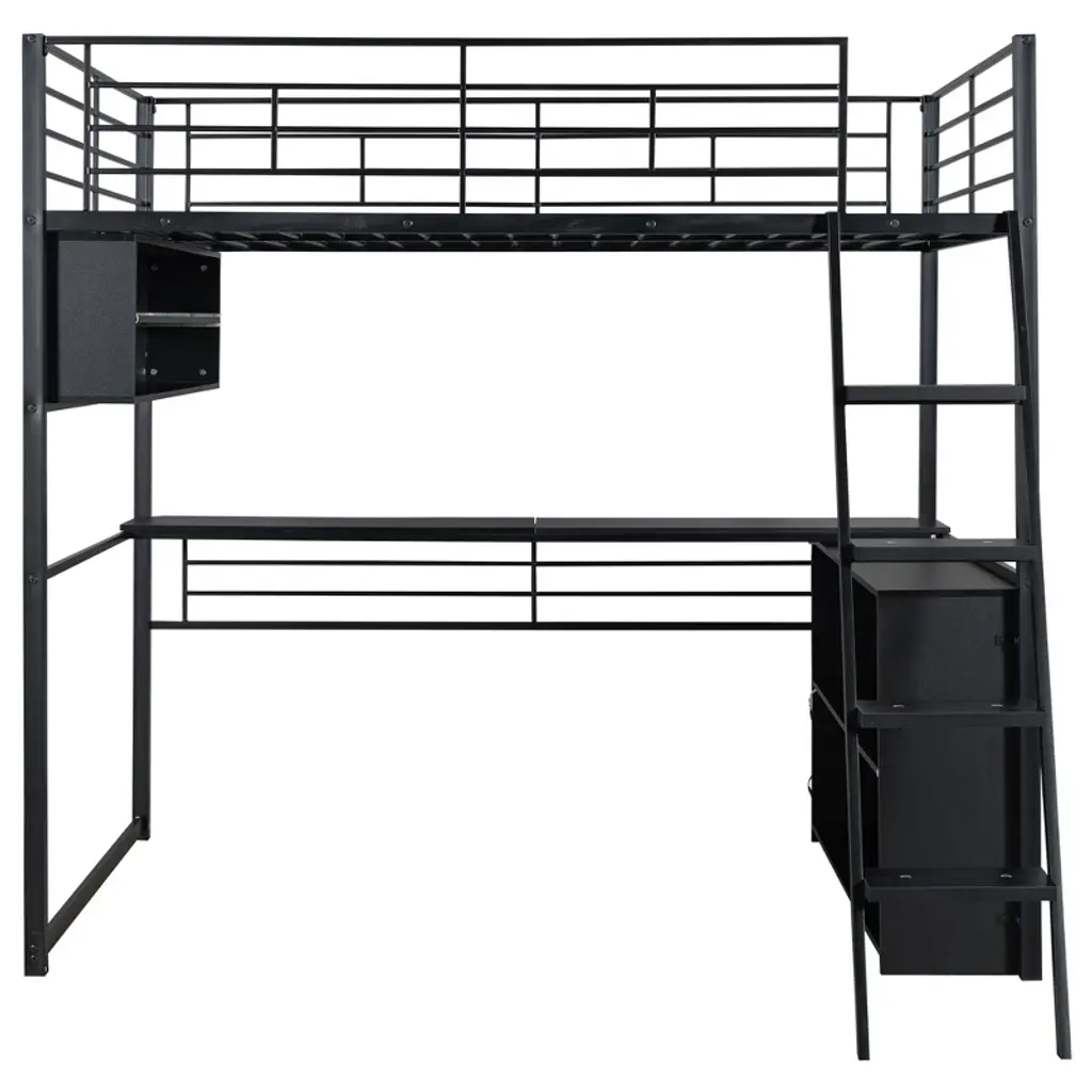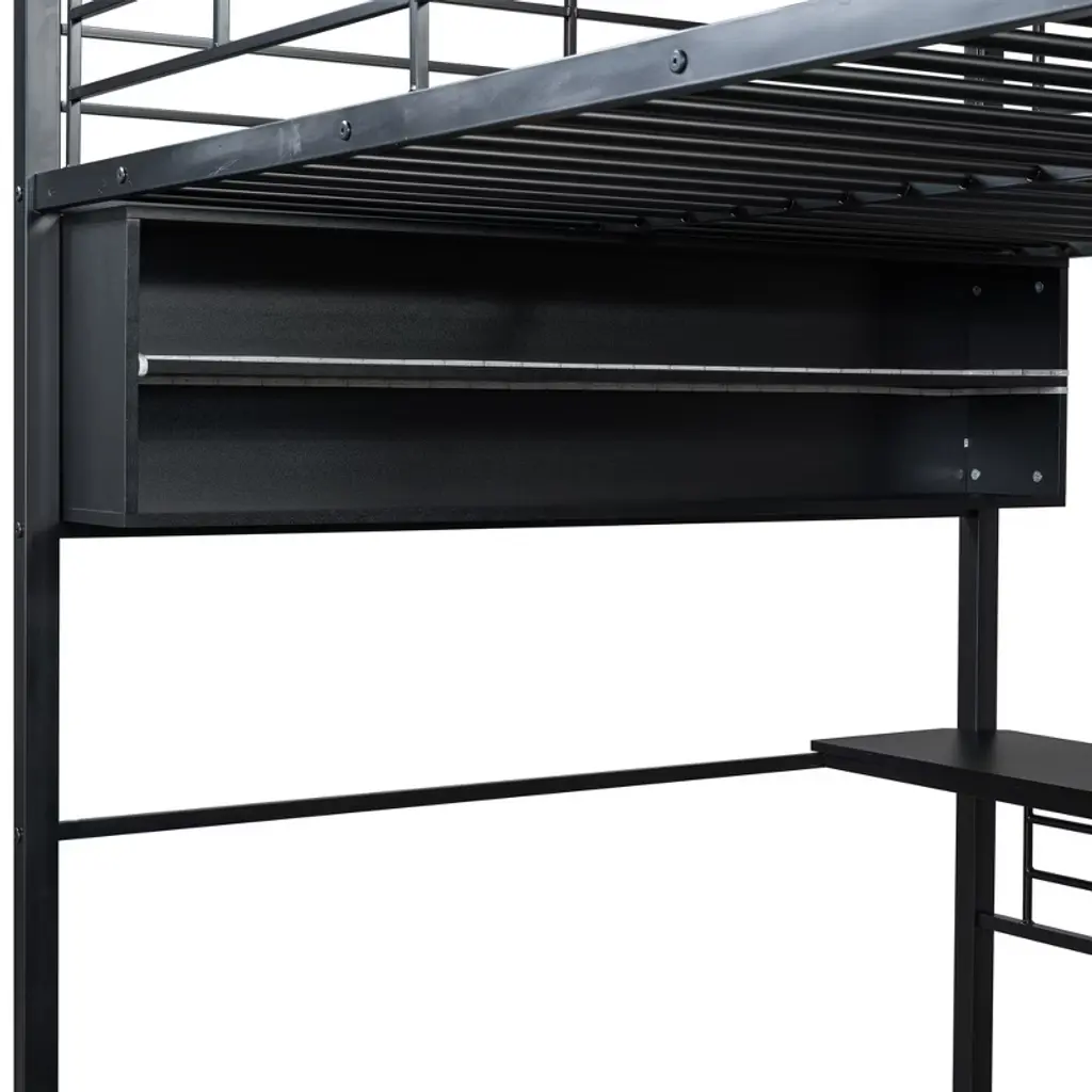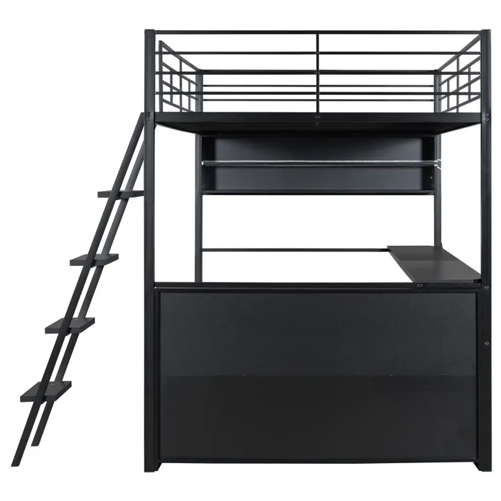 Product Features [Space-saving Design] There is a long desk and two 2-tier storage shelves under the bed for you to study or place daily supplies. Making full use of space, this bed will save much space, perfect for small room.[Ample Storage Space] Two 2-tier storage shelves can fully accommodate your bedding, other daily necessities, and books, while also saving space.[LED Design] The LED light strip inside the storage shelves and desk bring convenience to your night life. You can change the 7 colors via the remote control.[Safety Guaranteed] Full-length guardrails on the upper bed prevent accidental falls. The ladder tightly attaches to the bed for easy access and wobble-free footing.[Easy to Assemble] All parts included in your package are indicated clearly. With step-by-step installation manual and pre-drilled holes, you can easily assemble this bed individually. Description This metal loft bed with desk and shelves and ladder is a minimalistic, stylish bed frame that works well with a variety of decorating styles and makes it easy for you to enhance and improve your space. Both the desk and the shelf are equipped with LED light strips, which not only bring convenience to your life but also add different atmosphere to the room with different colors. Featuring strong metal&wood frame and sturdy supporting metal slats, this bed is built to last, ensuring it will accompany you for many years. Description Material: Metal + MDFSize: FullNumbers of Package: 2Spring Box: No needAssembly Required: Yes Dimensions Overall Product Dimension: 77.5''L x 56.4''W x 73.1''HFull Bed: 75.2'' x 54''Total Height: 73.1''Number of Bed Slats: 20 pcsRecommend Mattress Thickness of Bed: 8''Overall Product Weight: 186 lbsBed Weight Capacity: 250 lbs