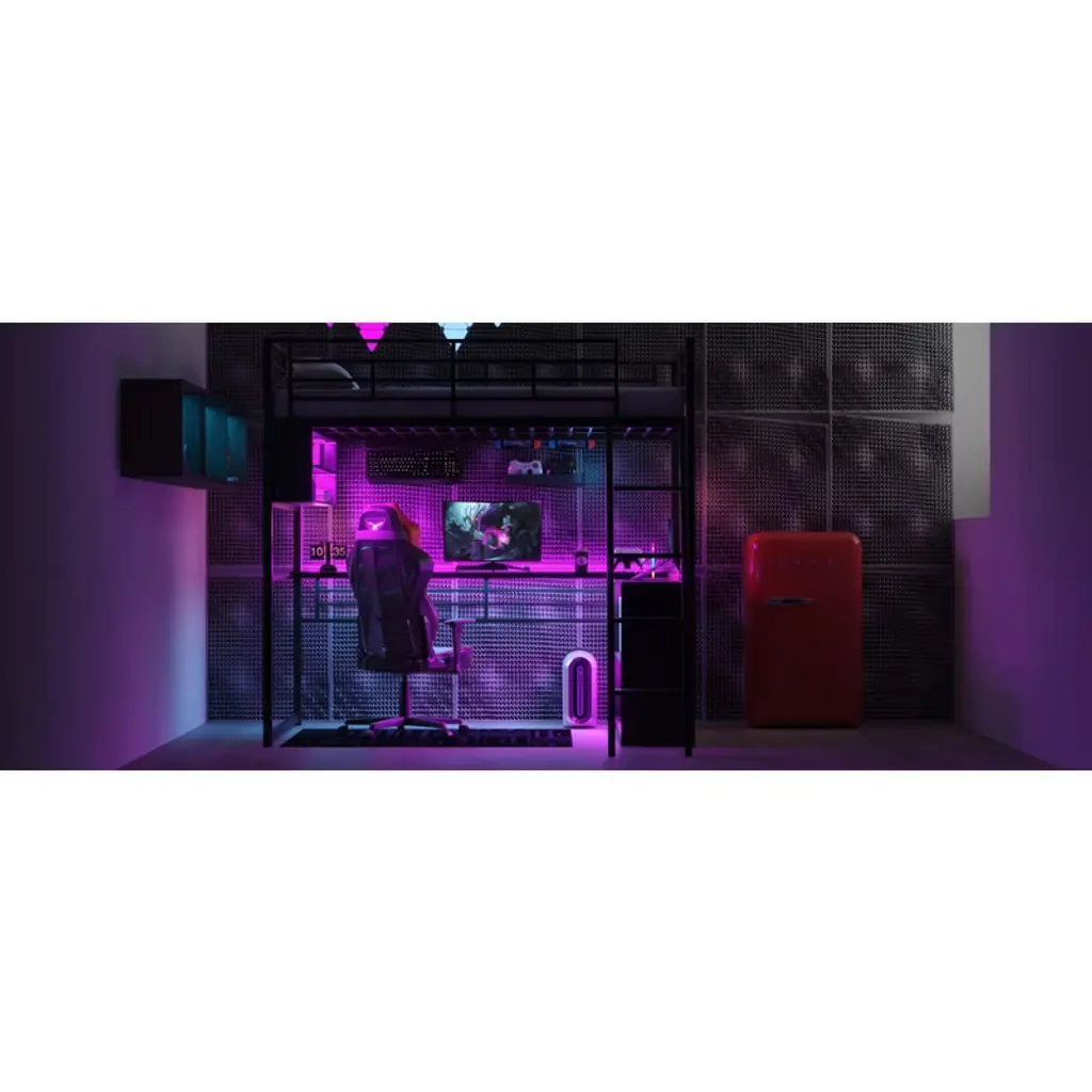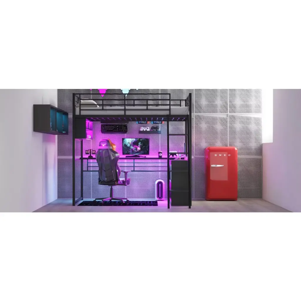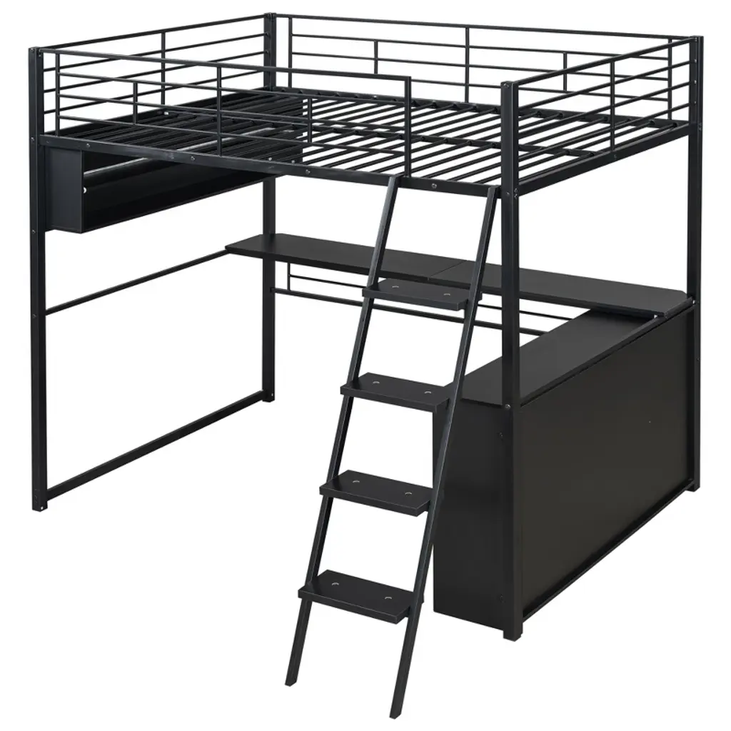 Product Features [Space-saving Design] There is a long desk and two 2-tier storage shelves under the bed for you to study or place daily supplies. Making full use of space, this bed will save much space, perfect for small room.[Ample Storage Space] Two 2-tier storage shelves can fully accommodate your bedding, other daily necessities, and books, while also saving space.[LED Design] The LED light strip inside the storage shelves and desk bring convenience to your night life. You can change the 7 colors via the remote control.[Safety Guaranteed] Full-length guardrails on the upper bed prevent accidental falls. The ladder tightly attaches to the bed for easy access and wobble-free footing.[Easy to Assemble] All parts included in your package are indicated clearly. With step-by-step installation manual and pre-drilled holes, you can easily assemble this bed individually. Description This metal loft bed with desk and shelves and ladder is a minimalistic, stylish bed frame that works well with a variety of decorating styles and makes it easy for you to enhance and improve your space. Both the desk and the shelf are equipped with LED light strips, which not only bring convenience to your life but also add different atmosphere to the room with different colors. Featuring strong metal&wood frame and sturdy supporting metal slats, this bed is built to last, ensuring it will accompany you for many years. Description Material: Metal + MDFSize: FullNumbers of Package: 2Spring Box: No needAssembly Required: Yes Dimensions Overall Product Dimension: 77.5''L x 56.4''W x 73.1''HFull Bed: 75.2'' x 54''Total Height: 73.1''Number of Bed Slats: 20 pcsRecommend Mattress Thickness of Bed: 8''Overall Product Weight: 186 lbsBed Weight Capacity: 250 lbs