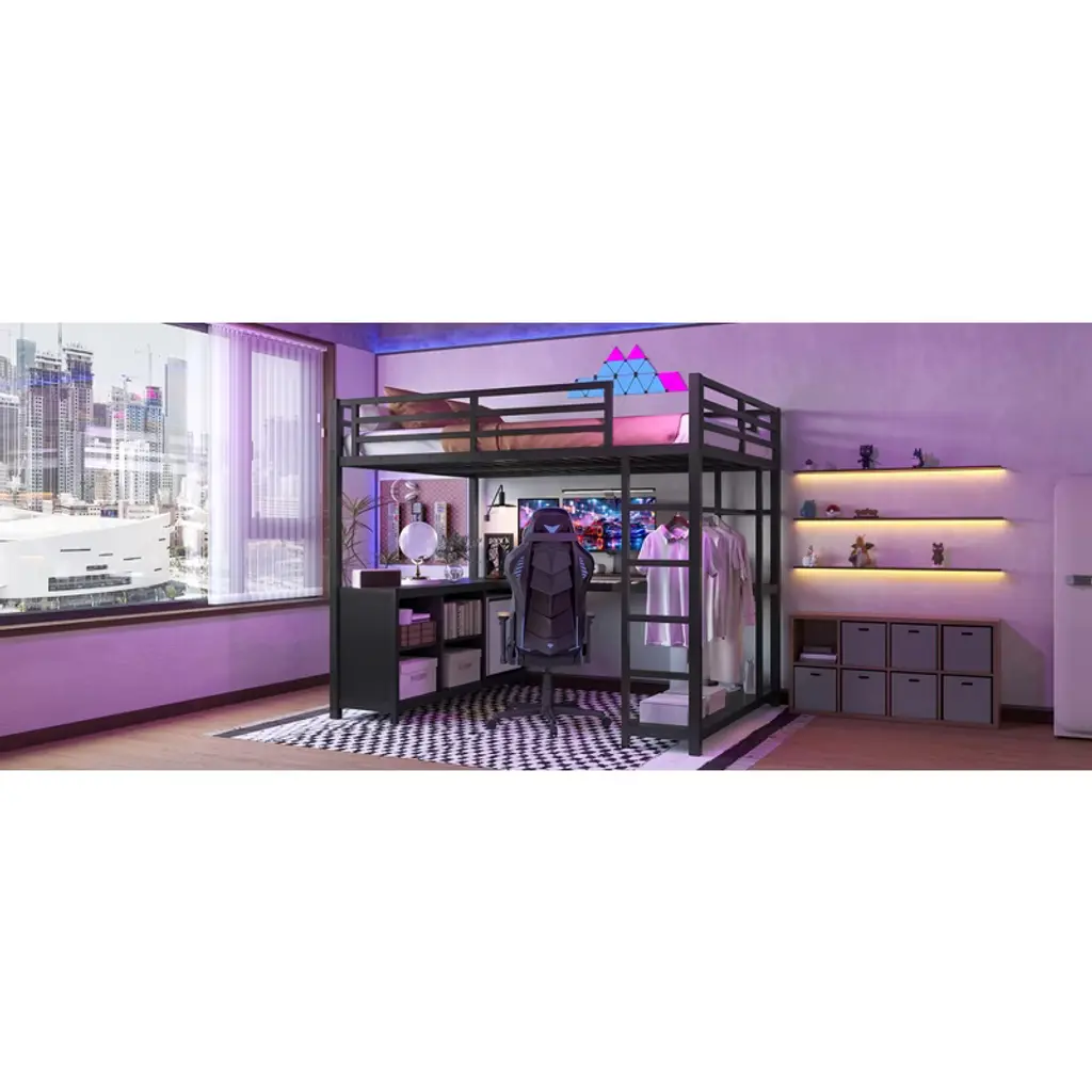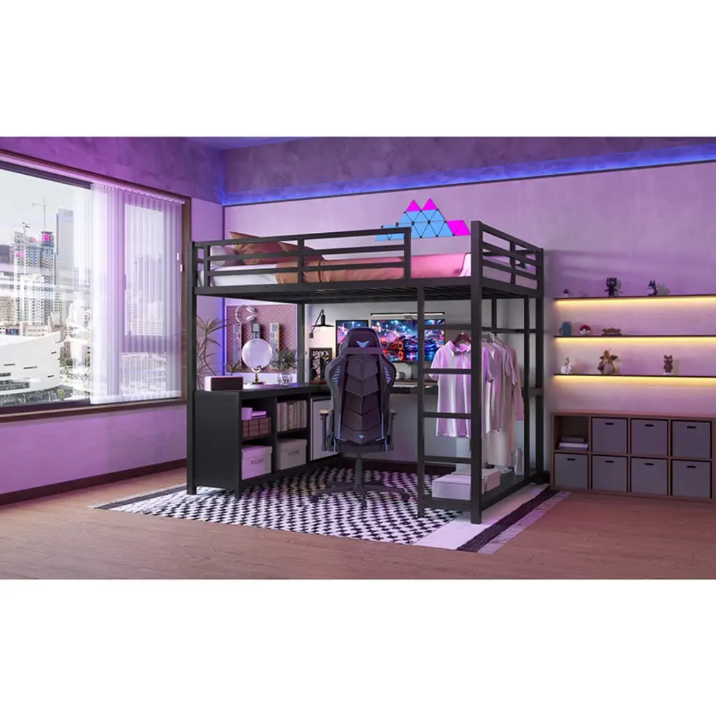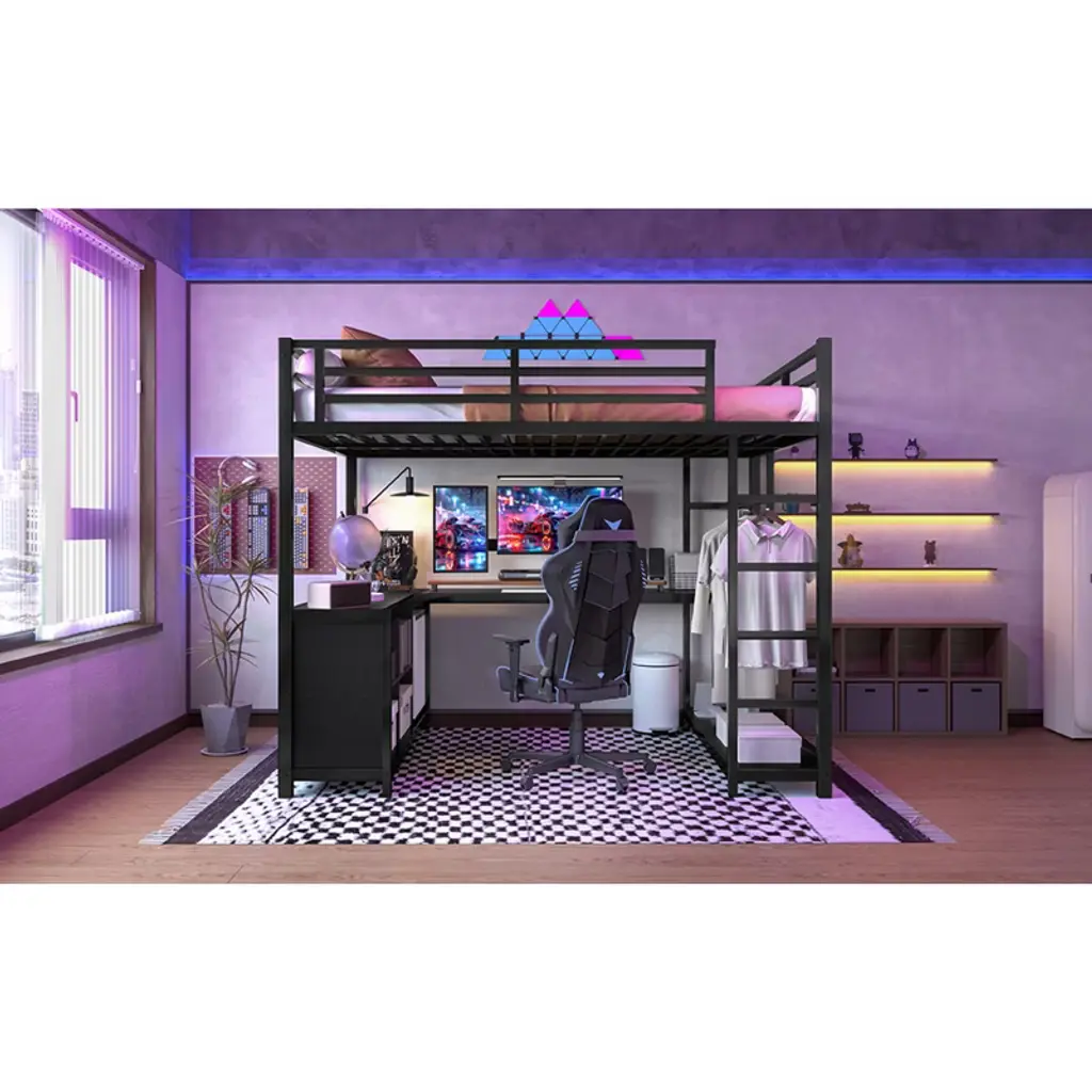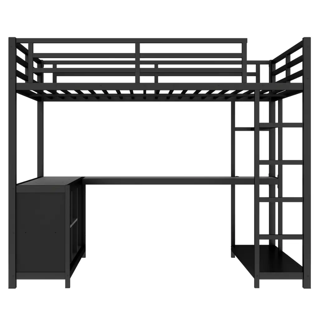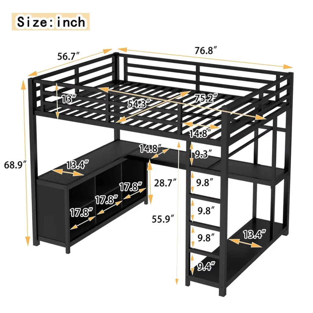 Product Features Modern Style: This full metal loft bed with desk is an ideal gift for a child! The simple and airy look suits any room style. Our loft bed is versatile and perfect for apartments, dorms, and teenage rooms.Full Loft Bed with Wardrobe and Desk: This metal loft bed has a cozy sleeping space, a spacious and practical L-shaped desk that can be used as a workbench or reading area, and the wardrobe can provide a great place for your everyday clothes.Space Saving: This metal bunk loft bed with wardrobe¡¢desk and storage shelves is designed for rooms with limited floor space. It's the perfect addition for growing teens, giving them the freedom to rest and entertain.Solid Metal Loft Bed: The metal loft bed frame is made of sturdy metal for strength and stability, plus it comes with full-length guard rails for your sleeping safety.Easy to Assemble: The packages comes with a clear and detailed assembly instruction guide, and all the necessary tools for you to assemble the metal loft bed immediately. Please kindly note that full loft bed will comes in 2 box. Descriptions This full size loft bed with armoire has an elegant look that will complement any decor. There is an L-shaped desk and 4 storage compartments under the bed for your study or office needs with plenty of storage space. There is an open closet on the side for easy storage of your everyday clothes. This versatile full-size metal loft bed will meet your different needs. Weight & DimensionsProduct Type: Metal Loft BedColor: BlackMaterial: MetalSize: FullOverall Product Dimension: 76.77’’L56.69’’W68.90’’HOverall Product Weight: 156.09 LBSNumber of Package: 2Package Dimension & Weight: Please refer to the SpecificationWeight Capacity: 350LBSRecommend Bed Mattress Thickness: 6''Level of Assembly: Full Assembly NeededEligible for Hardware Packs: YesNote: All the pictures are taken by actual samples, slight chromatic aberration may occur due to lighting or display.