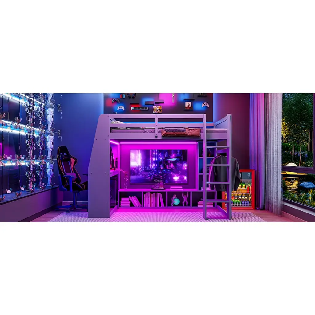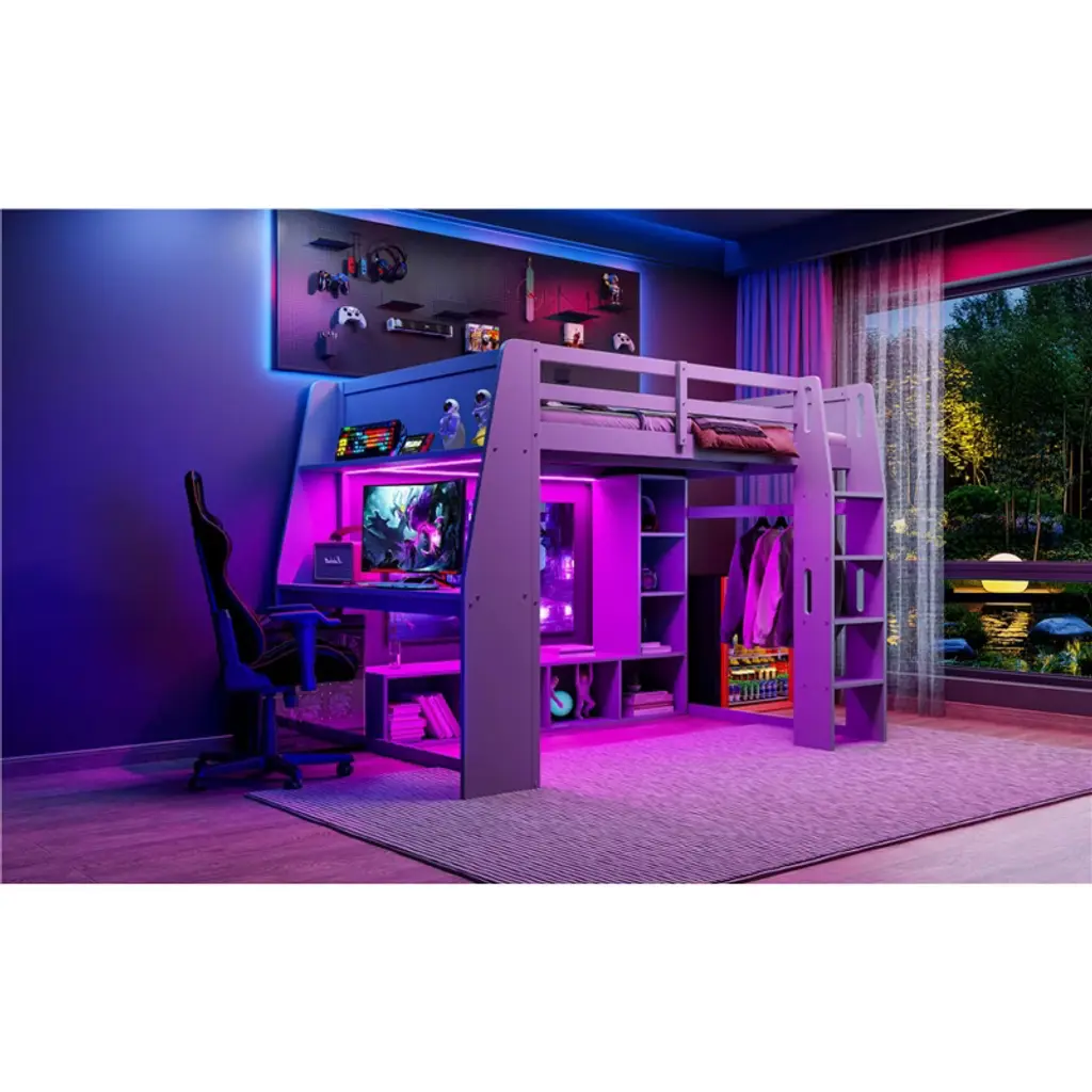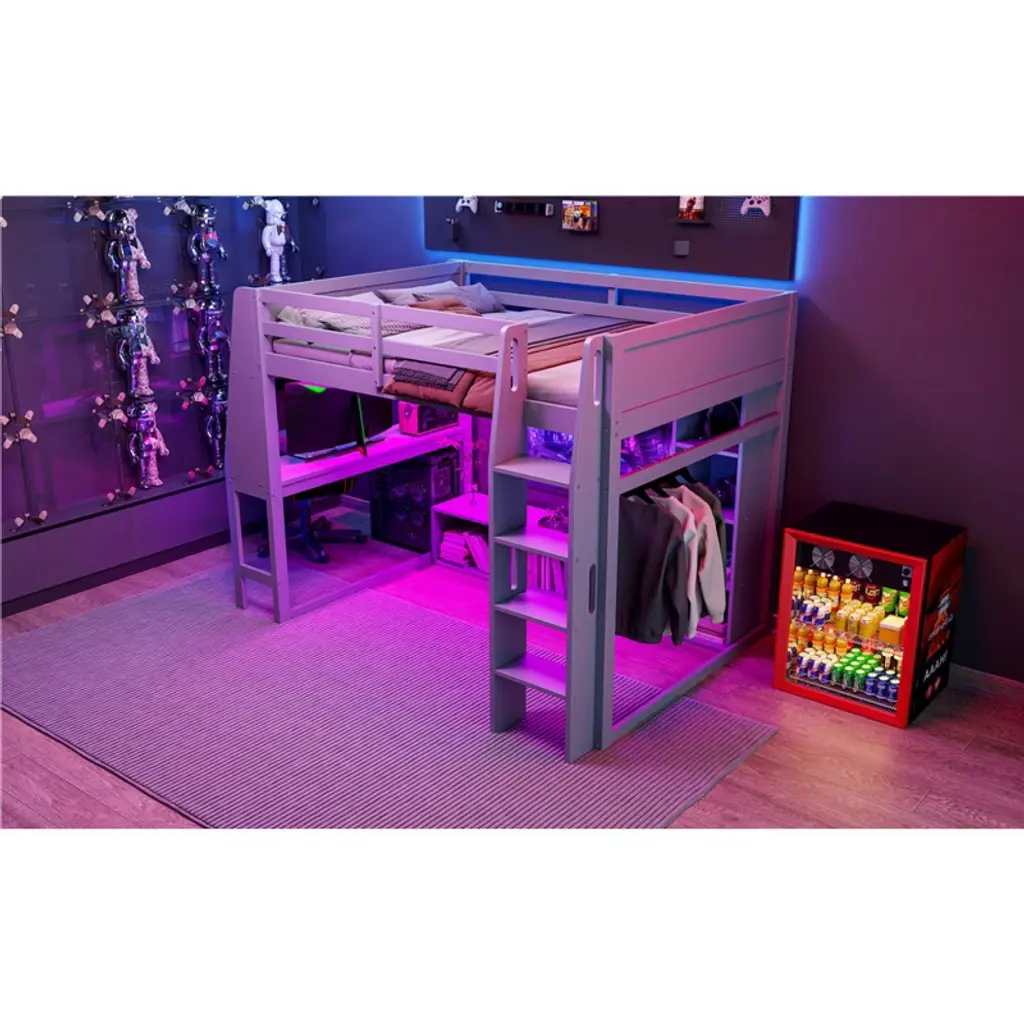 Product Features Space-saving and Multi-function There is a desk and storage cabinets under the bed for you to study or place daily supplies. The hanging clothes rack makes full use of space, you can hang clothes for the next day.Workstation and LED In addition to the sleeping space, the desk is a good helper for your study or leisure. The LED will illuminate activity under your bed or add a sense of ambiance to your room.Ample Storage Space Comes with two sizes of cabinets, this loft bed is great for storing your clothes, toys or books.Sturdy Wood Frame Strong wood frame that includes an integrated ladder, full-length guardrails and secured wood slats to ensure security and stability. No additional box spring or foundation required.No Box Spring Required The wood slats support the mattresses not to slide and increase the service life. Description A gaming bed, desk, hang rack and storage built into one. This wood gaming loft bed collection provides the perfect space saving solution for any kids bedroom. There is a desk next to the bed with its own bookshelf brings convenience to your entertainment or study. Whether you're playing under the bed or organizing things, there will be LED lighting. Specifications Material: Pine Wood + MDFSize: FullNumbers of Package: 2Spring Box: No needAssembly Required: Yes Dimensions Overall Product Dimension: 88.7''L x 63.7''W x 64.9''HFull Bed: 75.7'' x 54.3''Total Height: 64.9''Number of Bed Slats: 14pcsRecommended Mattress Thickness of Bed: 8-10''Overall Product Weight: 212lbsBed Weight Capacity: 350lbs