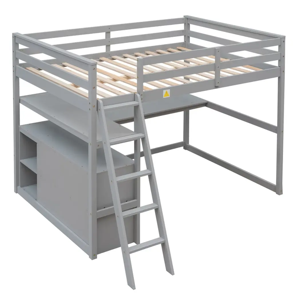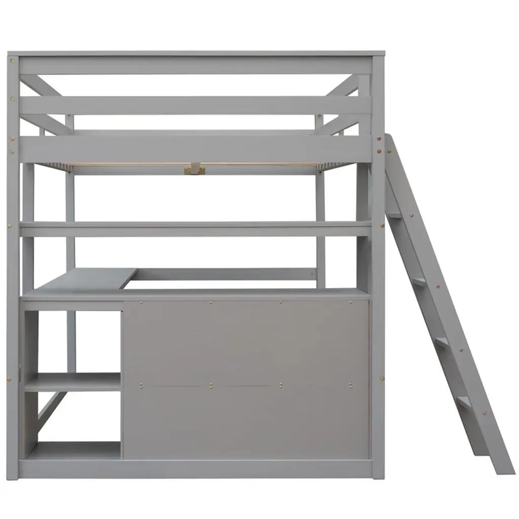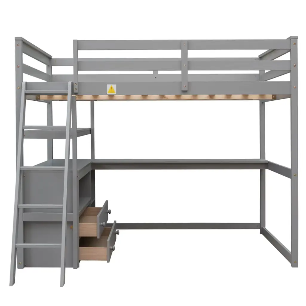 Full Size Wooden Loft Bed With Stair And Desk, High Loftbed With Storage Shelve And Two Drawers For Kids Teens Bedroom, Gray