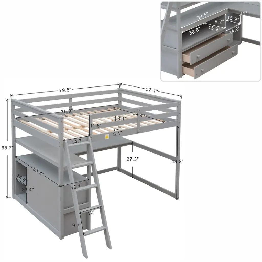 works well with a variety of decorating styles and makes it easy for you to enhance and improve your space. Featuring strong, solid pine wood and sturdy supporting slats, this bed is built to last, ensuring it will accompany you for many years. What's more, this product includes a desk, shelves and two large storage drawers in one.Product Detail:- Product Type:Loft Bed- Size:Full- Overall Product Dimension:79.5"L x 57.1"W x 65.7"H- Overall Product Weight:218 LBS- Detail Dimension: Please refer to the Size picture- Weight Capacity: 250 LBS- Material: Pine Wood+MDF- Recommended Mattress Thickness: 6'' (The mattress is not included)- Number of Packages: 2 (Packages shipped separately may not arrive at the same time, please be patient.)- Assembly Required:YesWhat's in the box:- Bed * 1- Tools included- Instruction manual