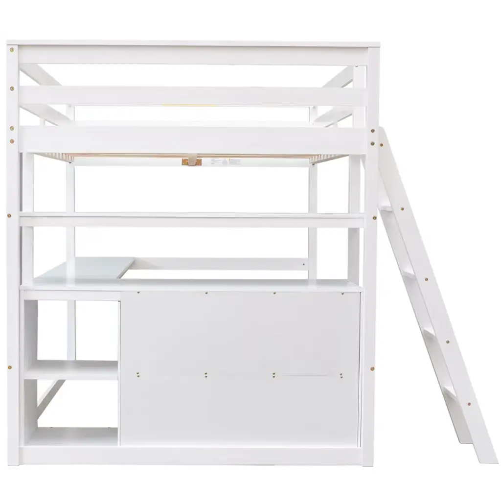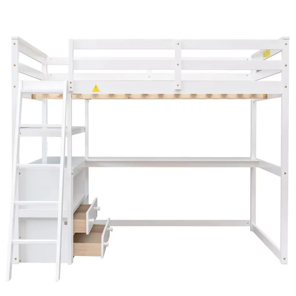 Full Size Wooden Loft Bed With Stair And Desk, High Loftbed With Storage Shelve And Two Drawers For Kids Teens Bedroom, White