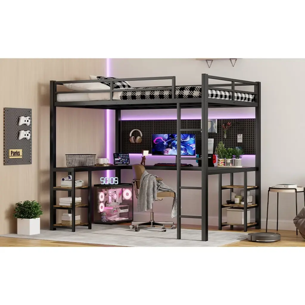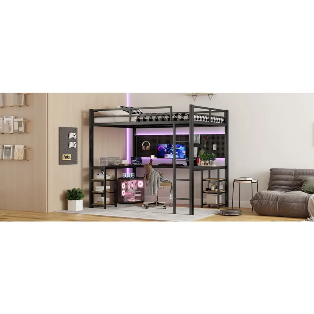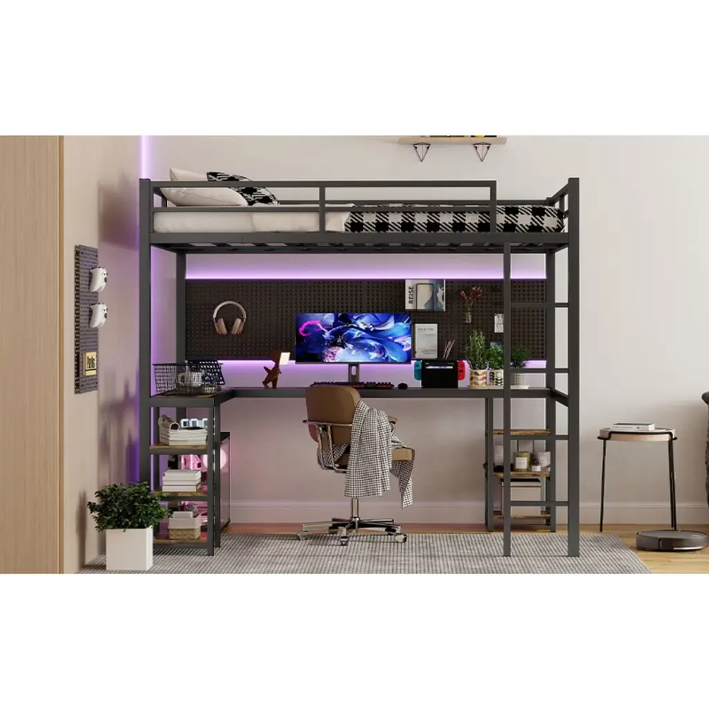 Product Features Loft Bed with Desk: This twin xl loft bed comes with a desk and bookshelf, which can meet your office/study needs and save your space by storing items. It is a very good choice for a small bedroom."L"Shaped Loft Bed: This twin xl bed frame creates an L-shaped design in the space below that fits in a corner and is great for those who want to save space. The huge space under this loft bed can be turned into a study or office area , and can also be placed with decorative objects to add flair to the bedroom.High Quality Metal Frame: Sturdy and durable iron frame structure, to ensure your long-term use, high-quality materials are not easy to rust and paint, so that your bed after a long time as new generalSturdy & Secure Loft Beds: This loft bed is a great safety product with sturdy protective guardrails on all four sides of the upper bed to prevent accidental falls while sleeping or turning around, ensuring you stay safe and secure. The sturdy metal legs made of steel add strength and durability.Easy Assembly: Assembly is required, and each order comes with a clear and detailed assembly guide with all the necessary tools to get your bed assembled in no time. If you have any questions, please contact our customer service immediately and we will help you solve them as soon as possible. Descriptions This is a versatile twin xl loft bed with a desk and storage shelf, made of sturdy metal with a clear silhouette. We designed this loft bed with our customers' safety in mind, using a full-length guardrail design so you can have a restful night's sleep. The space under the loft bed is ideal for small bedrooms, saving space for additional placement of study or office areas, and you can decorate it to your liking. the L-shaped desk creates a semi-enclosed space for better study and office work. The surface of the desk is made of high quality wood panel, which can bear the weight of more books and decorations. Weight & Dimensions Product Type: Metal Loft Bed FrameSize: Twin XLProduct Material: MetalColor: BlackOverall Product Dimension: 83.54"L x 40.94"W x 69.13"HOverall Product Weight: 106.48 LBSDetail Product Dimension: Please refer to the Size imageNumber of Package: 2Package Dimension: Please refer to the SpecificationPackage Weight: Please refer to the SpecificationWeight Capacity: 250lbs for upper bedRecommended Mattress Thickness: 6'' for upper bedNumber of Slats: 10pcsBox Spring Required: NoAssembly Required: YesNotes: Manual measurement has been used, there may be some reasonable error.All the pictures are taken by actual samples, slight chromatic aberration may occur due to lighting or display.