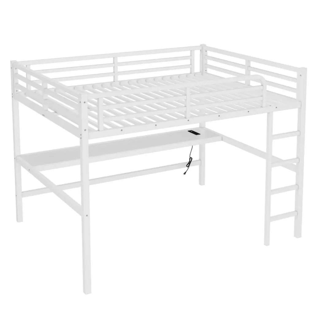 Jujabu Queen Size White Metal Loft Bed With Power Outlet And Lighted, Space-saving