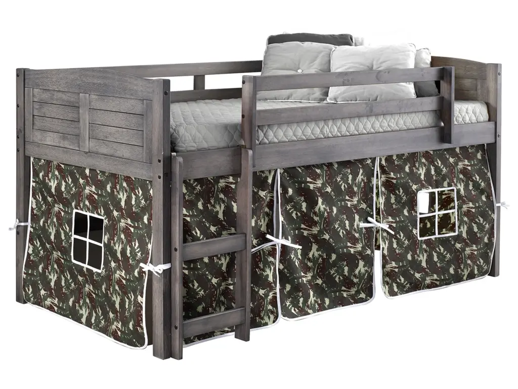 Create the bedroom of their dreams with this louvered twin low loft bed with tent. Quality crafted with pine wood for sturdy construction made for years of enjoyment, this loft bed offers space-saving convenience. The tent creates a hidden space under the bed that's great for "camping in," play time, toy storage and more.