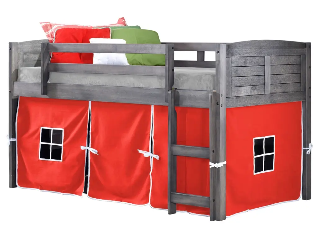 Create the bedroom of their dreams with this louvered twin low loft bed with tent. Quality crafted with pine wood for sturdy construction made for years of enjoyment, this loft bed offers space-saving convenience. The tent creates a hidden space under the bed that's great for "camping in," play time, toy storage and more.