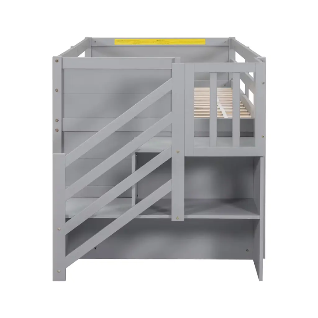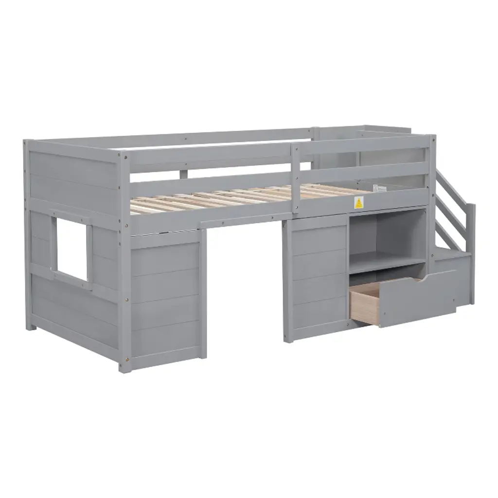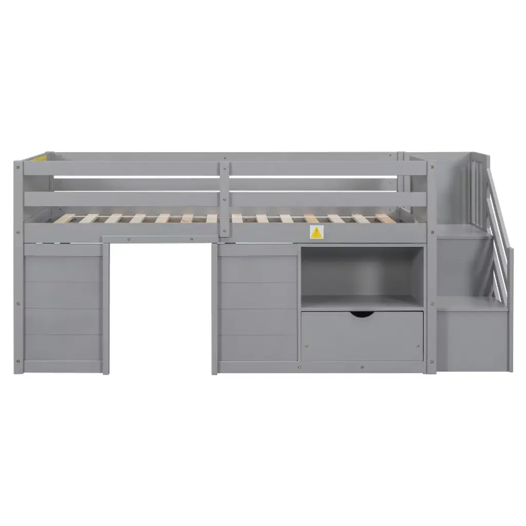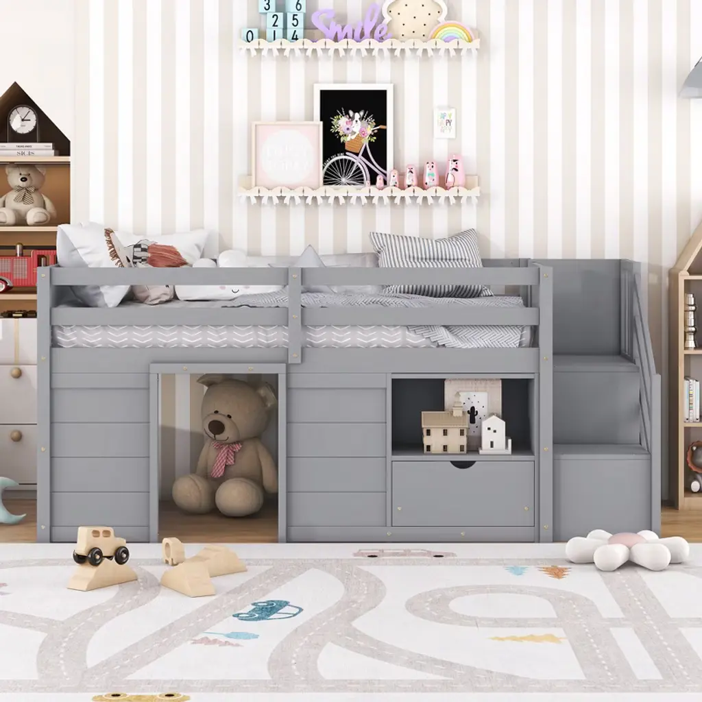 Kwpzqeb Low Loft Bed Twin Size With Storage Stairs, Wooden Twin Size Loft Bed With Bookcase, Drawe, Safety Guardrail & Under-bed Play Space, Gray