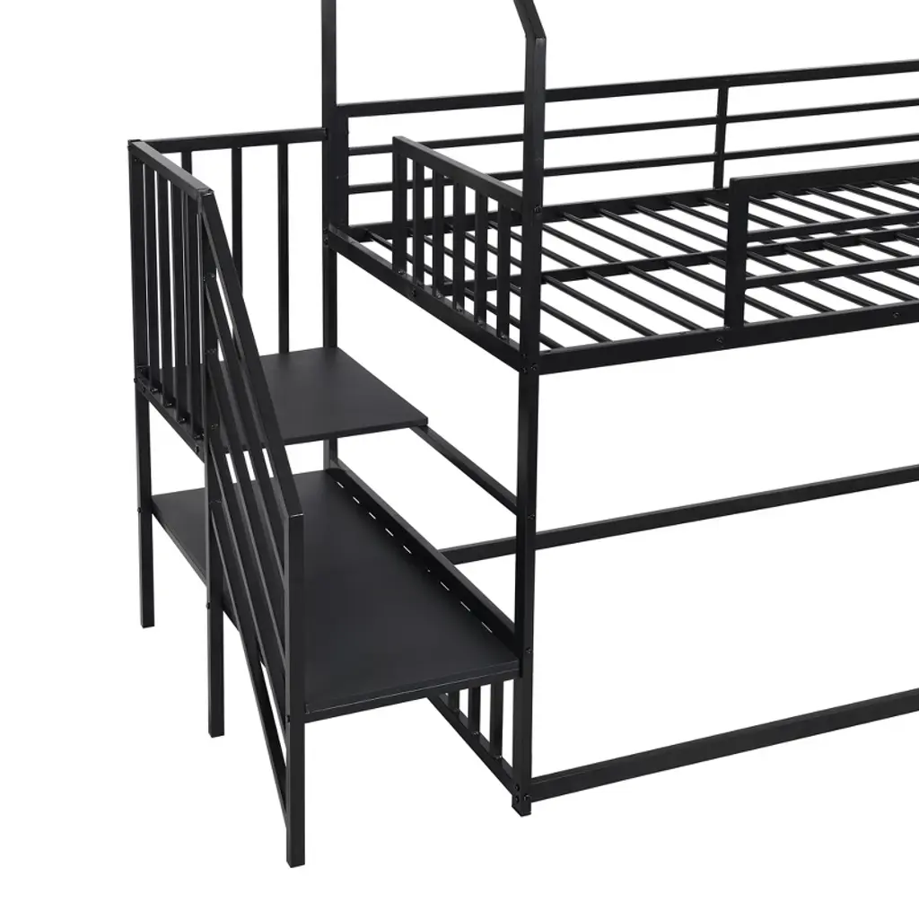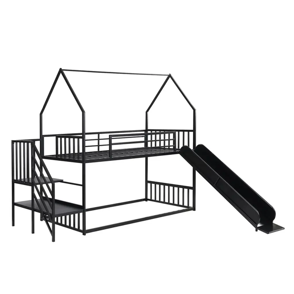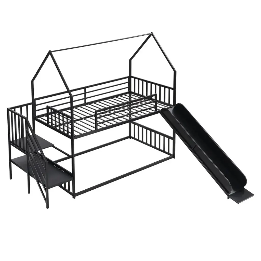 The simple and modern design is suitable for most family. This house-shaped twin room is equipped with two bunk beds to save your floor space. This bunk bed is made of metal and MDF, which has good stability and safety and can withstand high-weight play without dangerous swings. Equipped with people's favorite slides, it is convenient to get out of bed and adds entertainment functions. Combining rest and entertainment functions, this bunk bed with a slide will become a popular item in your bedroom.Product Detail:- Product Type:Bunk Bed- Size:Twin over Twin- Overall Product Dimension:92.5"L x 96.1"W x 78.7"H- Overall Product Weight:128 LBS- Detail Dimension: Please refer to the Size picture- Weight Capacity: (Upper/Down): 250 LBS/no limit- Material: Metal+MDF- Recommended Mattress Thickness: 6'' (The mattress is not included)- Number of Packages: 2 (Packages shipped separately may not arrive at the same time, please be patient.)- Assembly Required:YesWhat's in the box:- Bed * 1- Tools included- Instruction manual