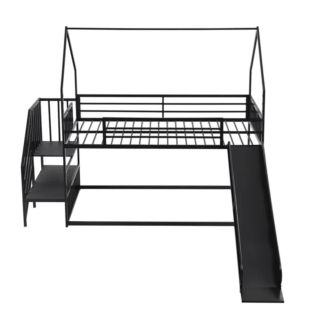 Metal Twin Over Twin House Bunk Bed With Slide And Staircase, Convertible Slide And Staircase Floor Bunk Loft Bed Frame For Kids Teens, Black