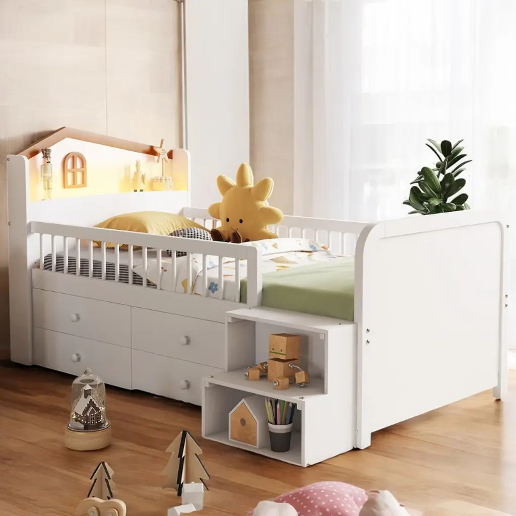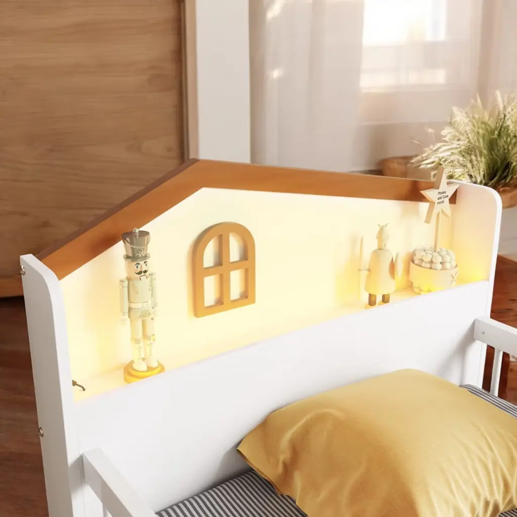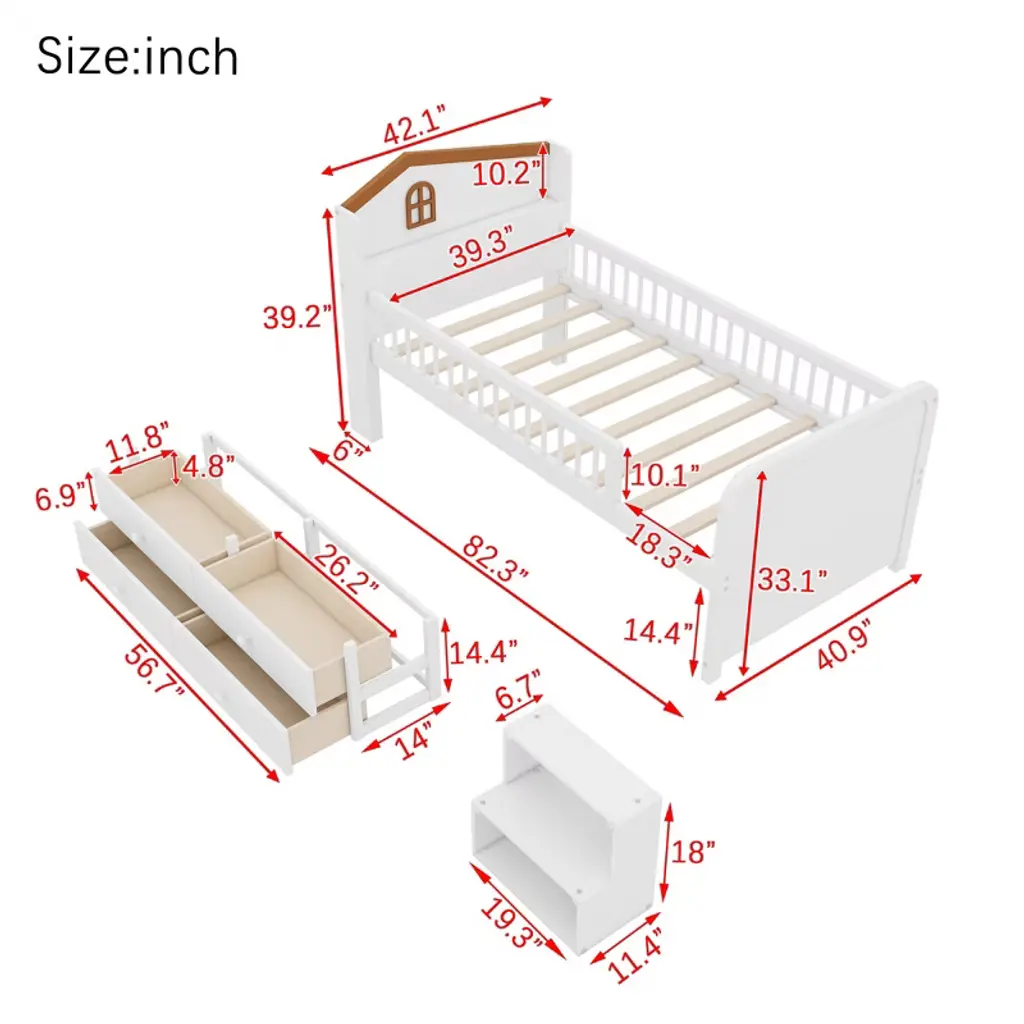 Product Introduction Upgrade your child’s bedroom with this stylish and functional low loft bed. Designed for safety, comfort, and space-saving convenience, this twin-size loft bed features built-in LED lights, a charming house-shaped headboard, and ample storage drawers to keep belongings neatly organized. Crafted from solid pine wood, it offers exceptional stability and durability while maintaining a cozy, inviting atmosphere. Product Features • Built-in LED Headboard – Warm LED light provides a comforting glow for bedtime reading or nighttime safety. • Enhanced Safety – Full-length guardrails and wide, sturdy steps ensure easy and secure access to the bed. Smooth, rounded edges add extra comfort and safety for kids. • Ample Storage Space – Four built-in drawers under the bed offer practical storage for clothes, toys, or bedding, keeping the room tidy and organized. • Charming House Design – Unique headboard with a window detail adds playful style while providing a small ledge for personal items like clocks or books. • Solid Pine Construction – Built with premium solid pine, MDF, and durable slats for a strong, stable, and long-lasting bed frame. Specifications • Overall Dimensions: 82.3"L x 42.1"W x 39.2"H • Product Weight: 121 lbs • Gross Weight: 140.92 lbs • Bed Size: Twin • Materials: Solid Pine + MDF + Polywood • Weight Capacity: 300 lbs • Recommended Mattress Thickness: 6" (mattress not included) • Number of Slats: 10 • Number of Packages: 2 • Box Spring: Not required Note Color may vary slightly due to different lighting or display settings.