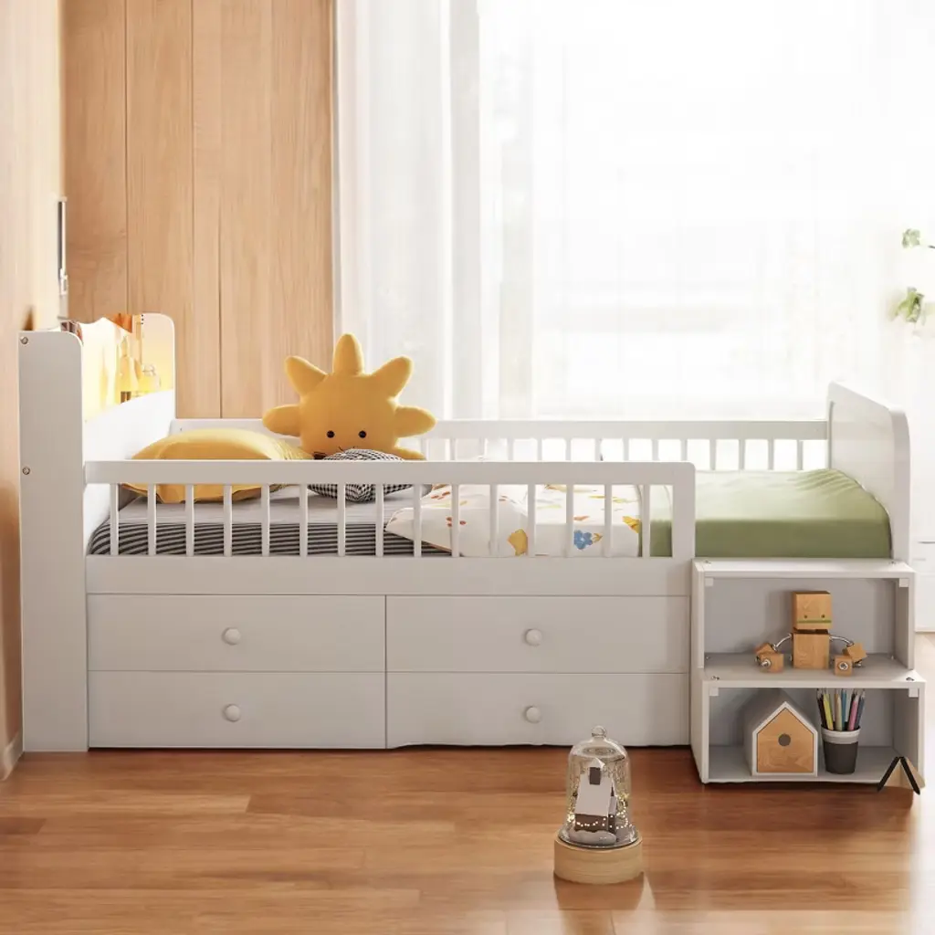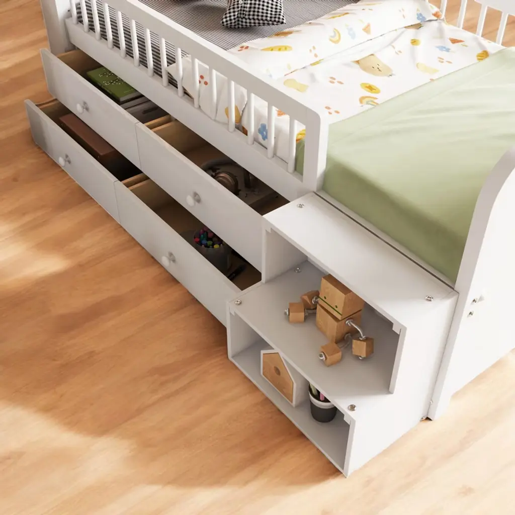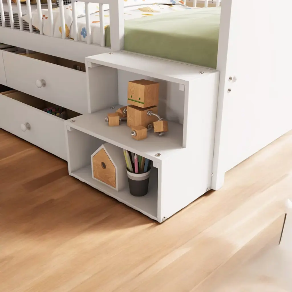 Product Introduction Upgrade your child’s bedroom with this stylish and functional low loft bed. Designed for safety, comfort, and space-saving convenience, this twin-size loft bed features built-in LED lights, a charming house-shaped headboard, and ample storage drawers to keep belongings neatly organized. Crafted from solid pine wood, it offers exceptional stability and durability while maintaining a cozy, inviting atmosphere. Product Features • Built-in LED Headboard – Warm LED light provides a comforting glow for bedtime reading or nighttime safety. • Enhanced Safety – Full-length guardrails and wide, sturdy steps ensure easy and secure access to the bed. Smooth, rounded edges add extra comfort and safety for kids. • Ample Storage Space – Four built-in drawers under the bed offer practical storage for clothes, toys, or bedding, keeping the room tidy and organized. • Charming House Design – Unique headboard with a window detail adds playful style while providing a small ledge for personal items like clocks or books. • Solid Pine Construction – Built with premium solid pine, MDF, and durable slats for a strong, stable, and long-lasting bed frame. Specifications • Overall Dimensions: 82.3"L x 42.1"W x 39.2"H • Product Weight: 121 lbs • Gross Weight: 140.92 lbs • Bed Size: Twin • Materials: Solid Pine + MDF + Polywood • Weight Capacity: 300 lbs • Recommended Mattress Thickness: 6" (mattress not included) • Number of Slats: 10 • Number of Packages: 2 • Box Spring: Not required Note Color may vary slightly due to different lighting or display settings.