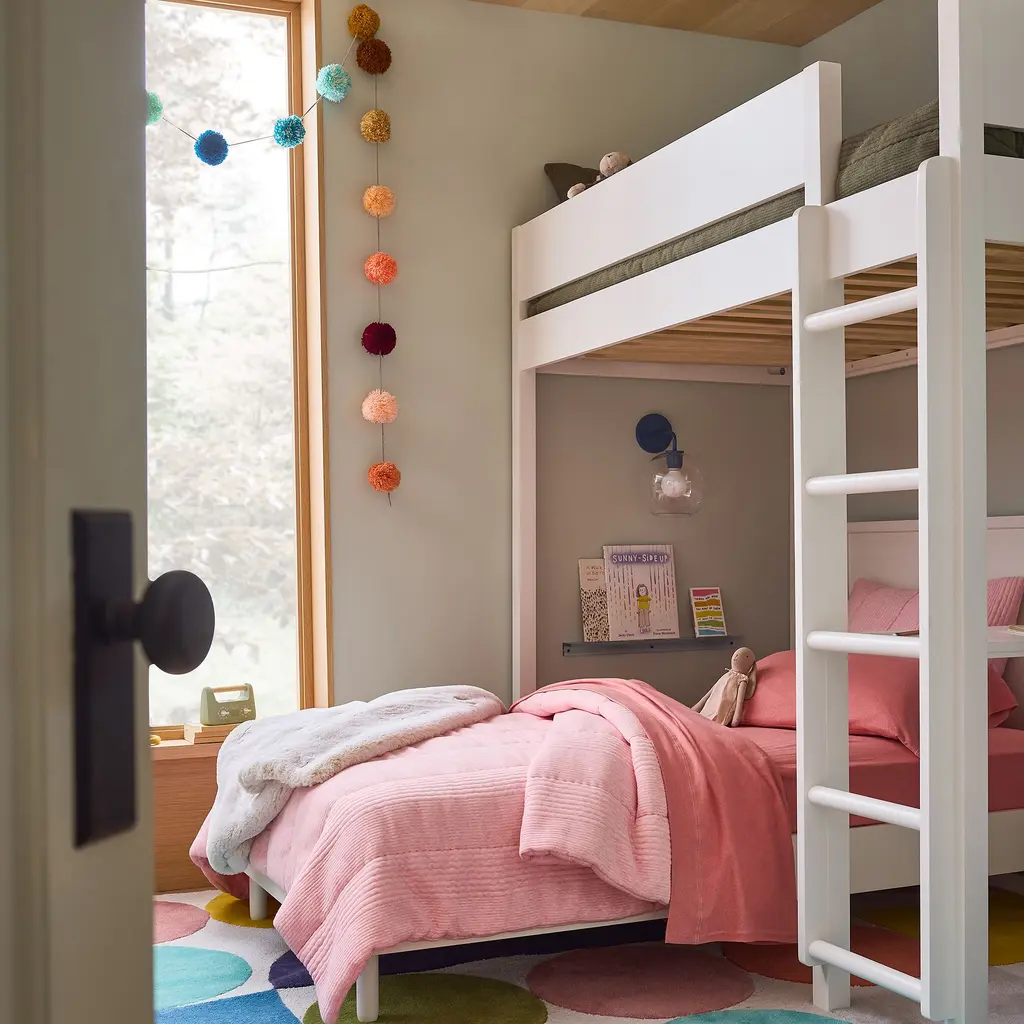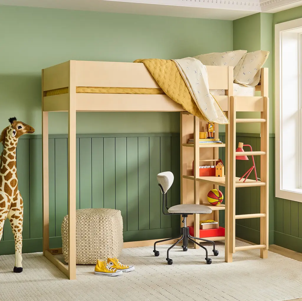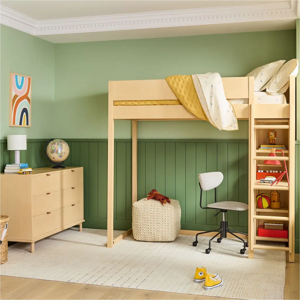 Danish-inspired design brightens rooms. Durably made & covered in child-safe finishes. Lofted design frees up floor space below. GREENGUARD Gold Certified as being low VOC.