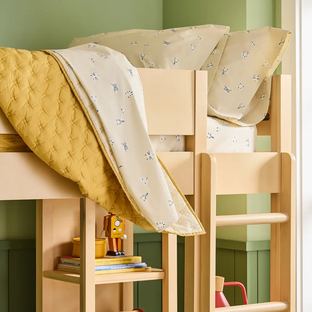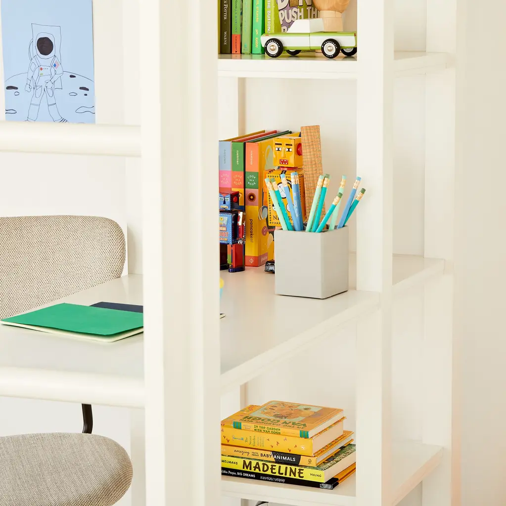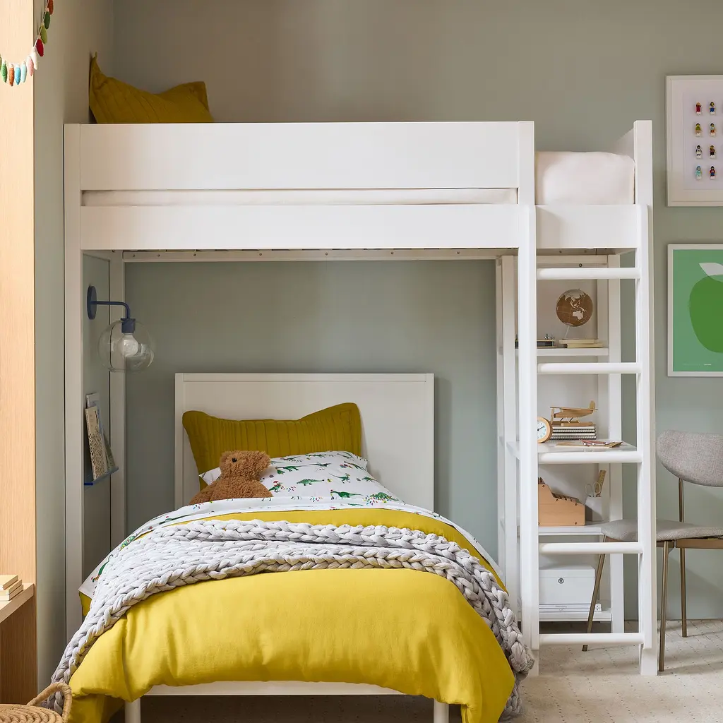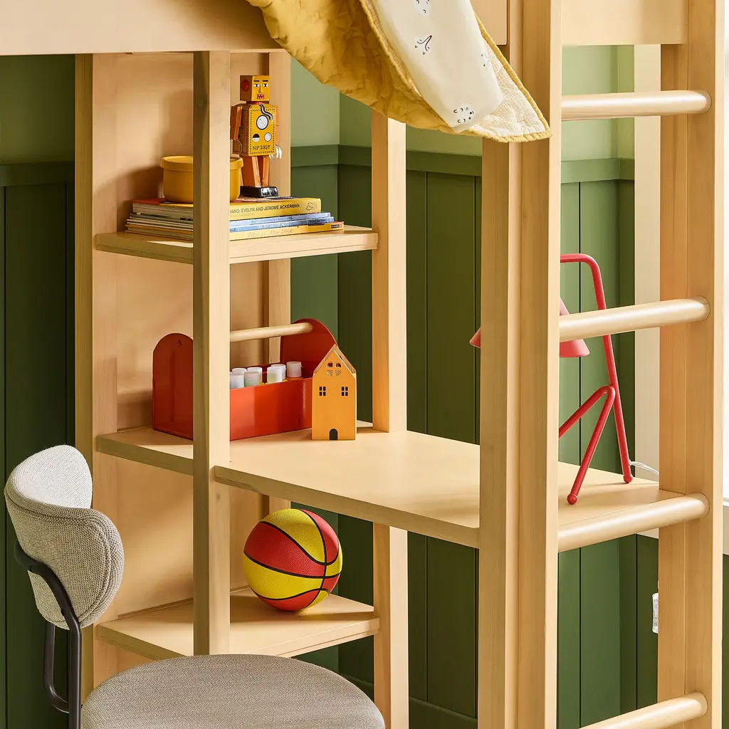 Danish-inspired design brightens rooms. Durably made & covered in child-safe finishes. Lofted design frees up floor space below. GREENGUARD Gold Certified as being low VOC.