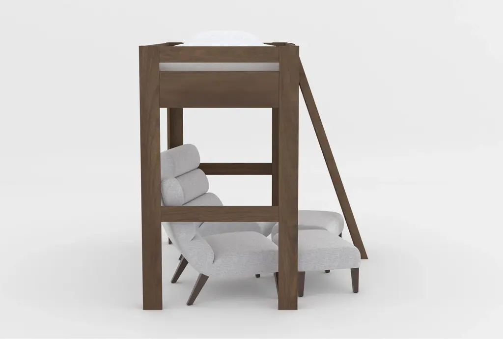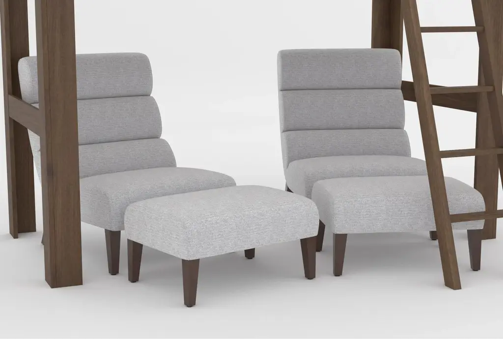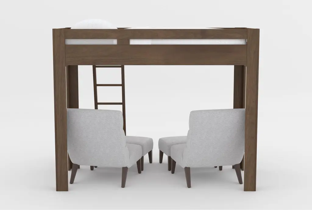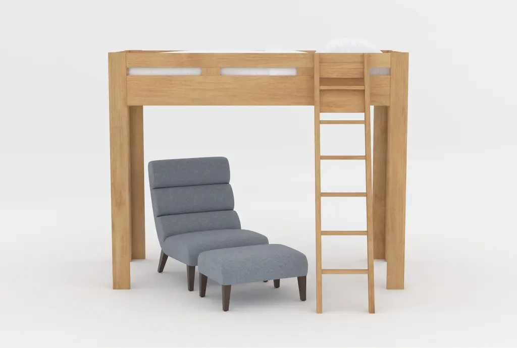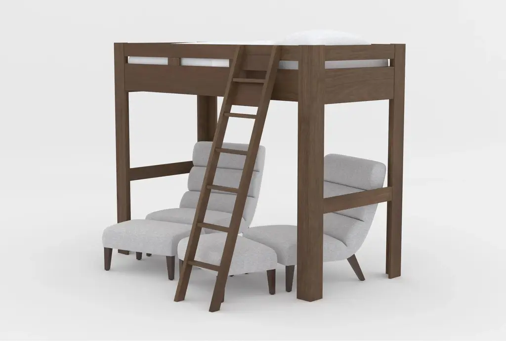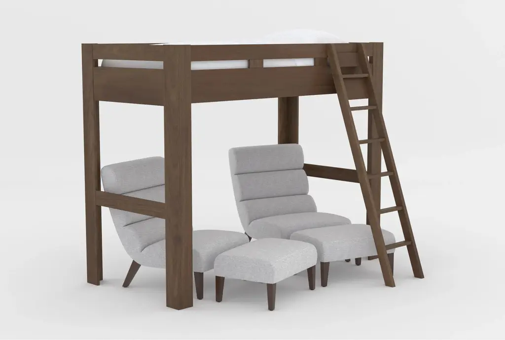 Nora Brown Twin Wood Loft Bed With 2 Lucca Linen Accent Chairs & Ottomans