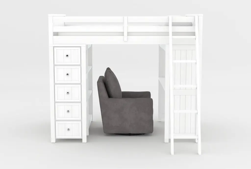 Designed to meet the needs of your family, our Nora bedroom collection invites you to create a space where your kids can relax, learn, play and grow. Each piece is constructed to ensure the utmost safety and durability with solid pine and cathedral oak veneers. Versatile, functional and streamlined, this collection offers multiple finishes and items to choose from, so you can get everything you need. A switchable ladder can be used on either side of the bed. The Lucca accent chairs and ottomans pair perfectly.