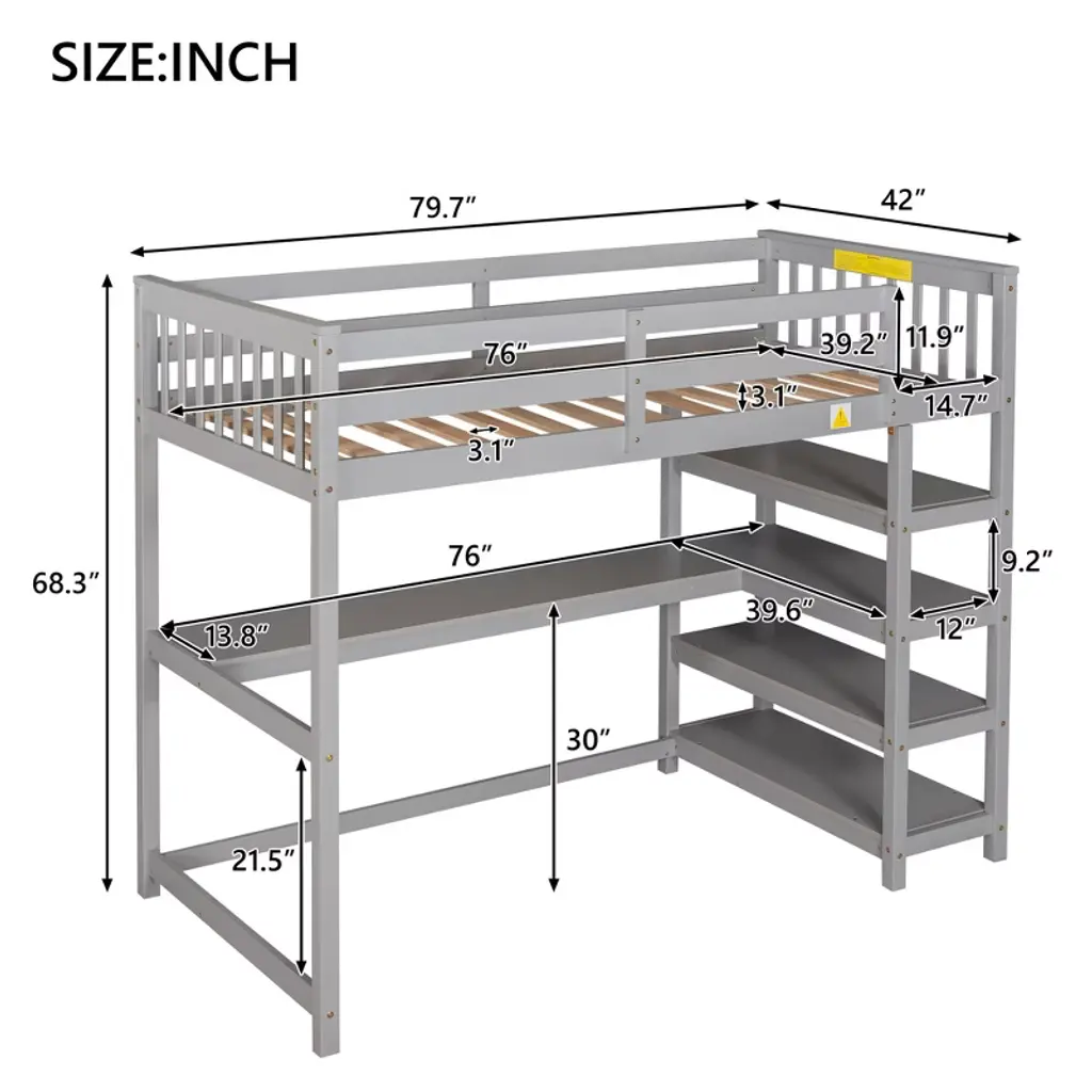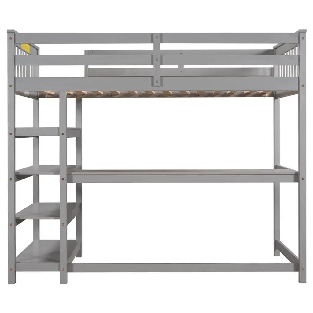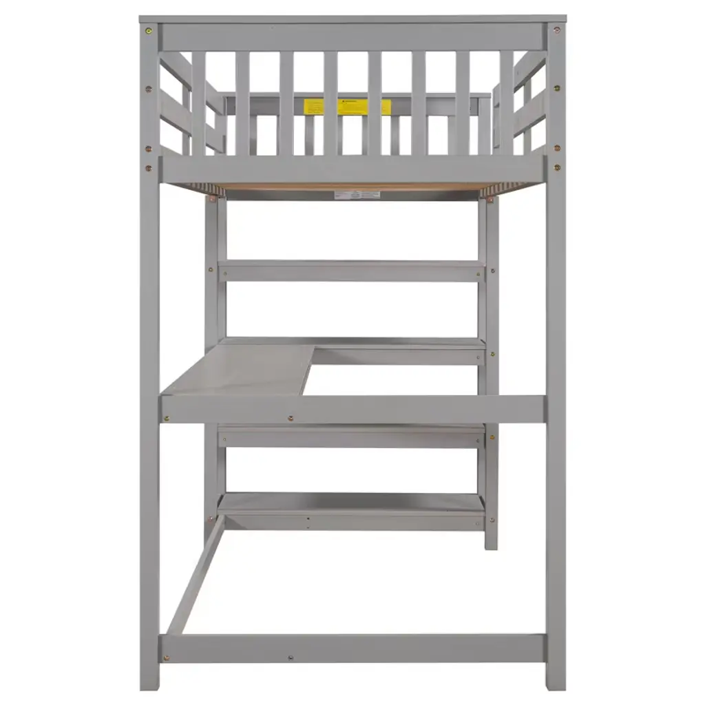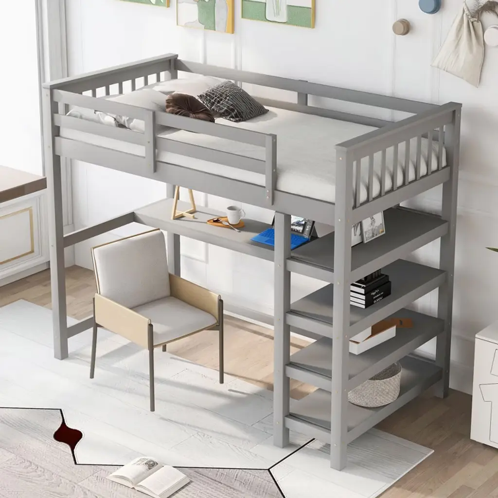 Okak 79.7in Twin Size Loft Bed With L-shape Desk, Twin Bed With Safety Guardrails And Storage Shelves, Loft Bed With Stairs For Bedroom, Gray