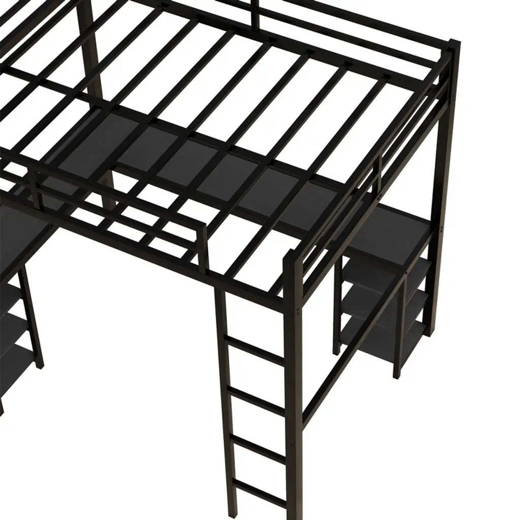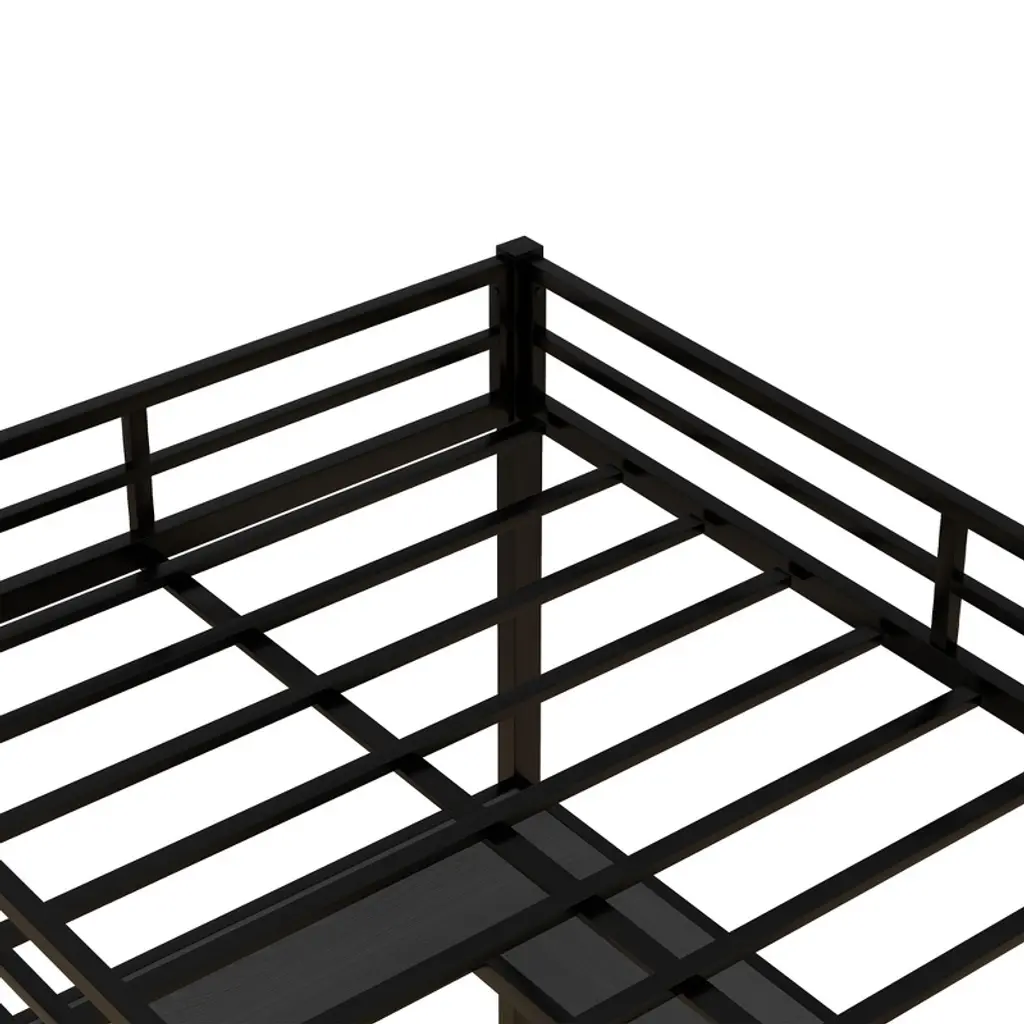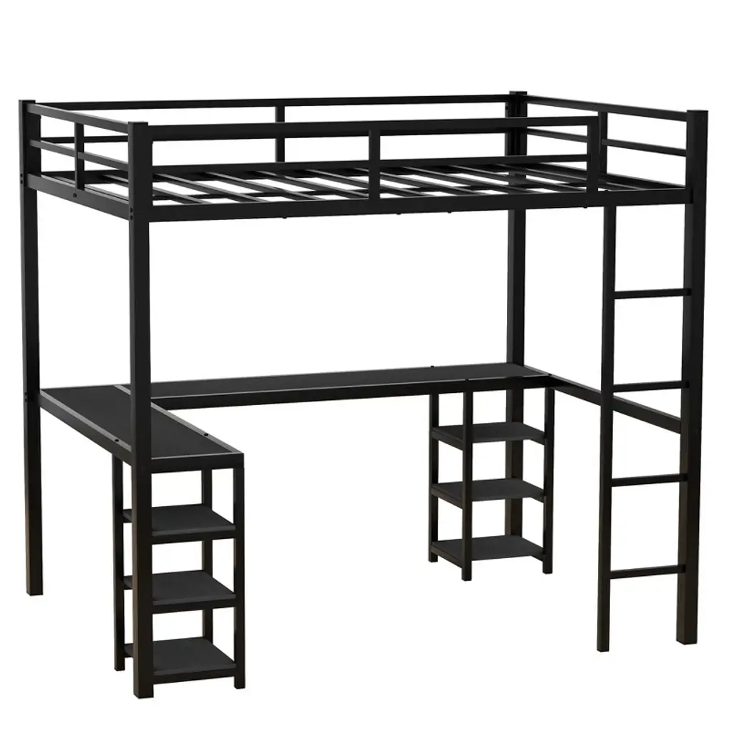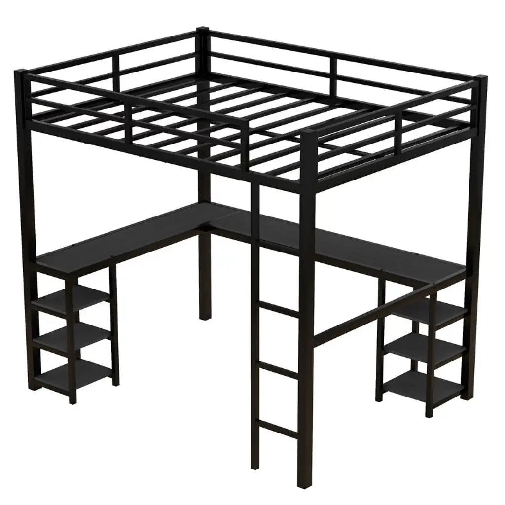 This space-saving full loft bed with desk features an innovative L-shaped design that maximizes corner spaces while providing a functional study area. The bunk bed boasts a durable metal frame with full-length guardrails and a sturdy ladder for safe, easy access. Complete with built-in shelves and a spacious desktop, this loft bed with storage creates the perfect sleep-study solution for compact bedrooms.